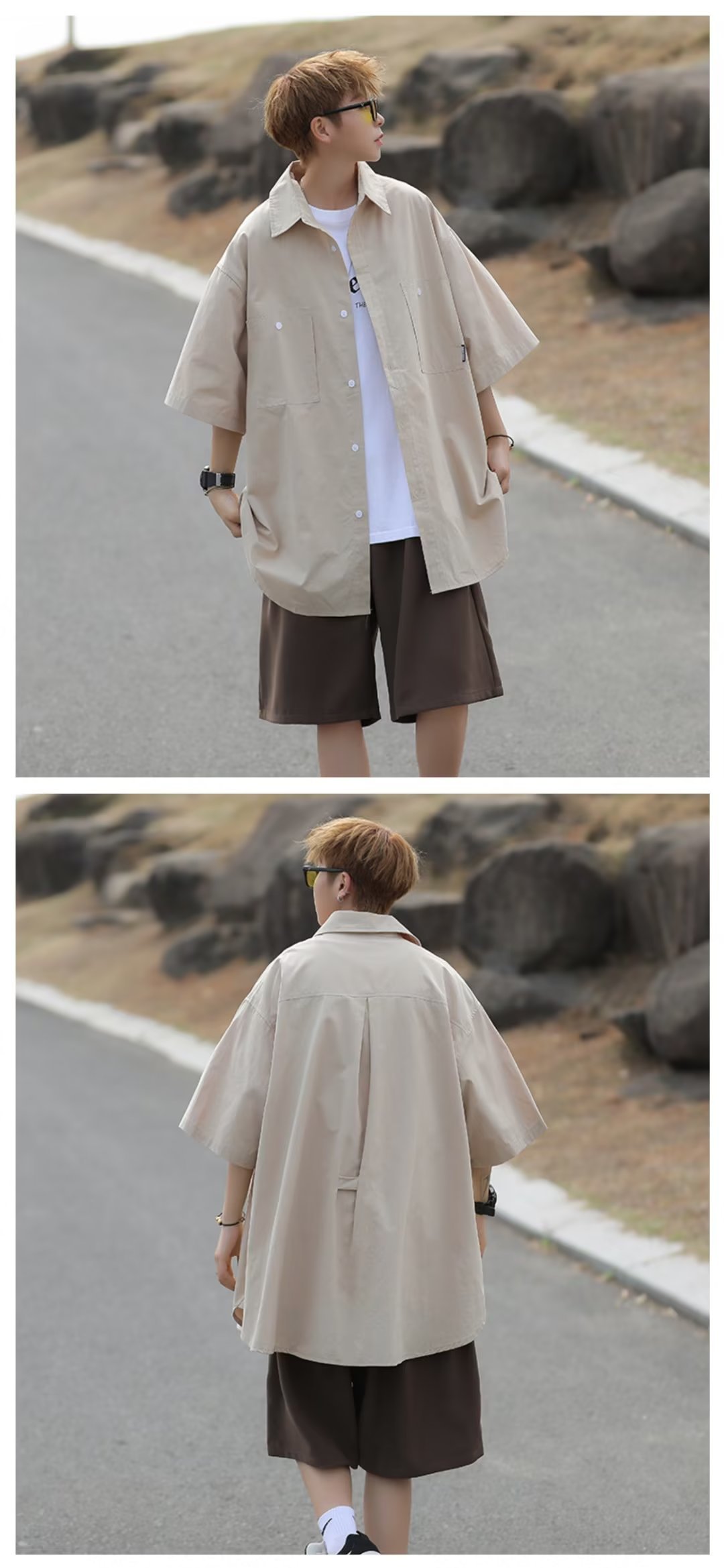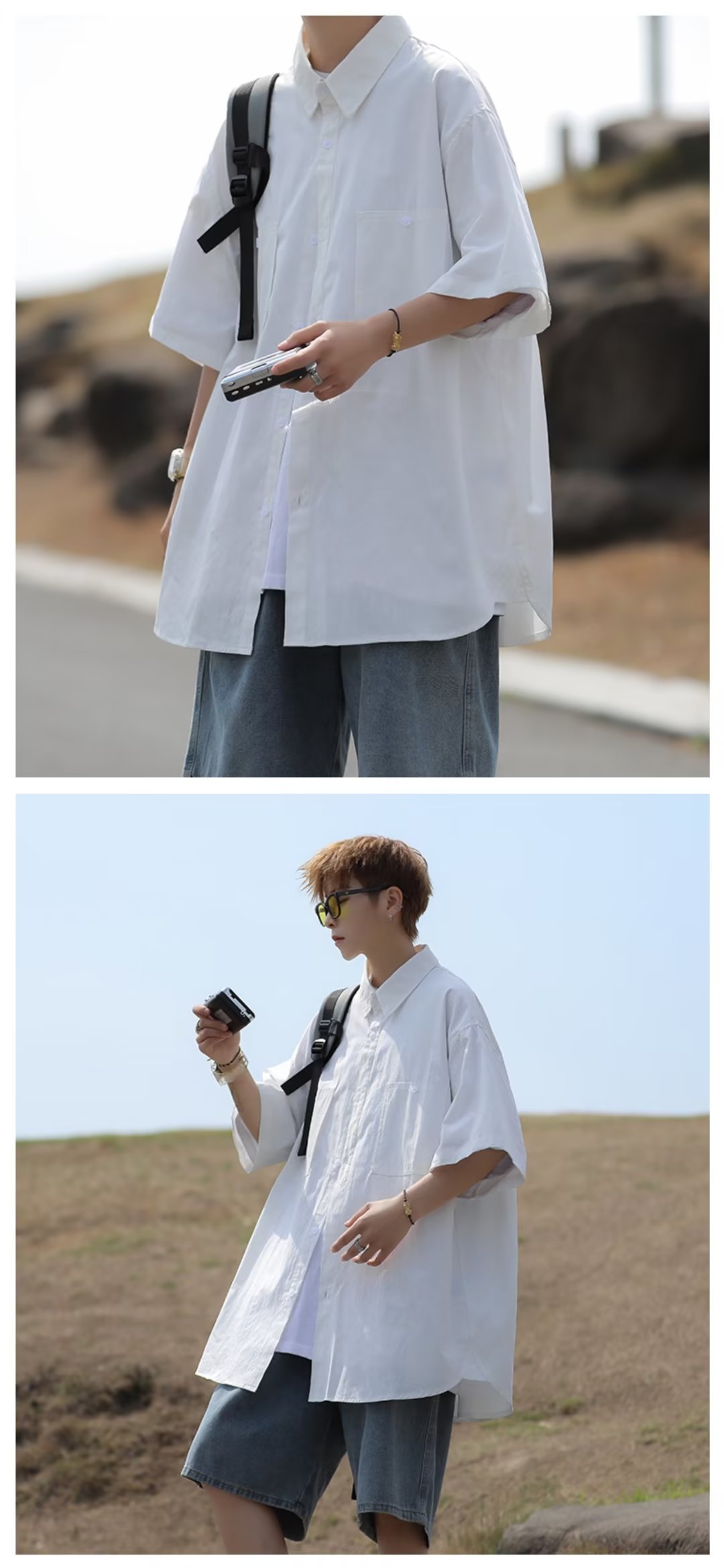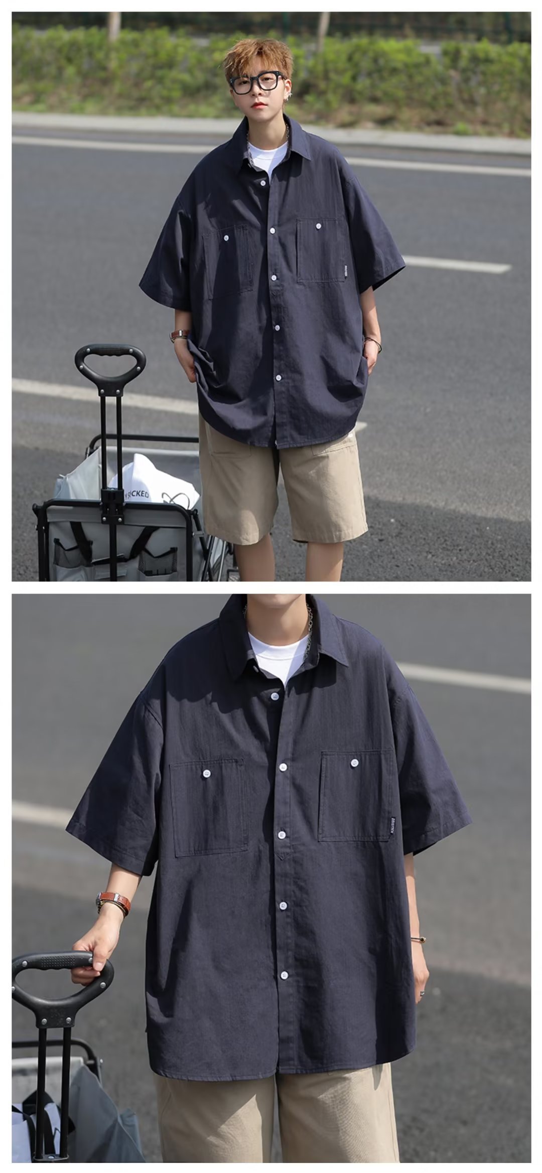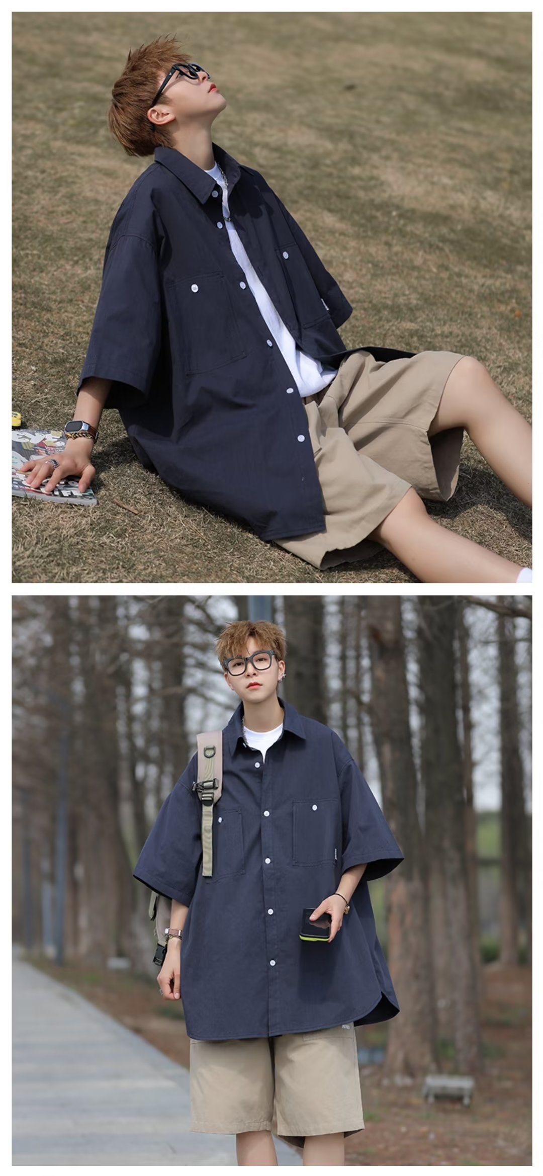 소년 여름 캐주얼 패션 솔리드 컬러 올 매치 반팔 셔츠 느슨한 옷깃 반소매 셔츠 청소년 트렌디 탑