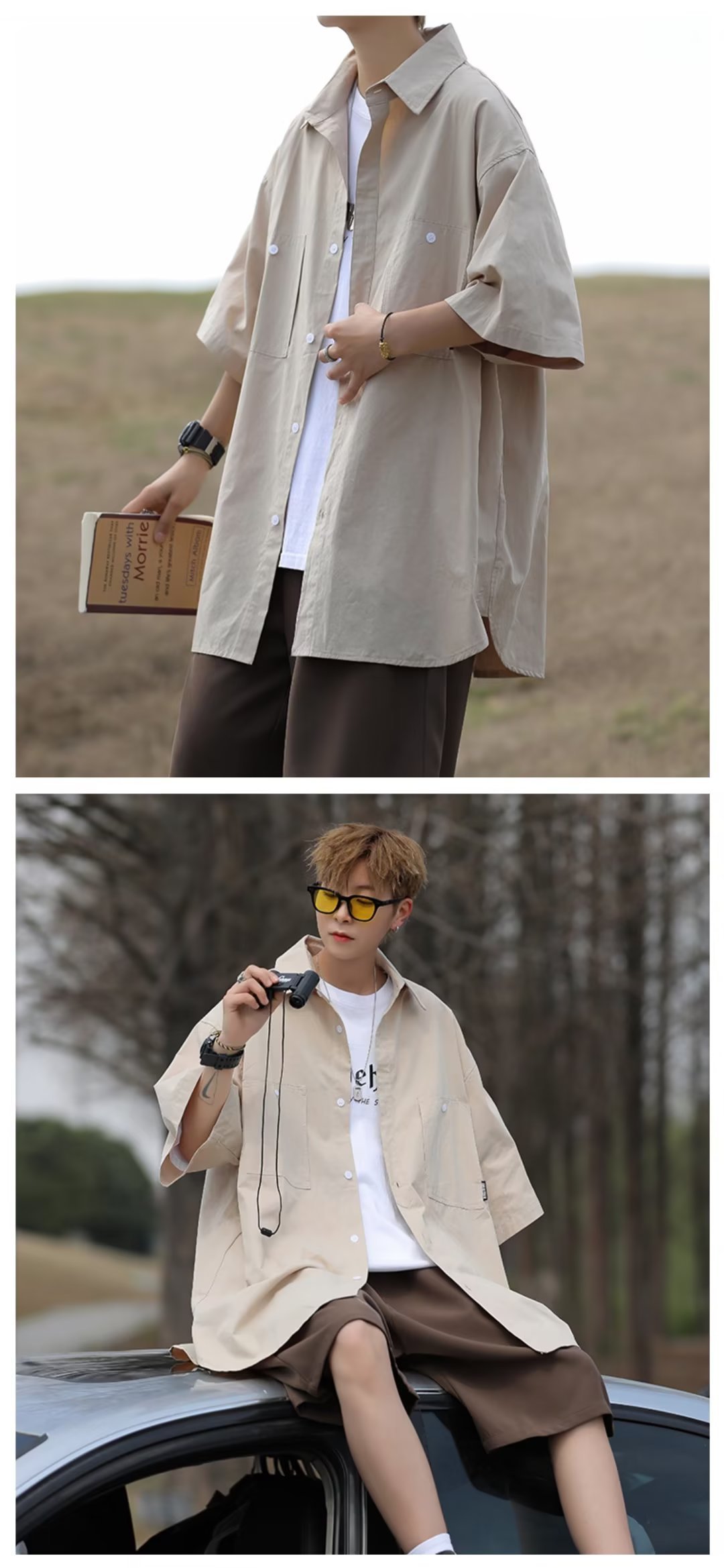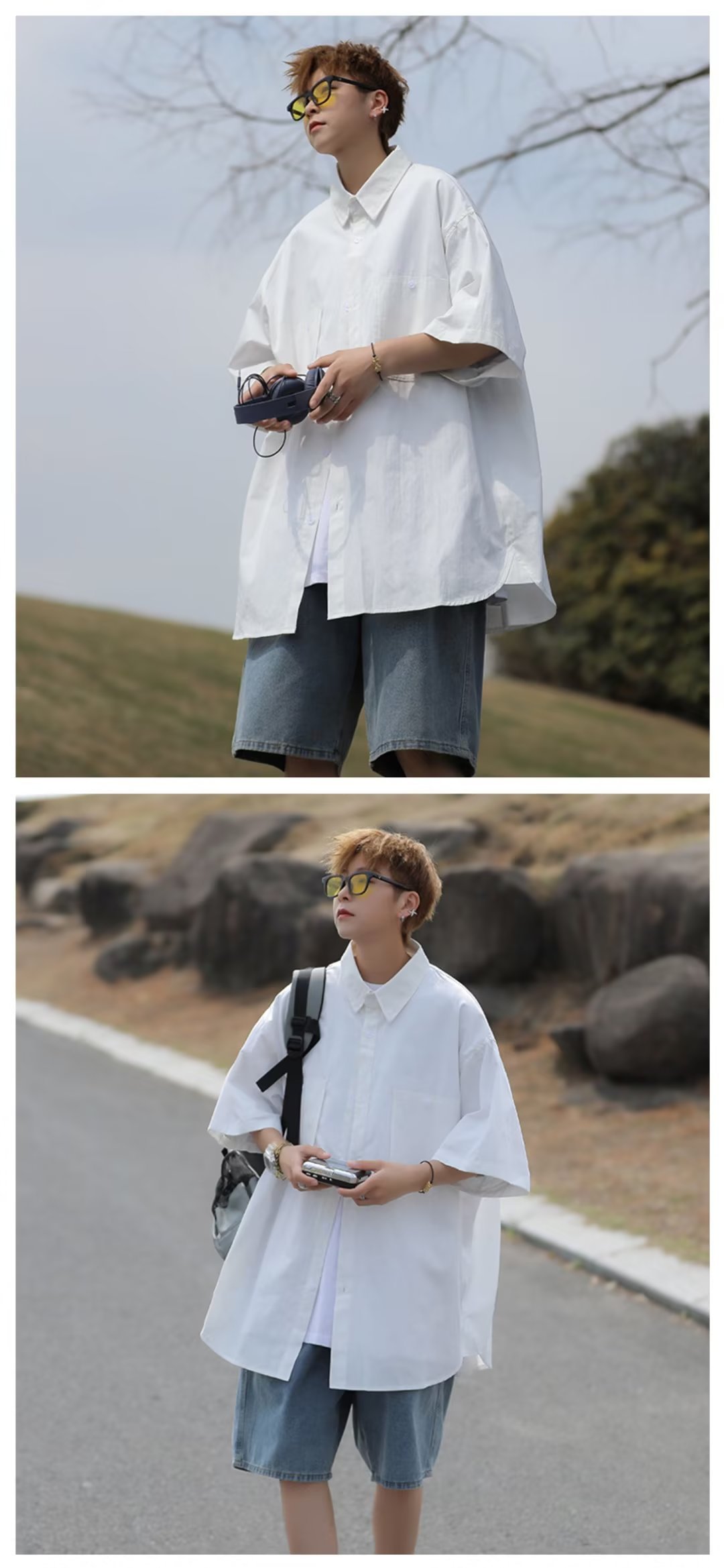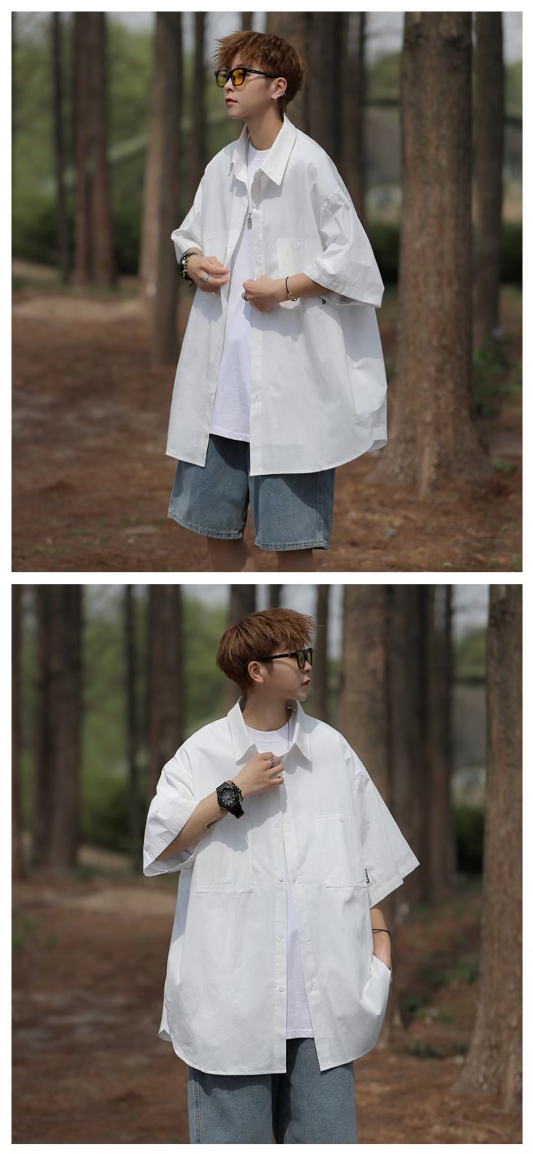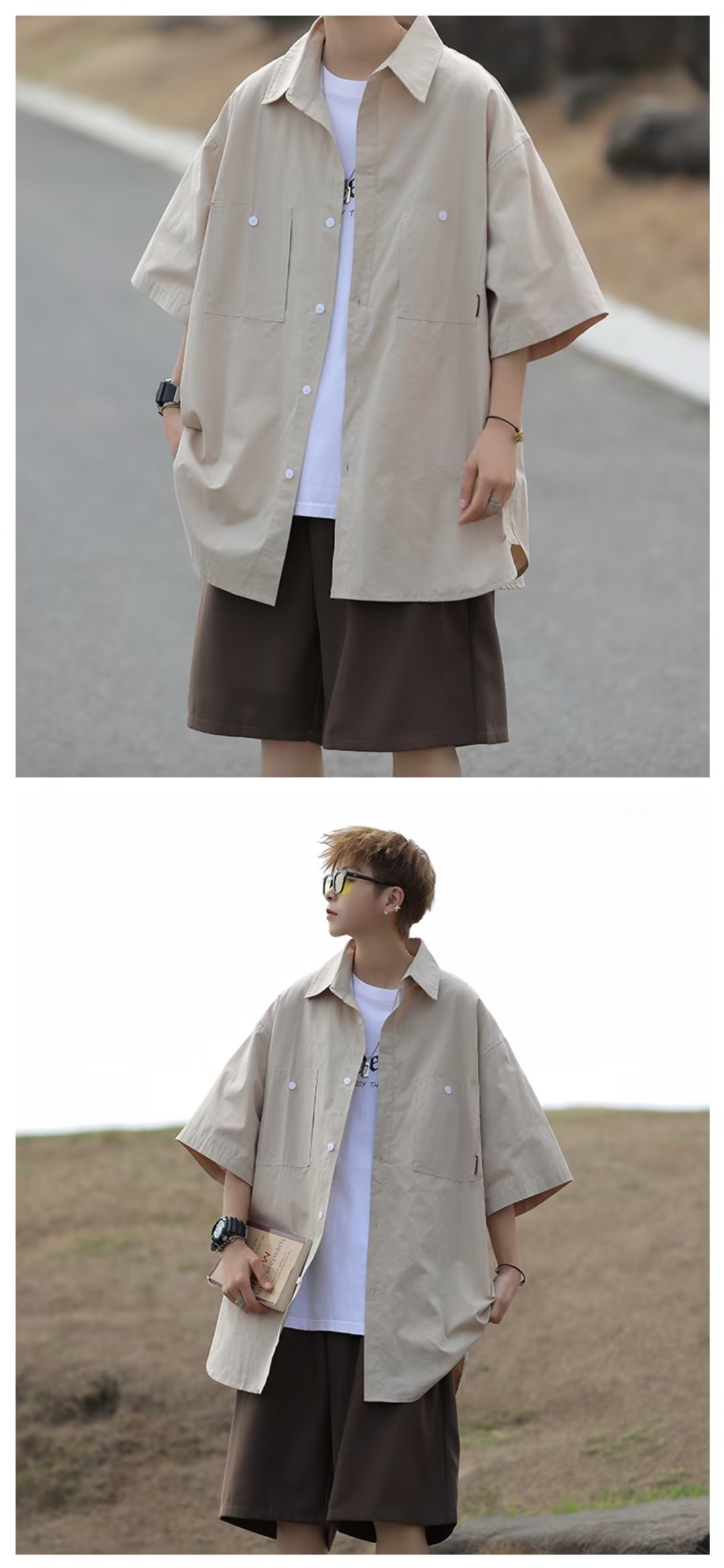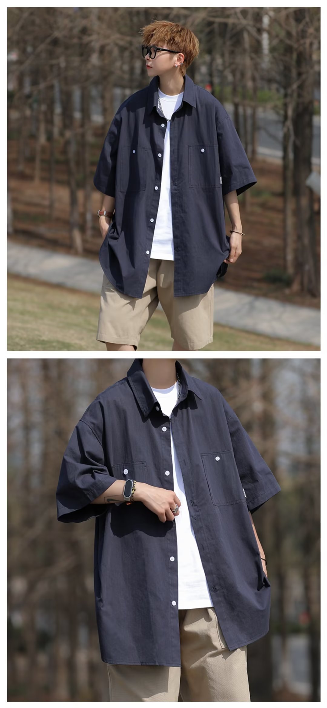 소년 여름 캐주얼 패션 솔리드 컬러 올 매치 반팔 셔츠 느슨한 옷깃 반소매 셔츠 청소년 트렌디 탑