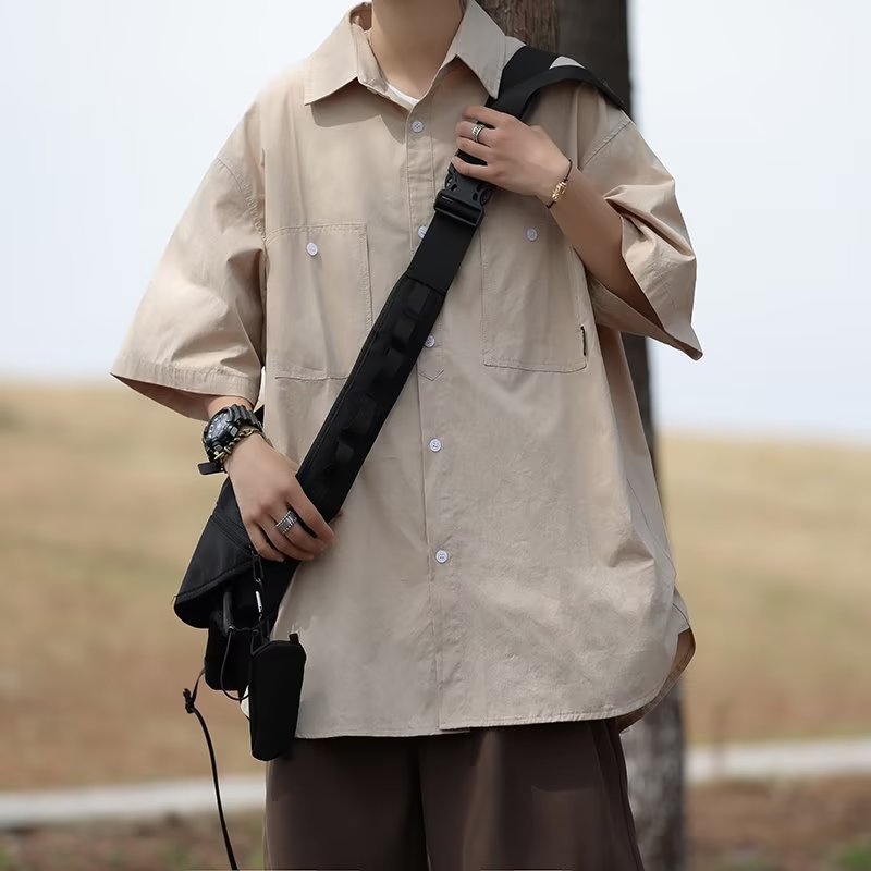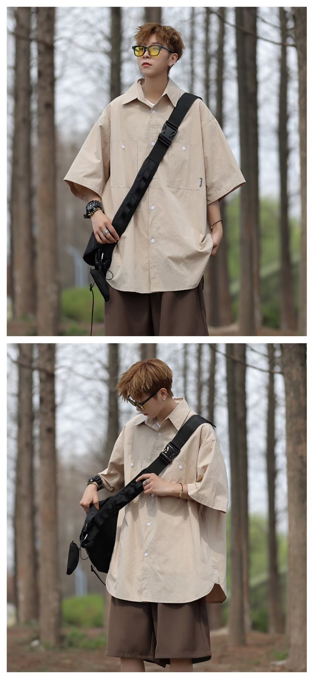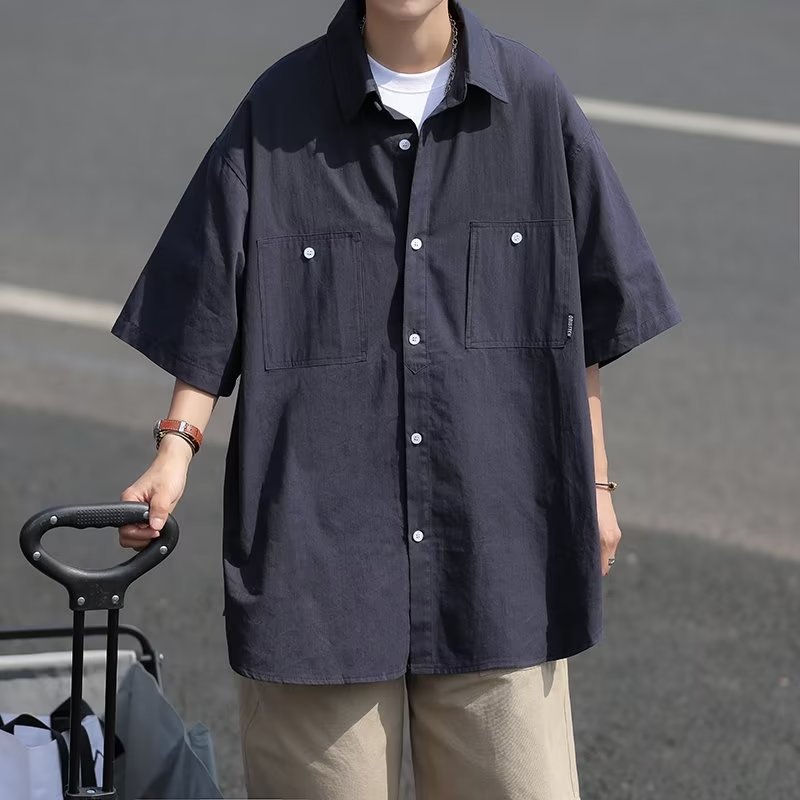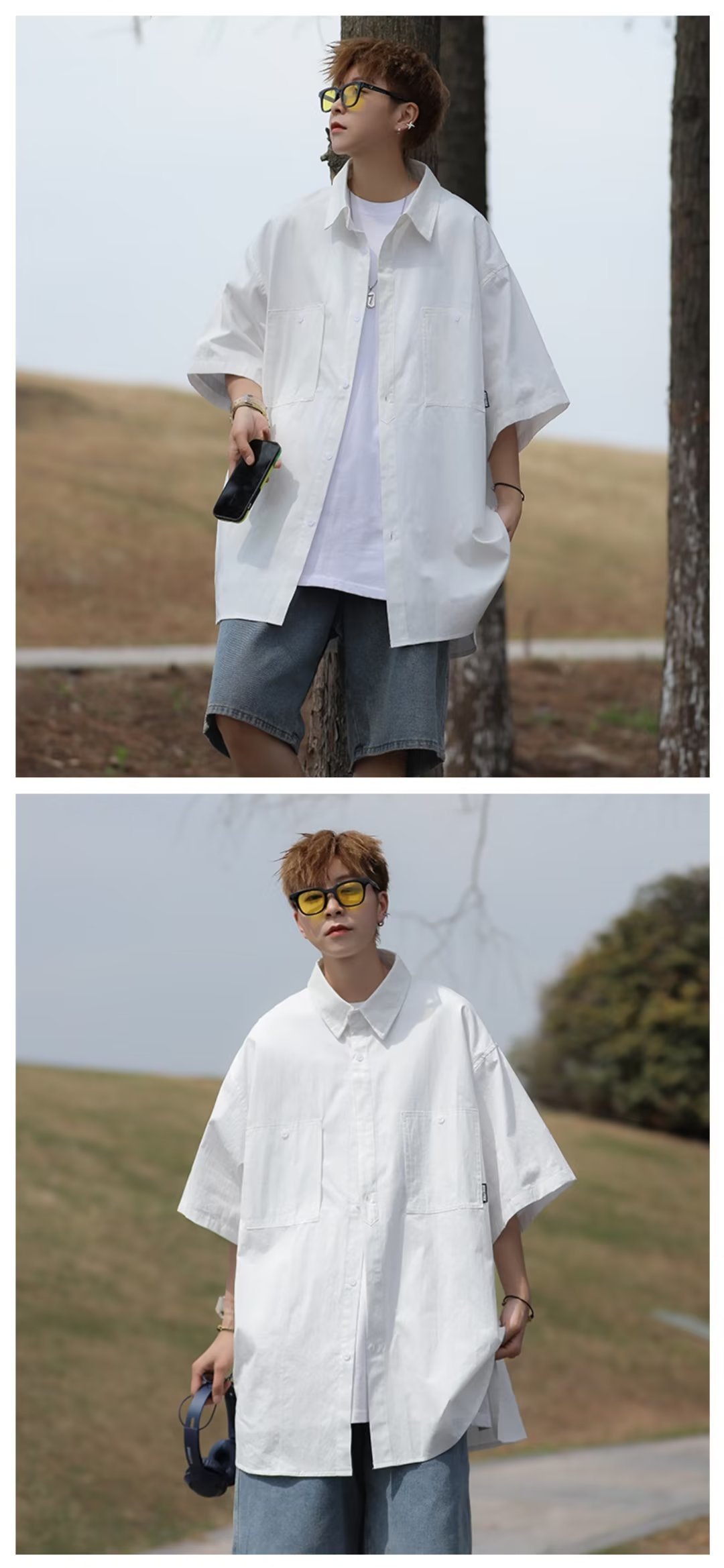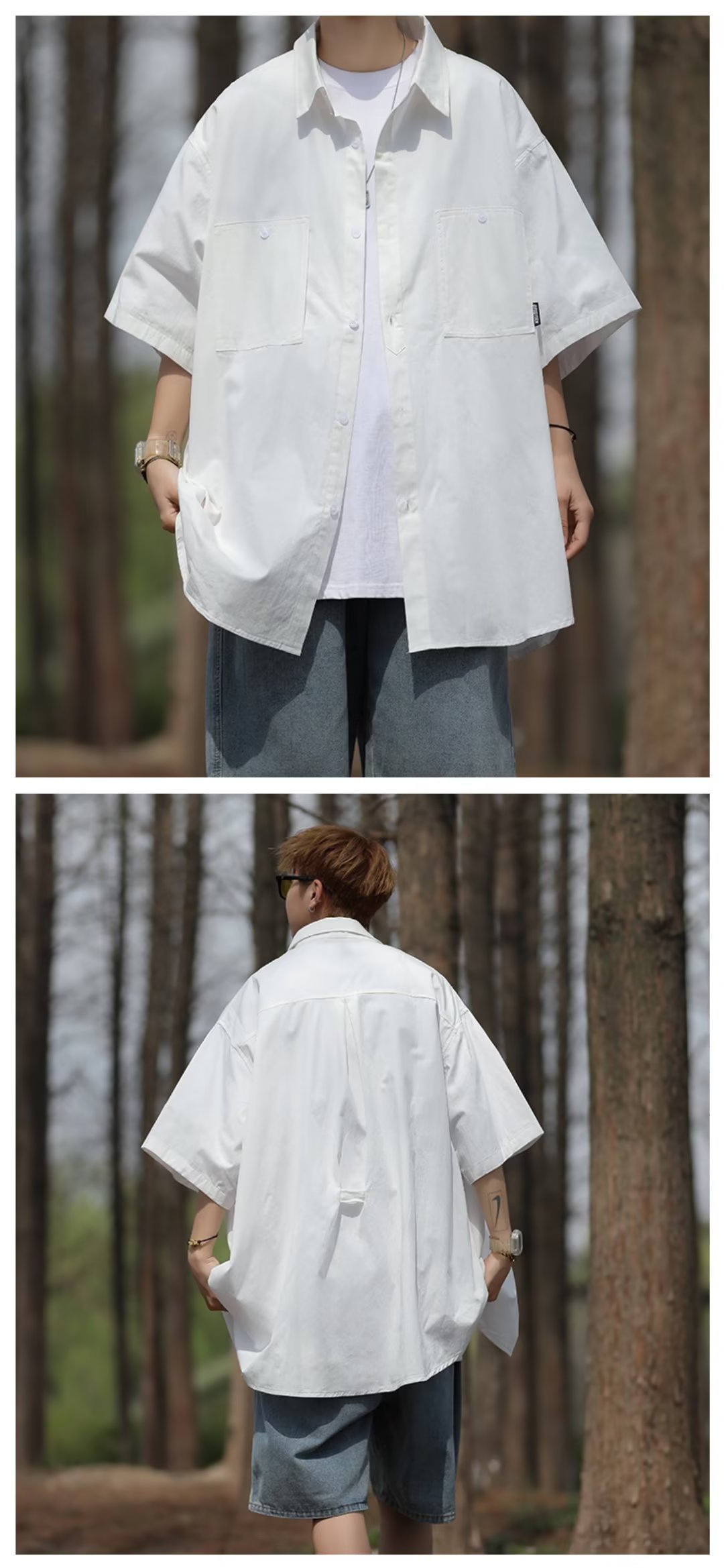 소년 여름 캐주얼 패션 솔리드 컬러 올 매치 반팔 셔츠 느슨한 옷깃 반소매 셔츠 청소년 트렌디 탑