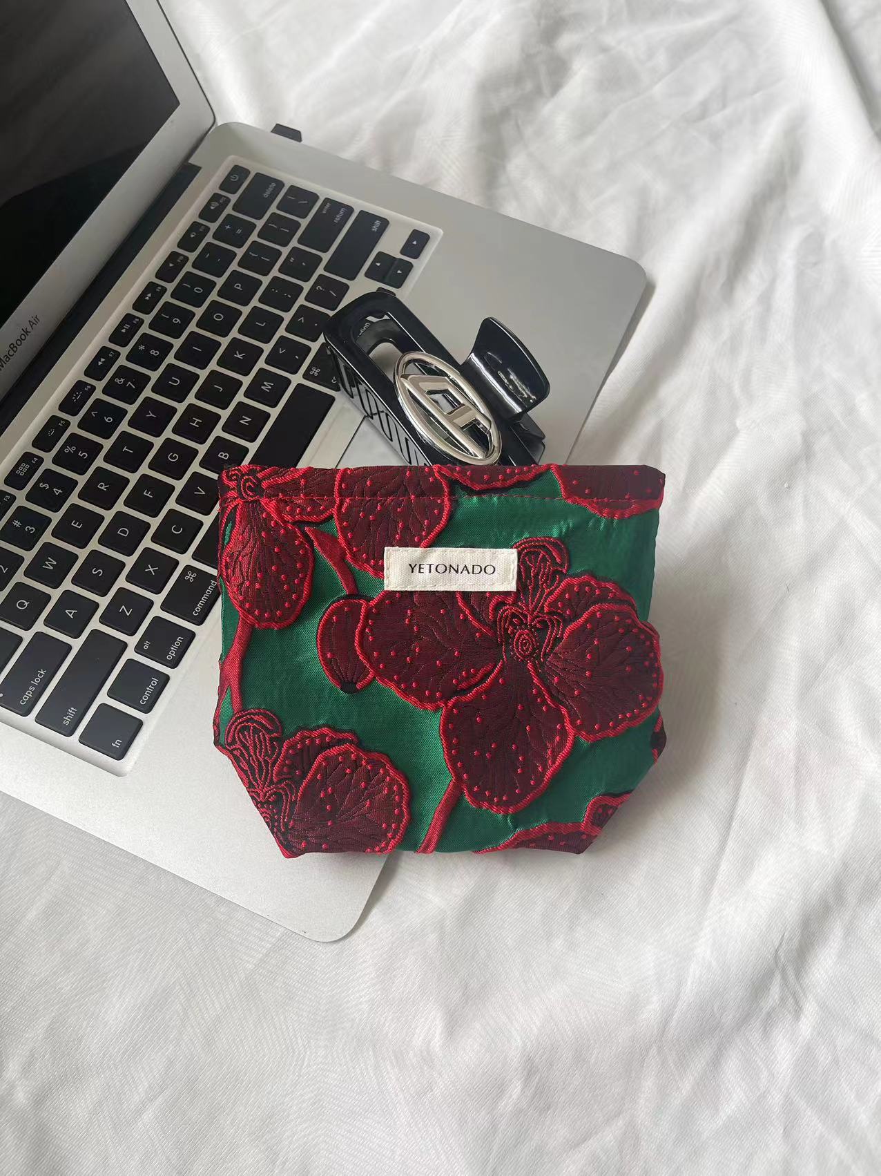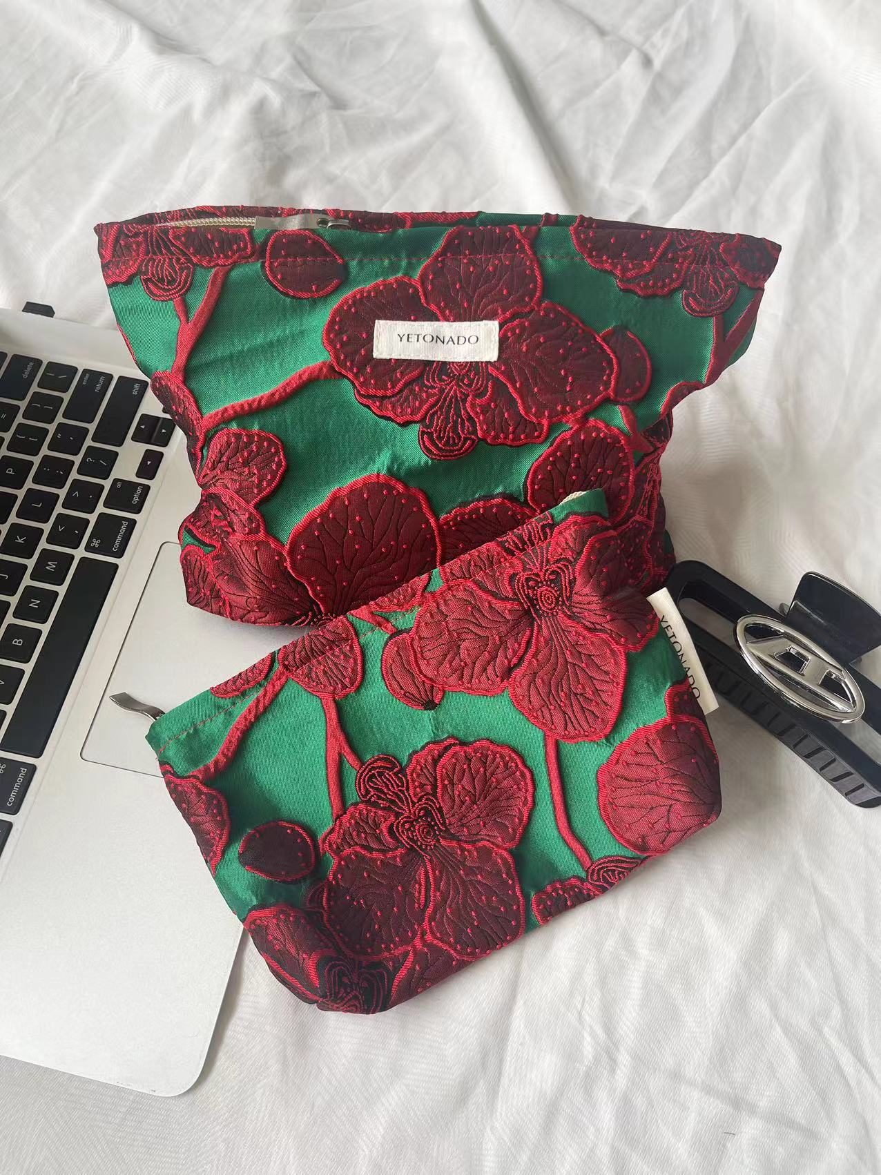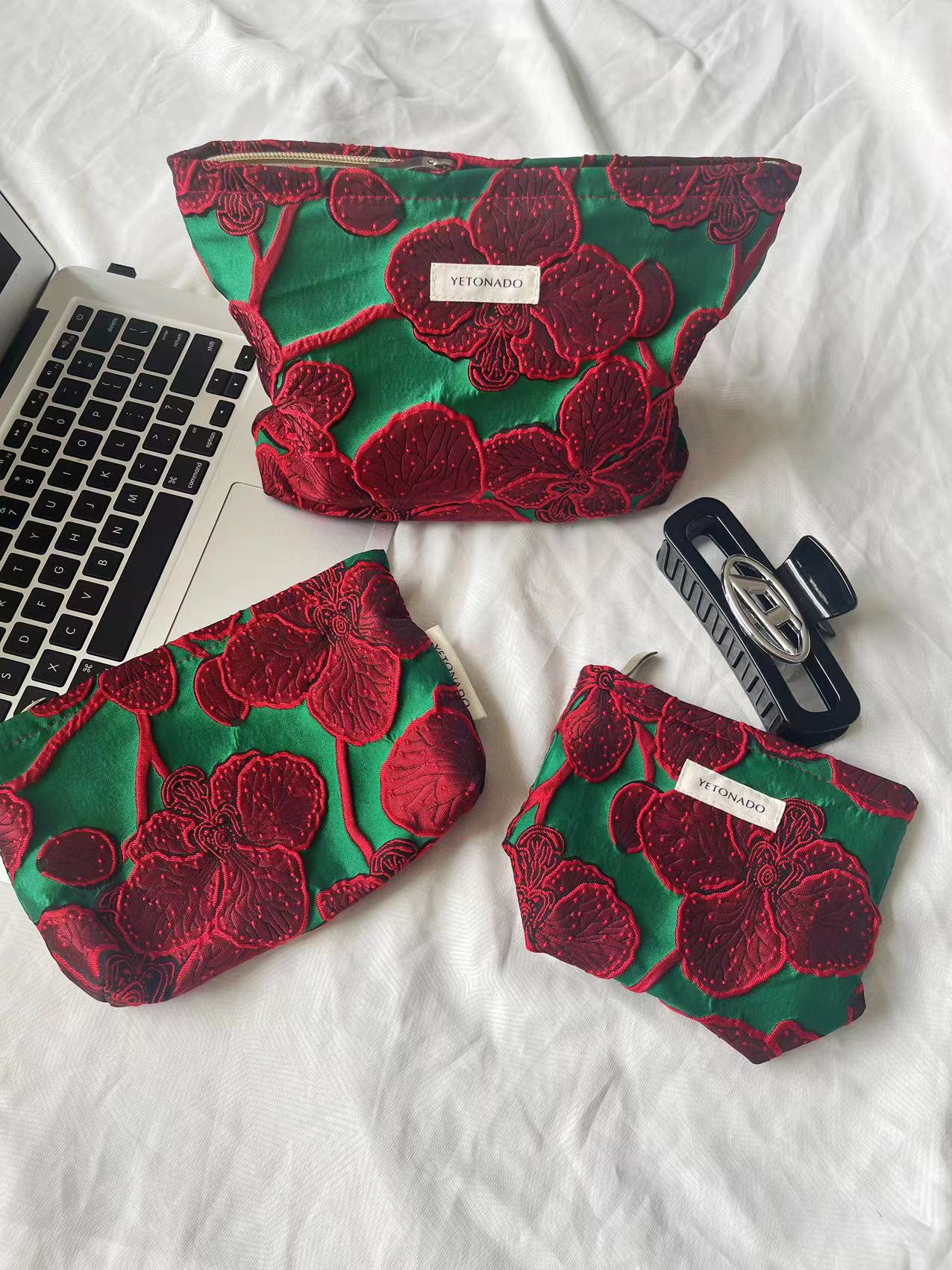 하이 엔드 우아한 레트로 그린 바닥 다크 레드 자카드 캔버스 대용량 화장품 가방 여성용 핸드 백 휴대용 보관