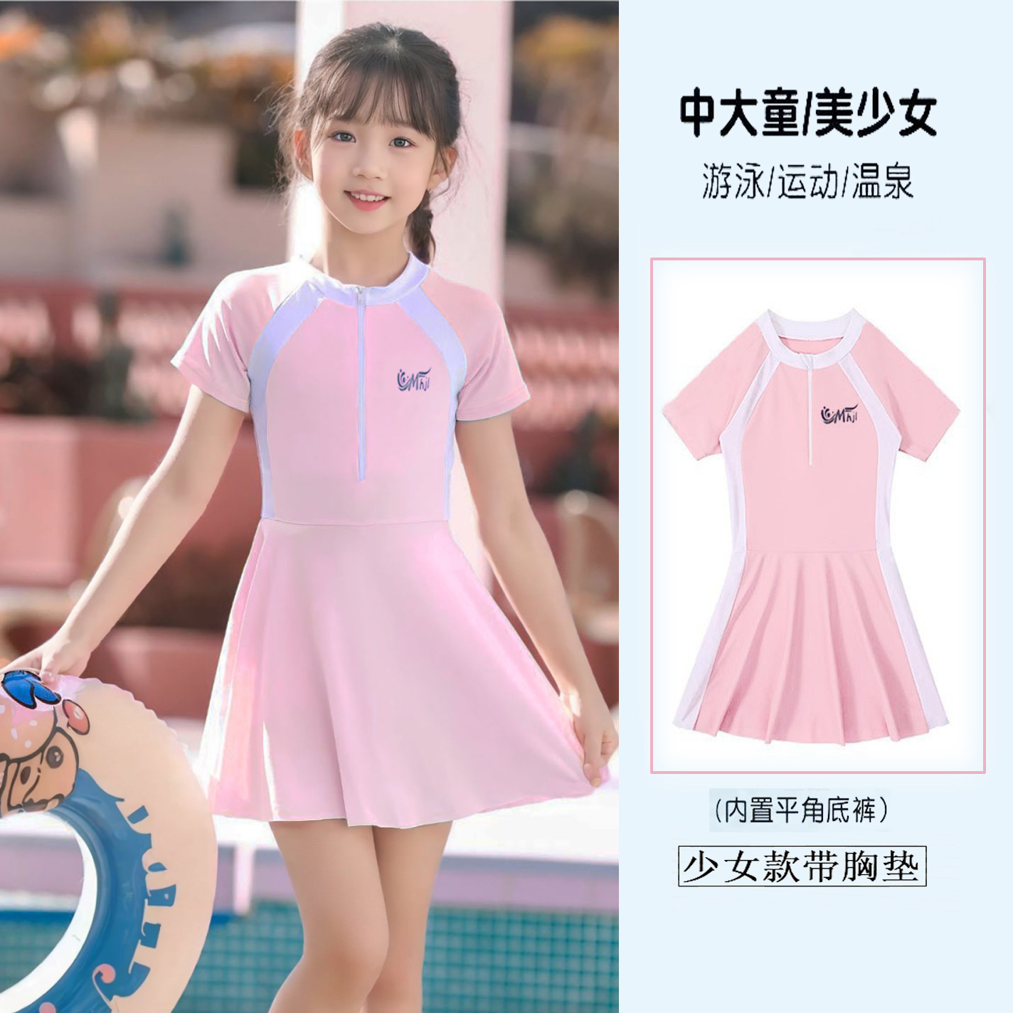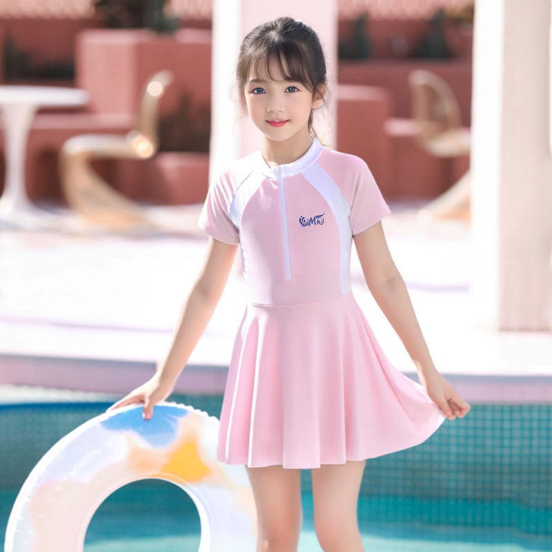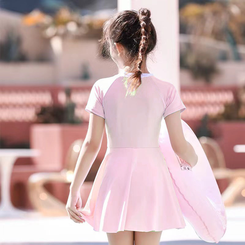 어린이 수영복 여자 원피스 스포츠 패션 컬러 매칭 한국 치마와 가슴 패드 수영복 전문 도매