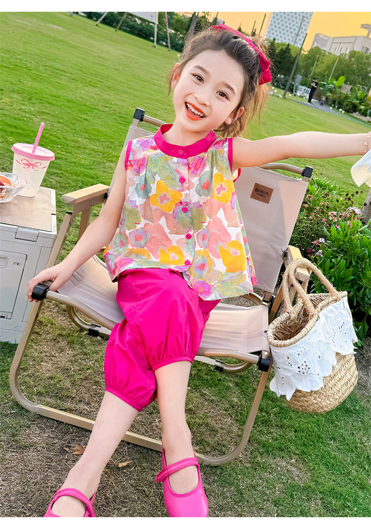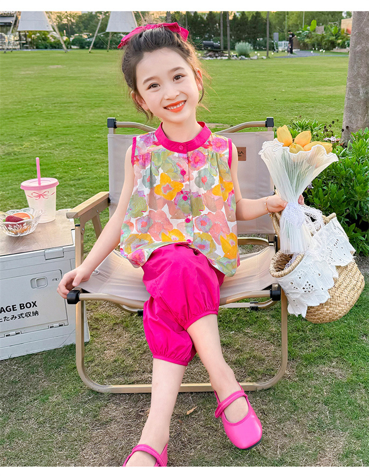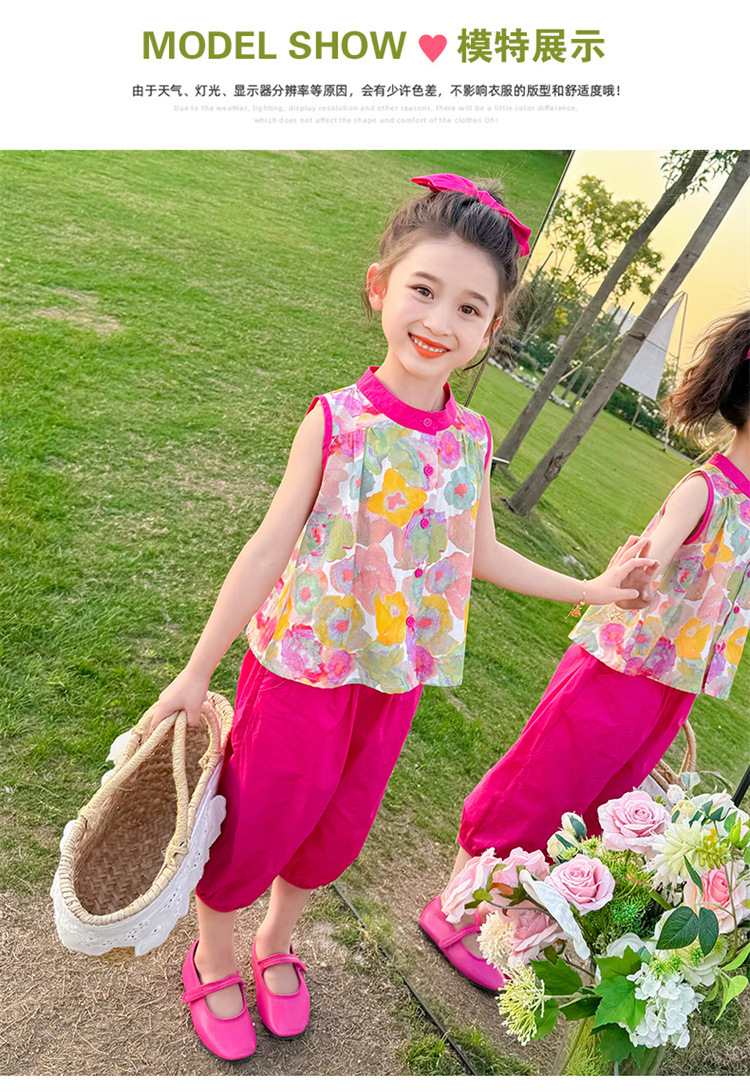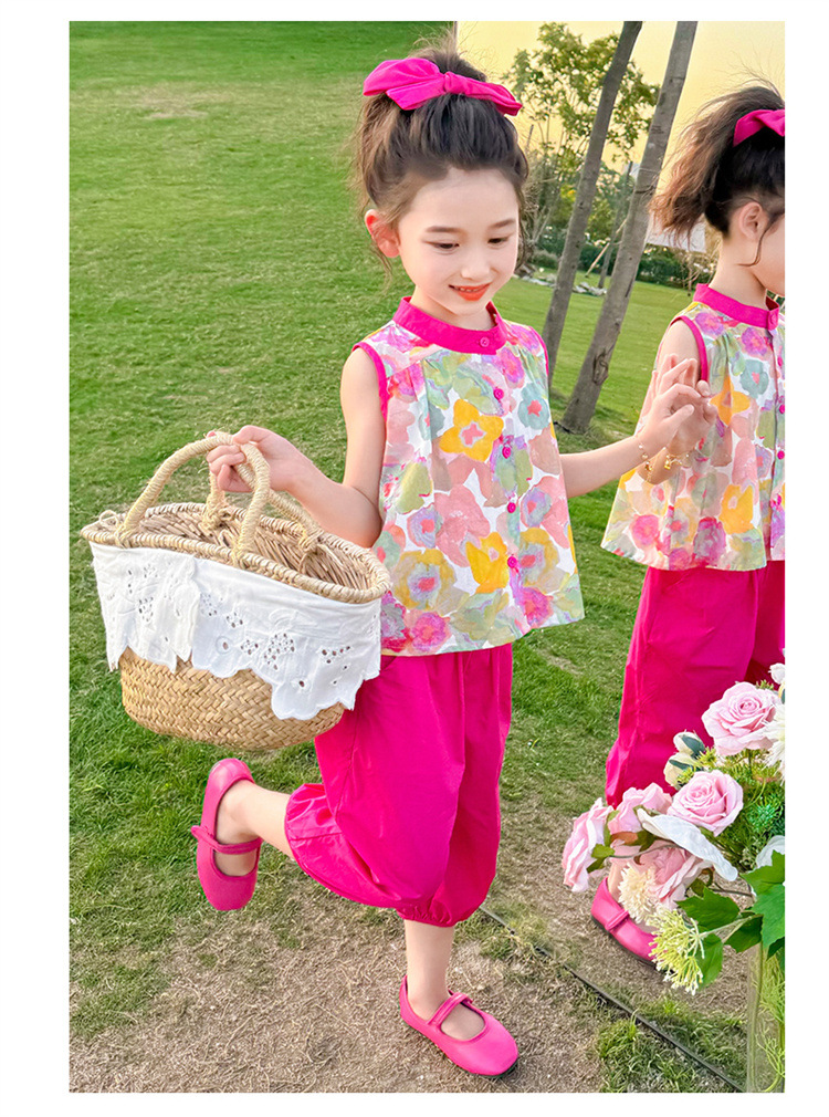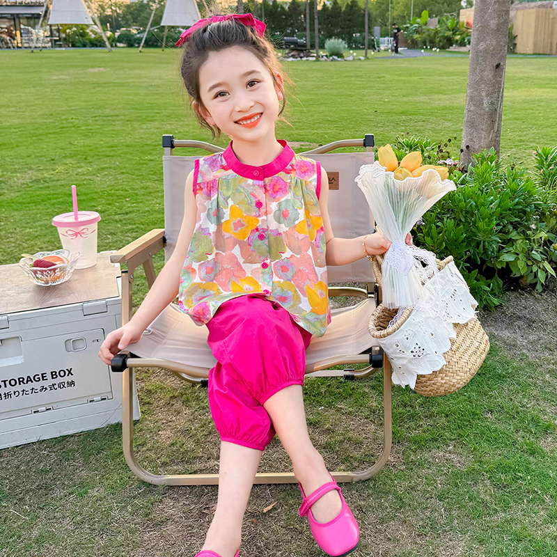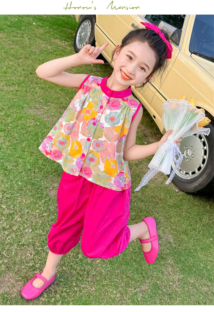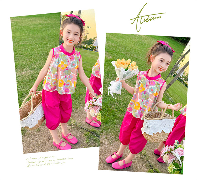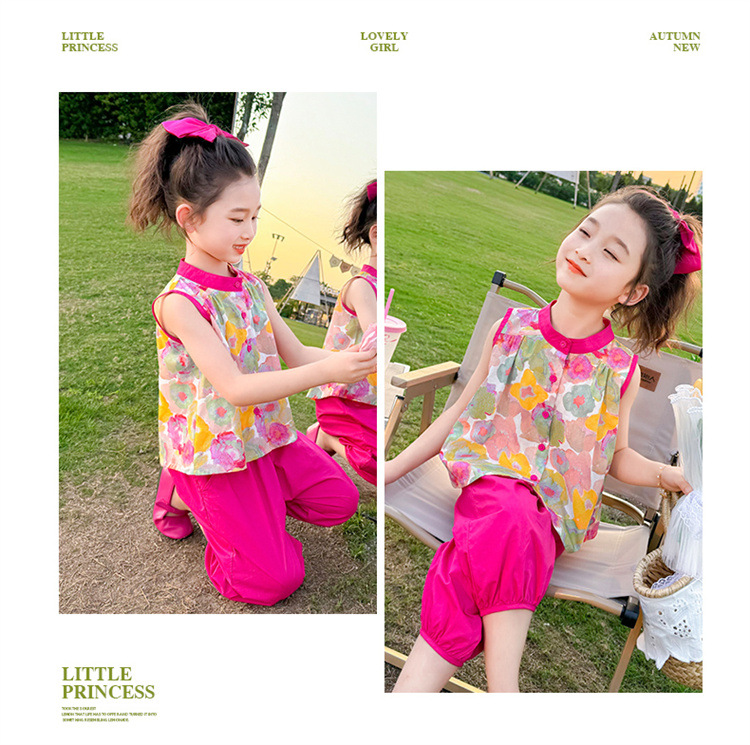 소녀의 여름 세트 2024 새로운 패션 어린 소녀의 민소매 꽃 자른 바지 세트 어린이 투피스 세트