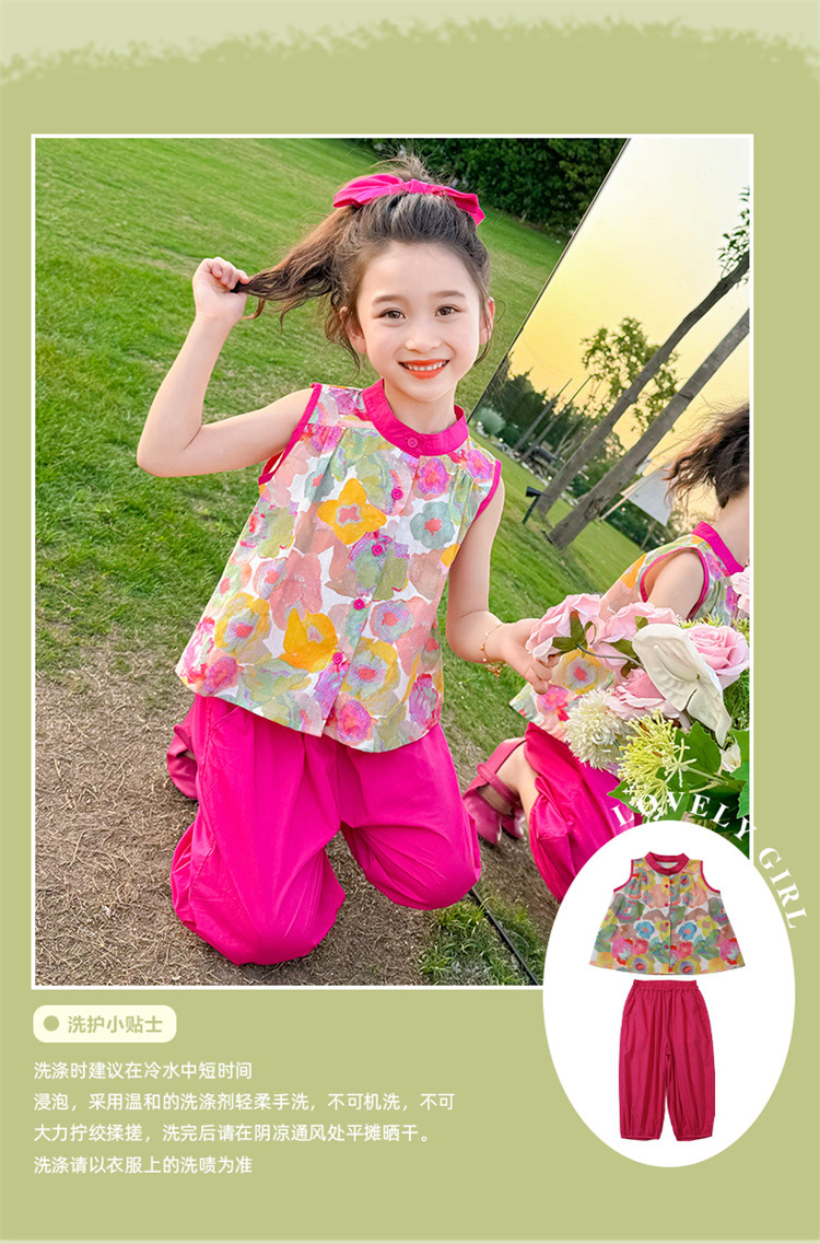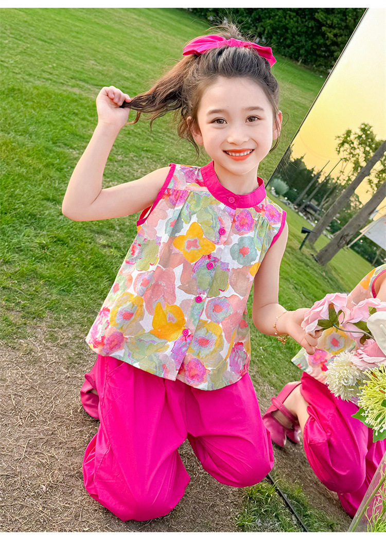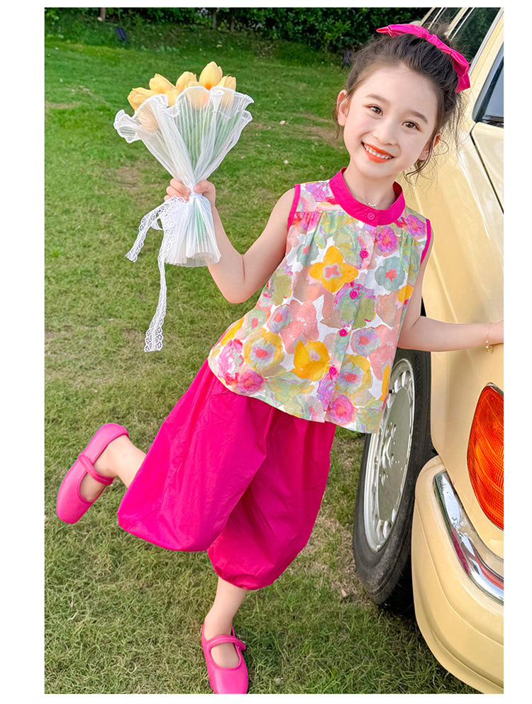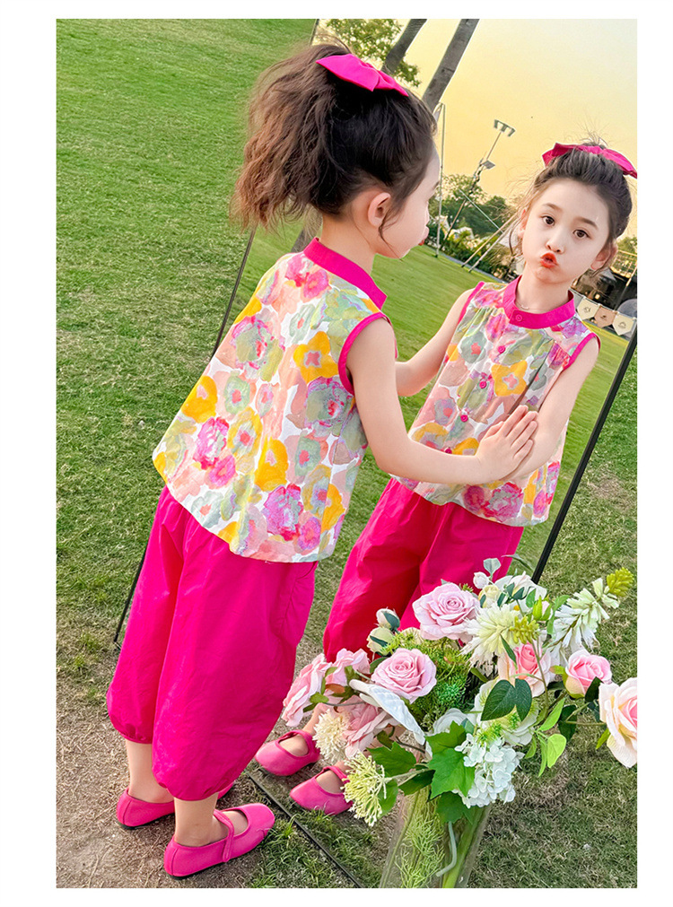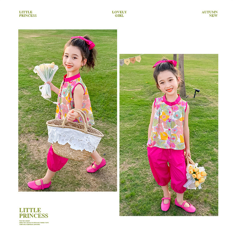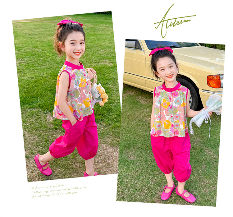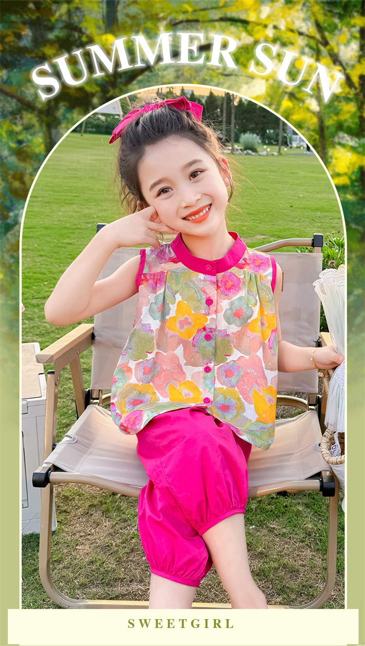 소녀의 여름 세트 2024 새로운 패션 어린 소녀의 민소매 꽃 자른 바지 세트 어린이 투피스 세트