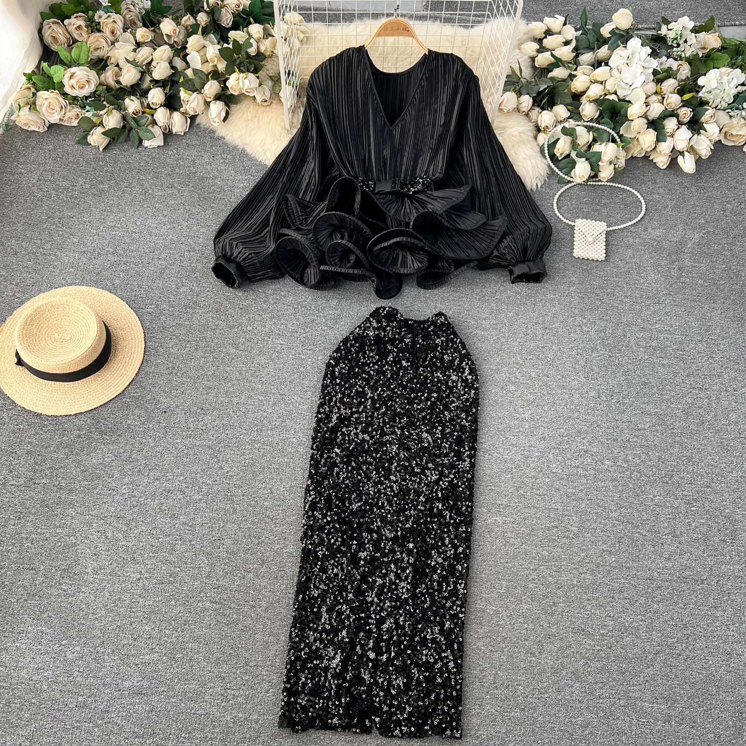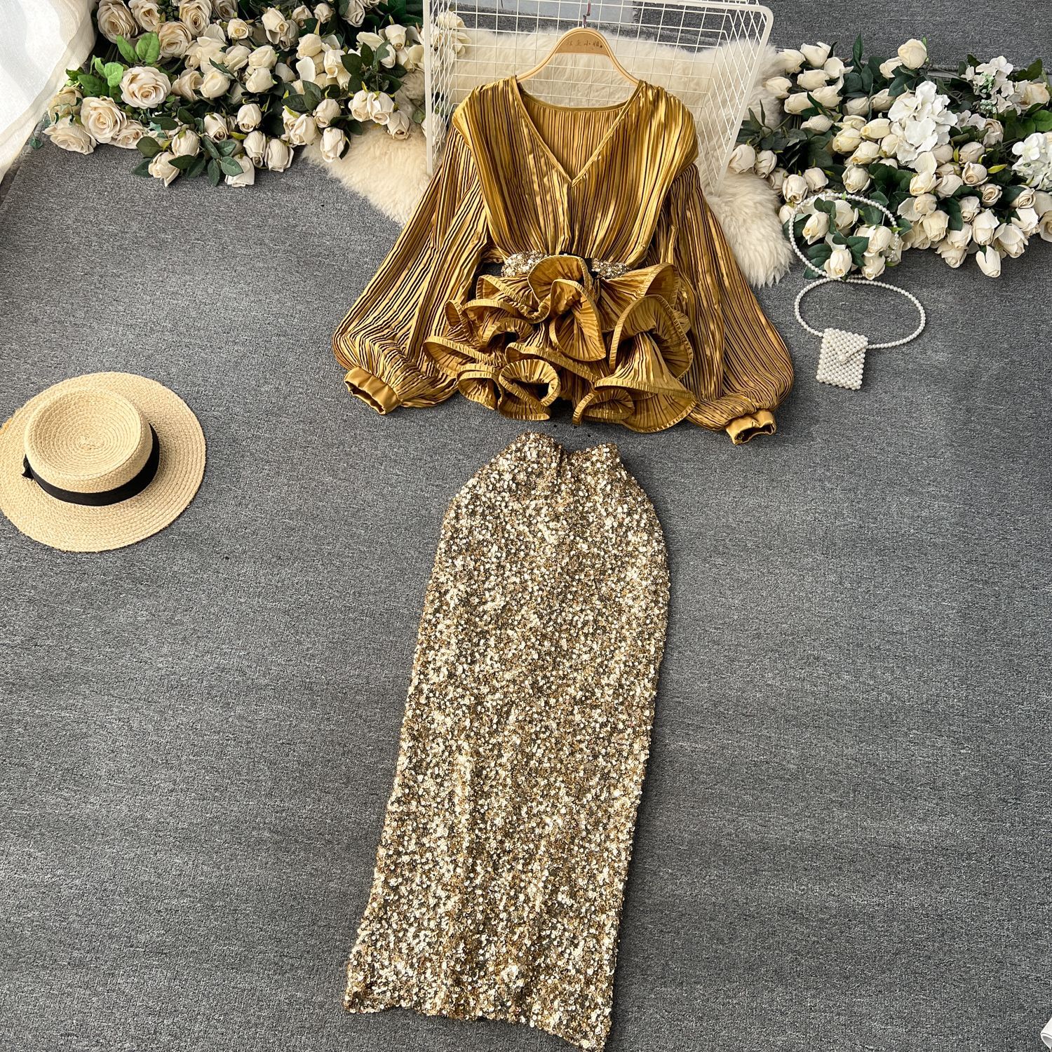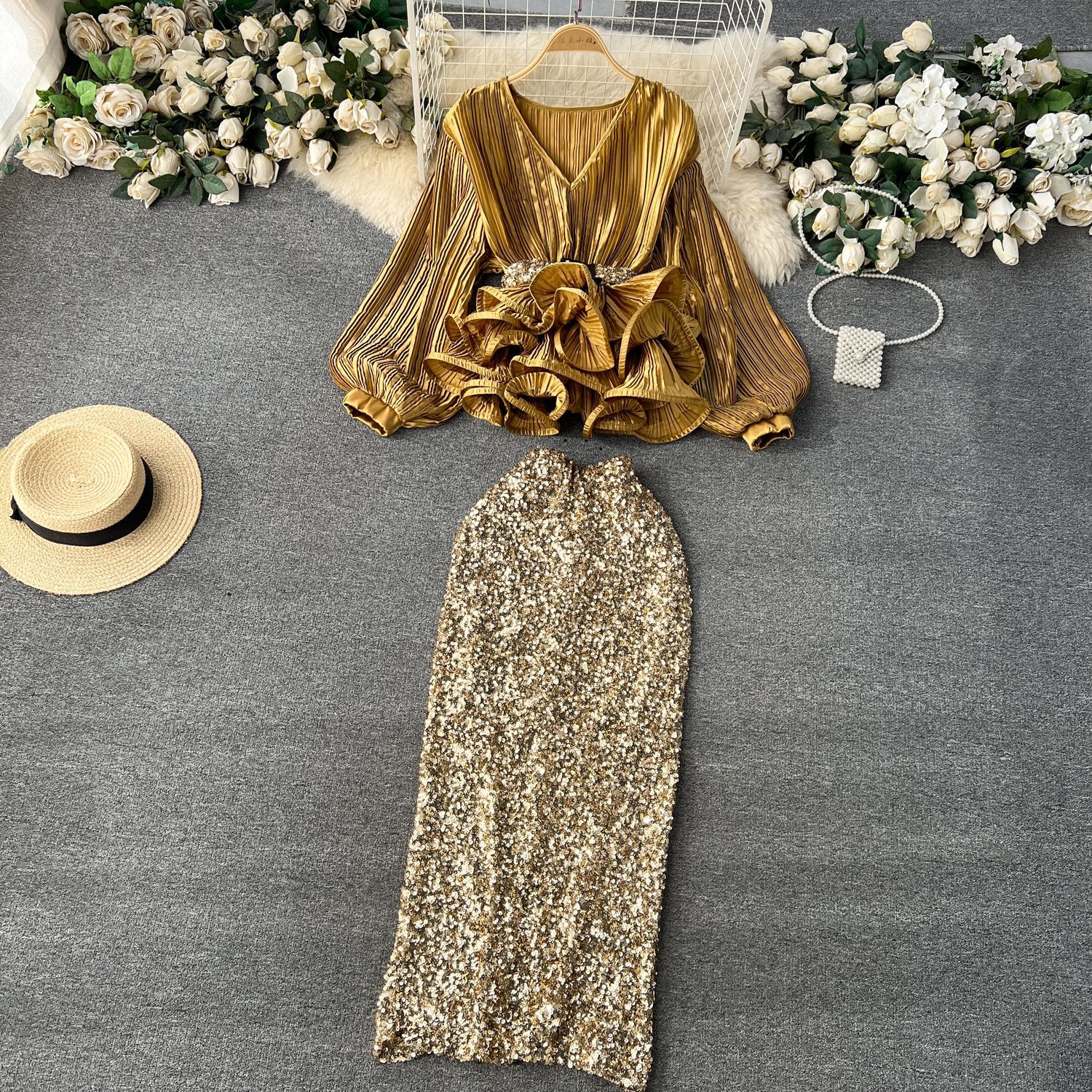 Yujie 하이 엔드 웨스턴 스타일 세트 여성 패션 사교계 타이트 웨이스트 러플 주름 탑 하이 웨이스트 스퀸 스커트