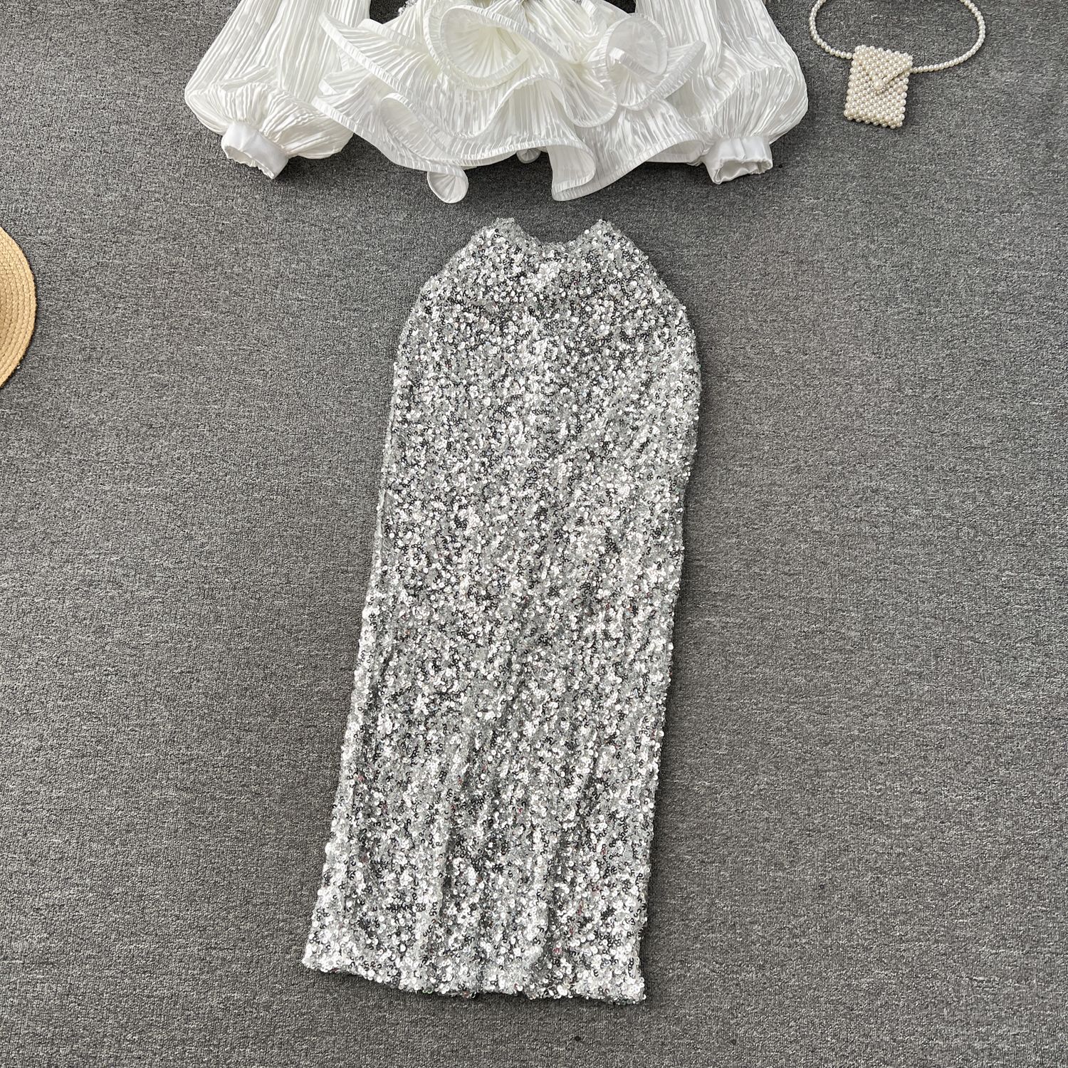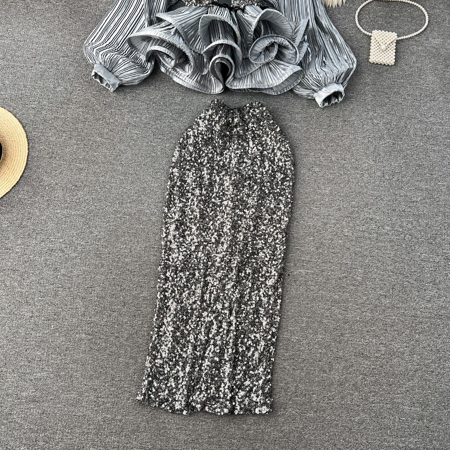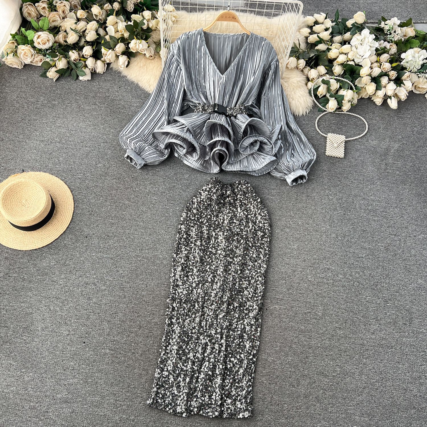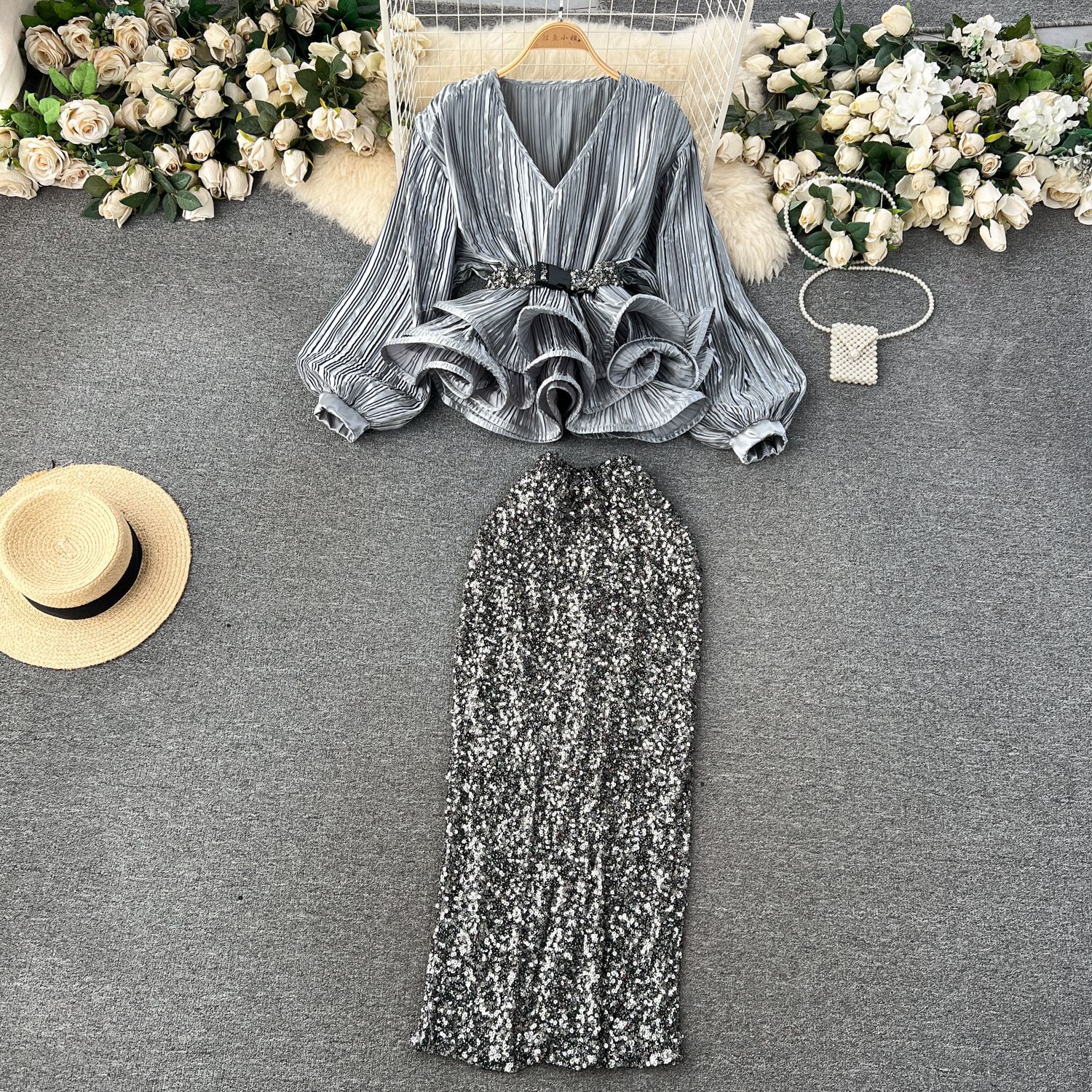 Yujie 하이 엔드 웨스턴 스타일 세트 여성 패션 사교계 타이트 웨이스트 러플 주름 탑 하이 웨이스트 스퀸 스커트