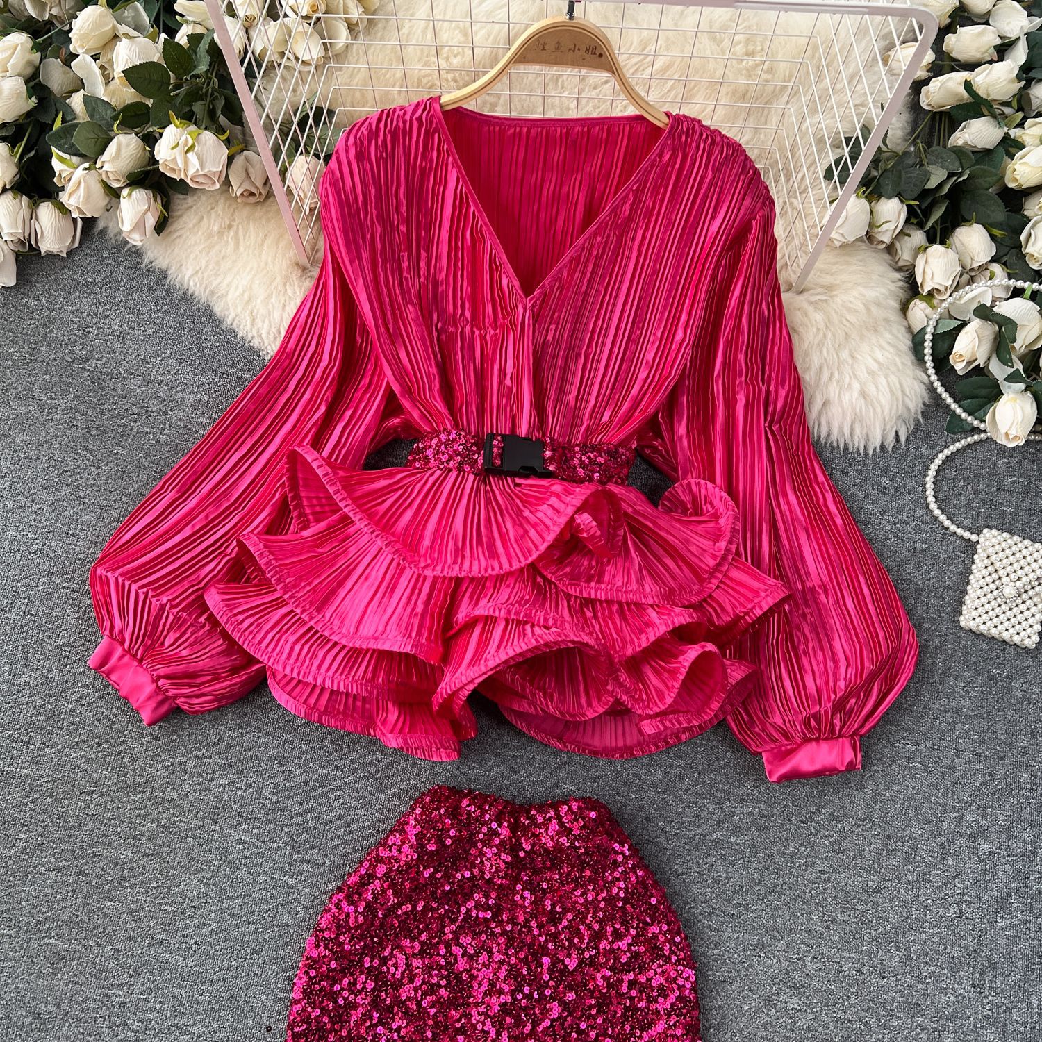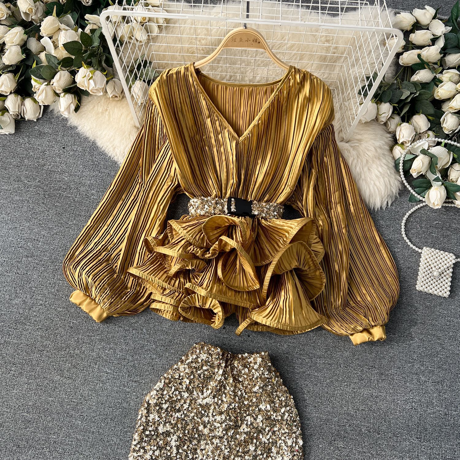 Yujie 하이 엔드 웨스턴 스타일 세트 여성 패션 사교계 타이트 웨이스트 러플 주름 탑 하이 웨이스트 스퀸 스커트스토어 가기