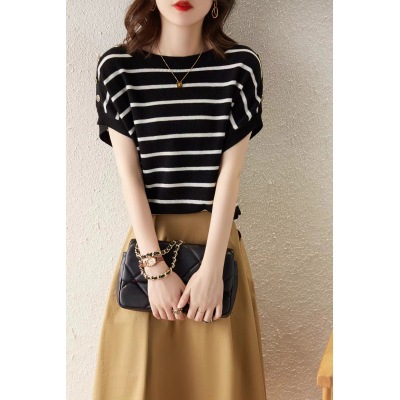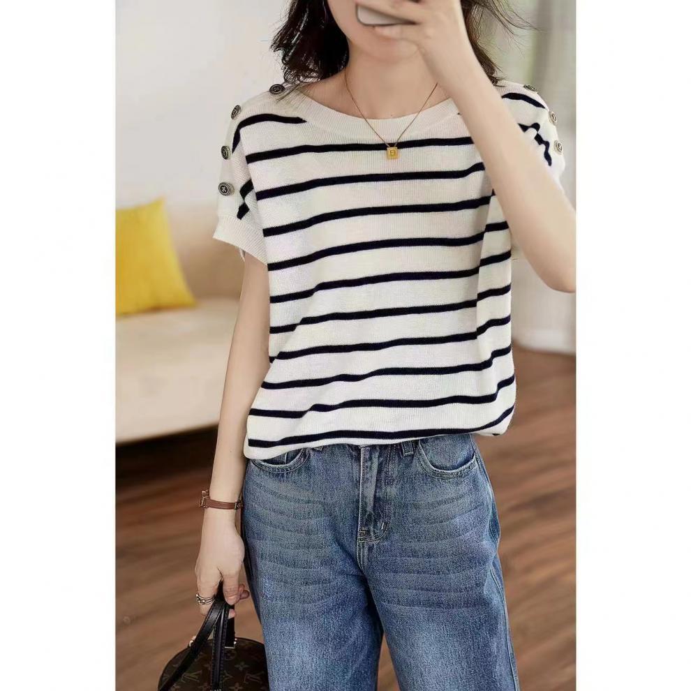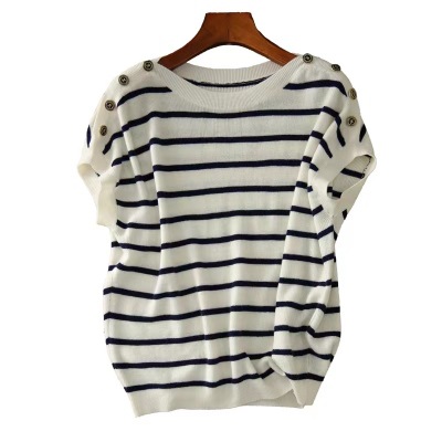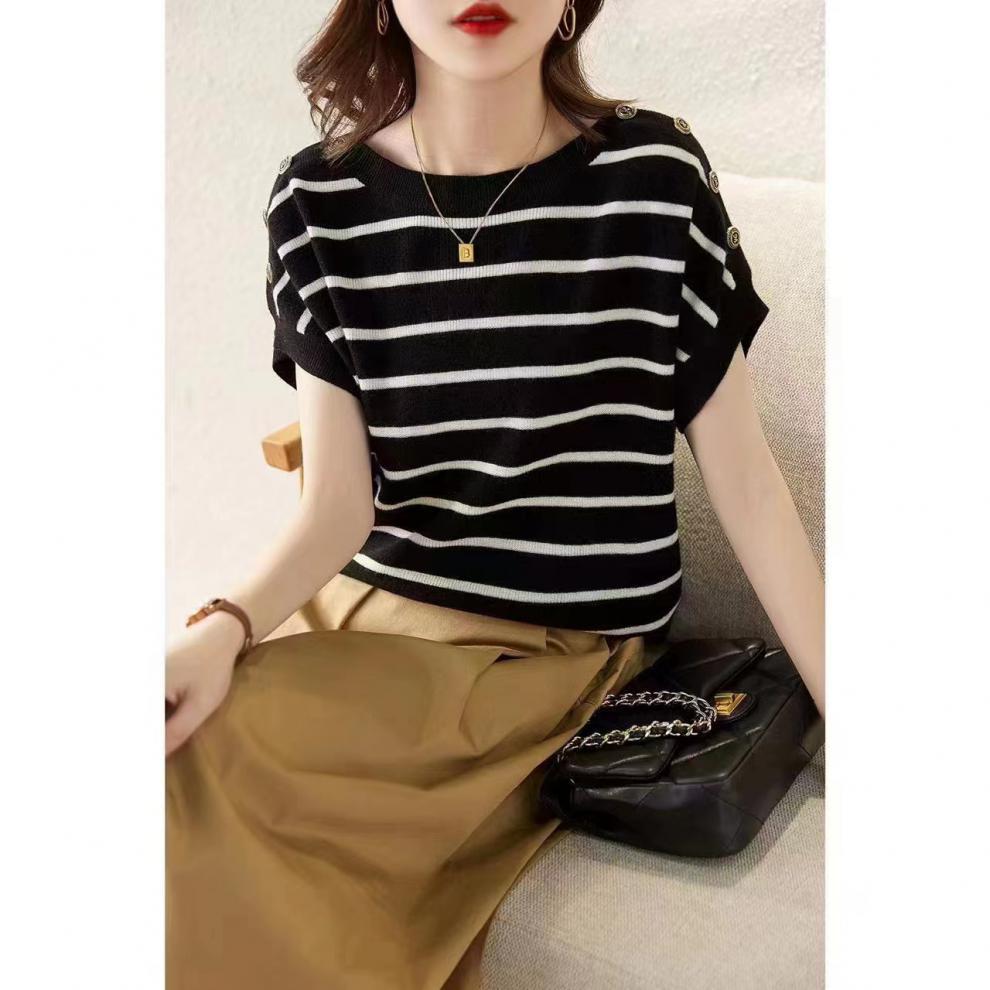 시간과 공간을 가로 지르는 고전적인 아름다움 프랑스 유행 줄무늬 느슨한 니트 풀오버 로테이터 슬리브스토어 가기