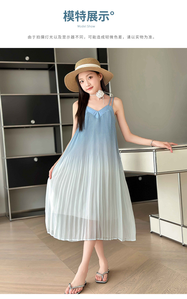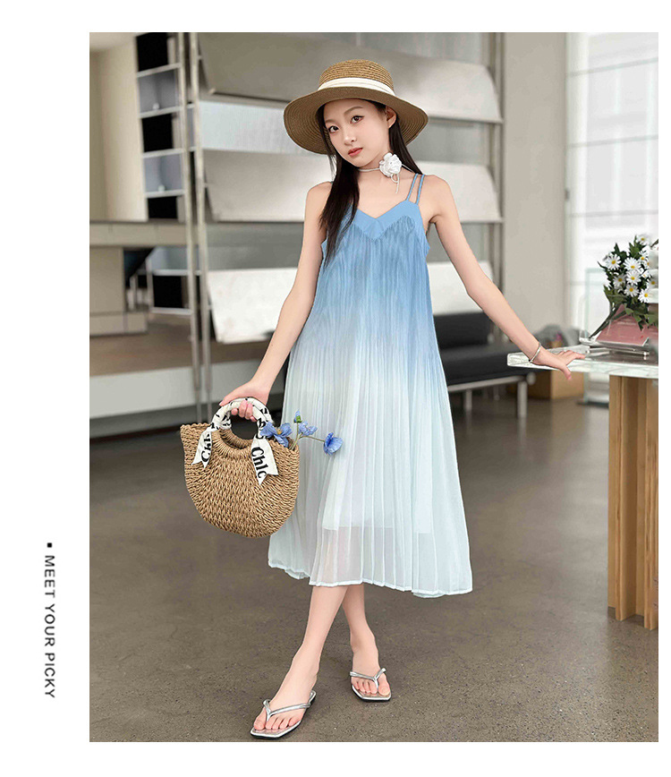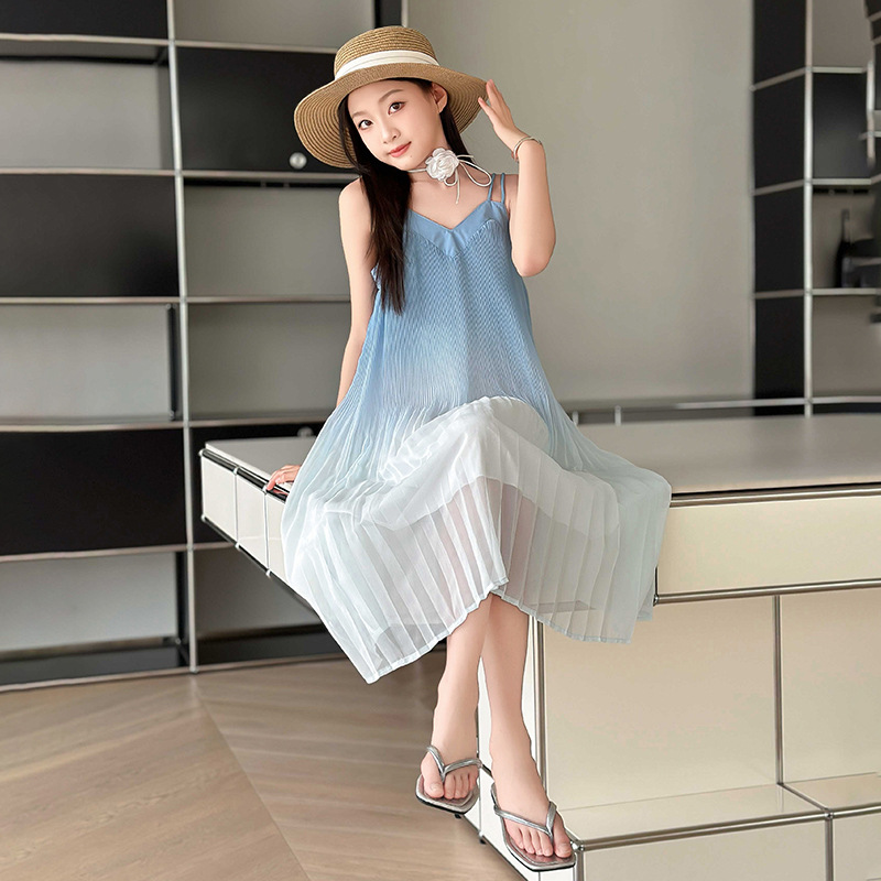 소녀 원피스 2024 년 여름 새로운 어린이 롱 비치 원피스 해변 휴가 그라데이션 스트랩 원피스