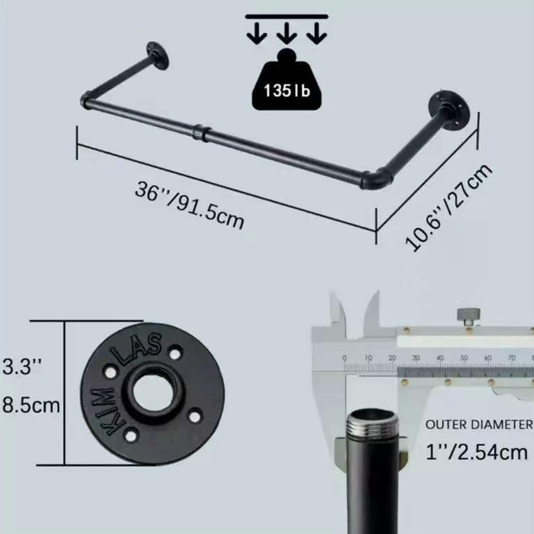 工业管道衣架,重型可拆卸铁制衣架壁挂式,乡村风格节省空间晾衣杆 卧室、壁橱多功能挂杆,黑色