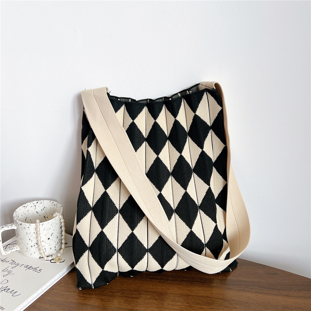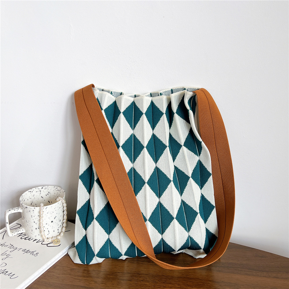 한국 스타일 Ins 틈새 디자인 격자 무늬 접이식 여성용 가방 유행 마름모꼴 버킷 가방 니트 어깨 크로스 바디 접힌 가방스토어 가기
