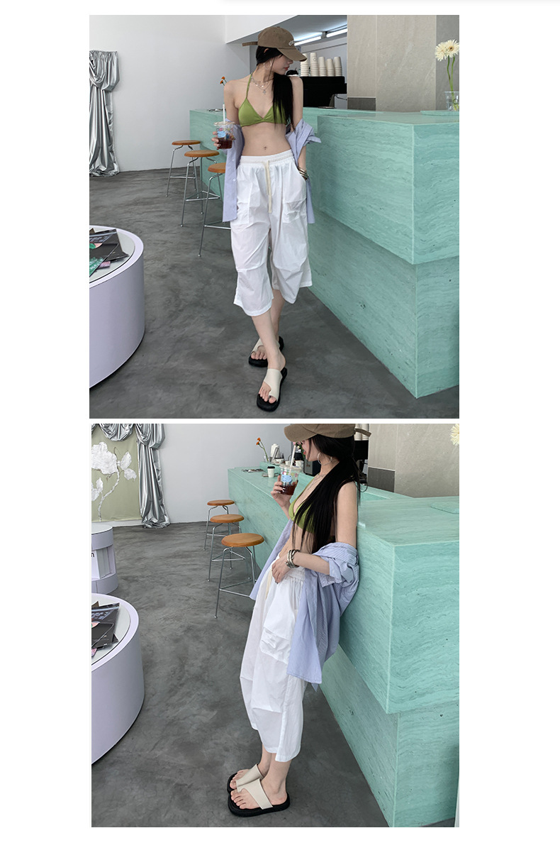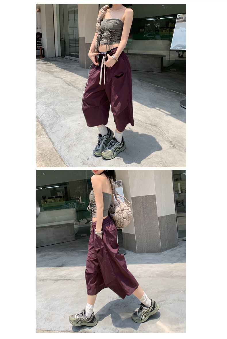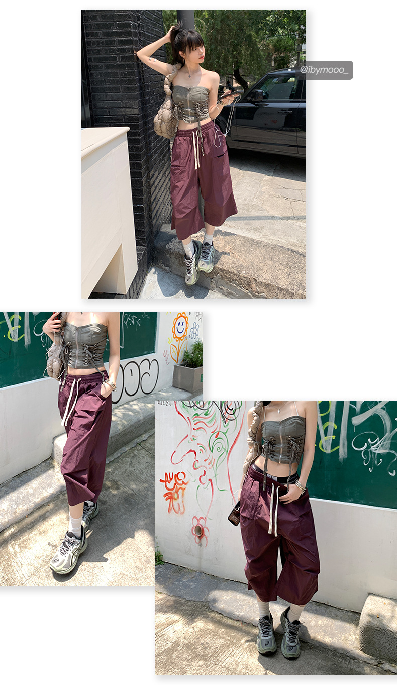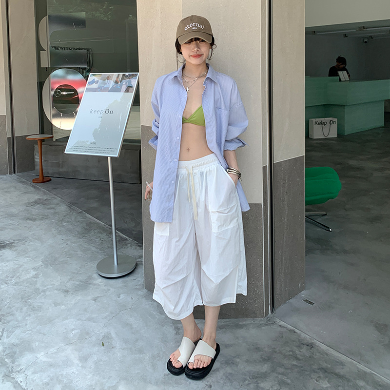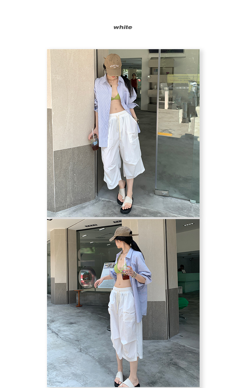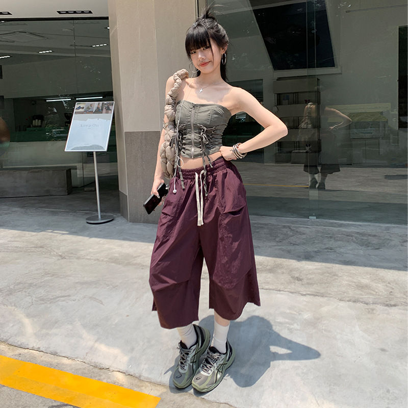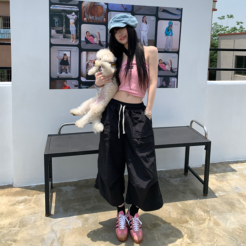 아메리칸 스타일 스트레이트 오버홀 여성 2024 여름 주름 낙하산 바지 느슨한 슬리밍 캐주얼 와이드 레그 자른 바지스토어 가기