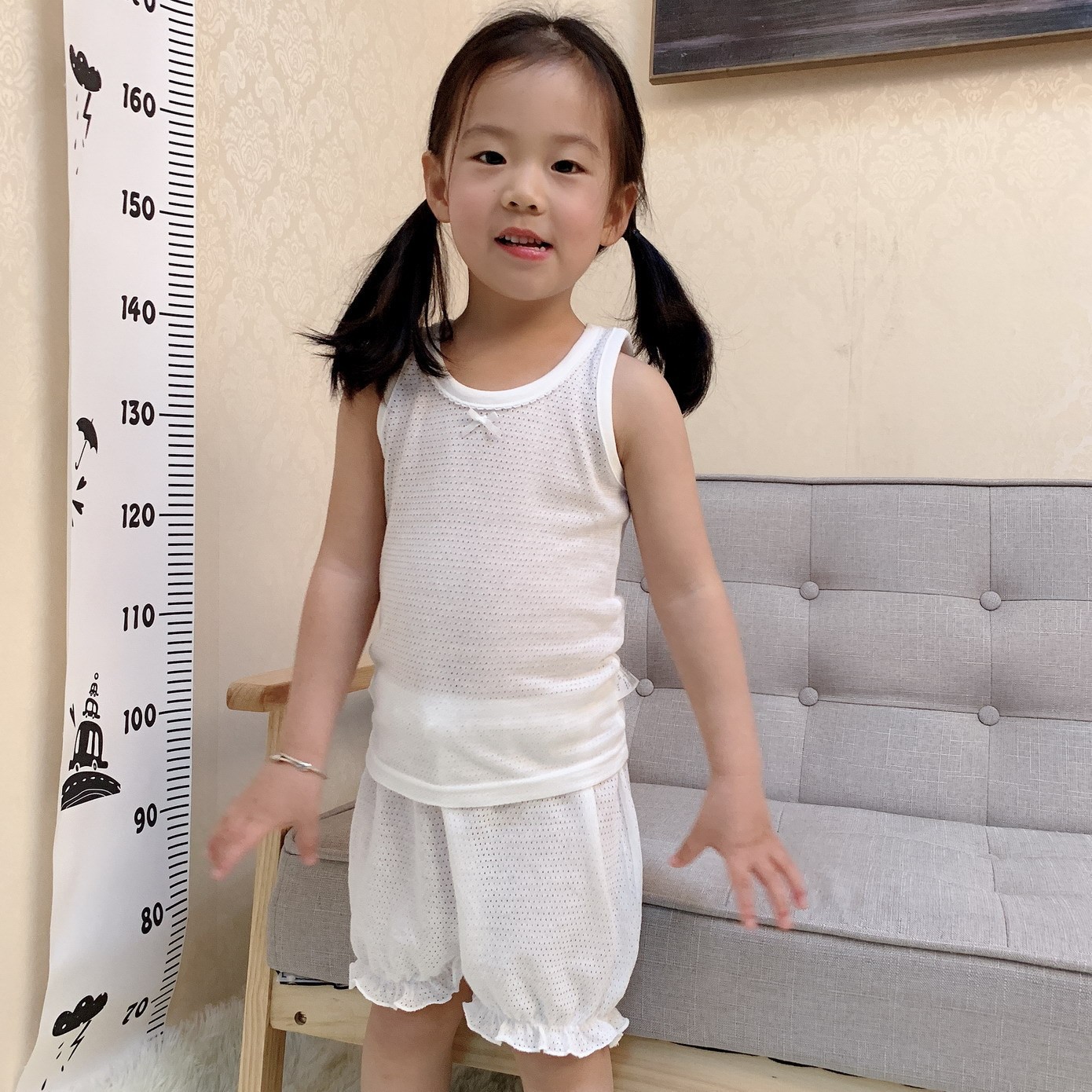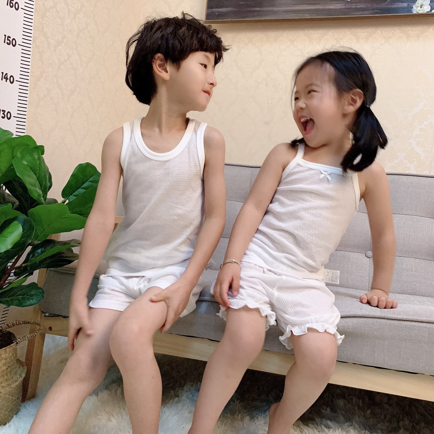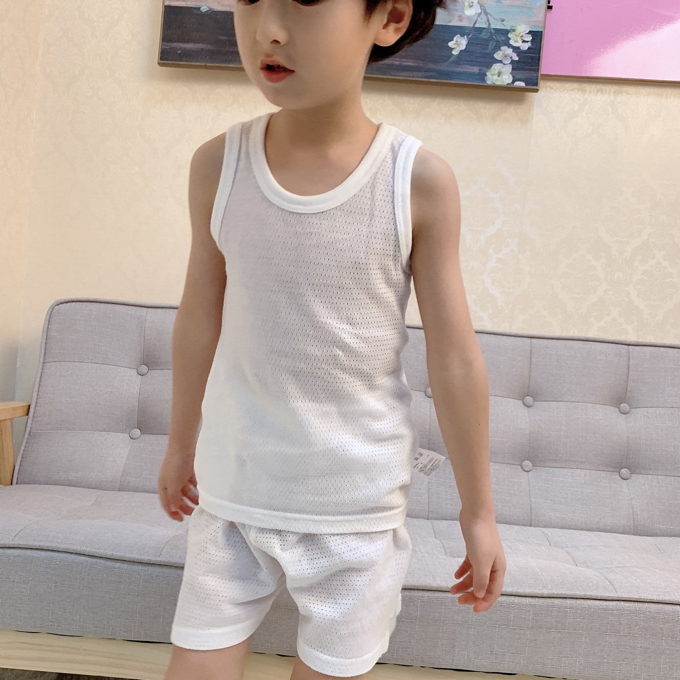 하위 수출 아동복 소스 공장 새로운 메쉬 얇은 흰색 땀 흡수성 소년 소녀 여름 바지 조끼 민소매