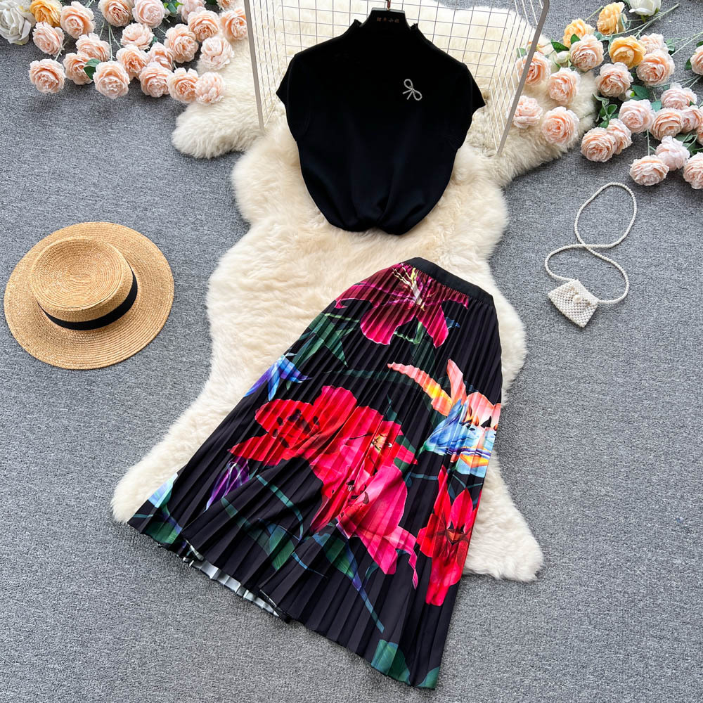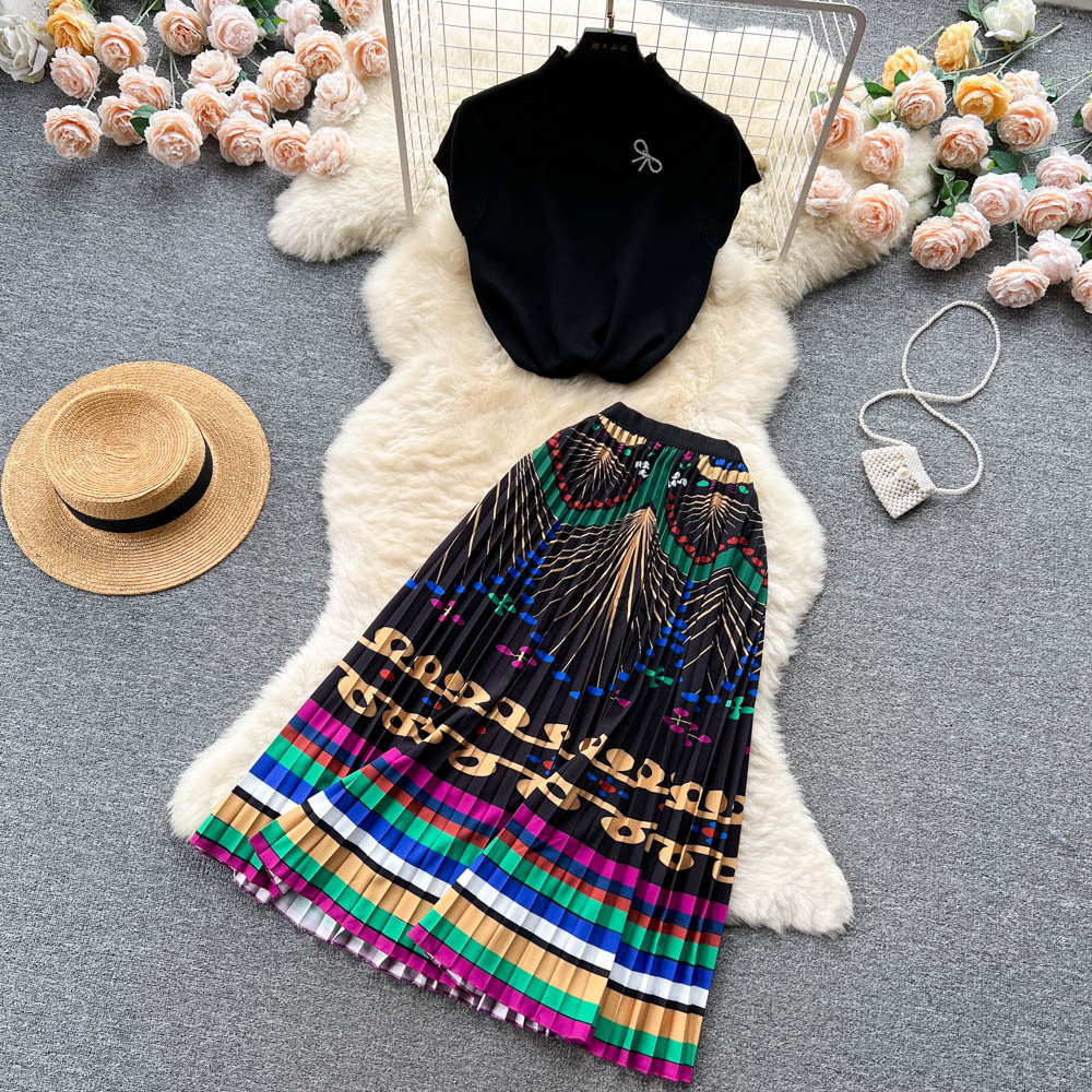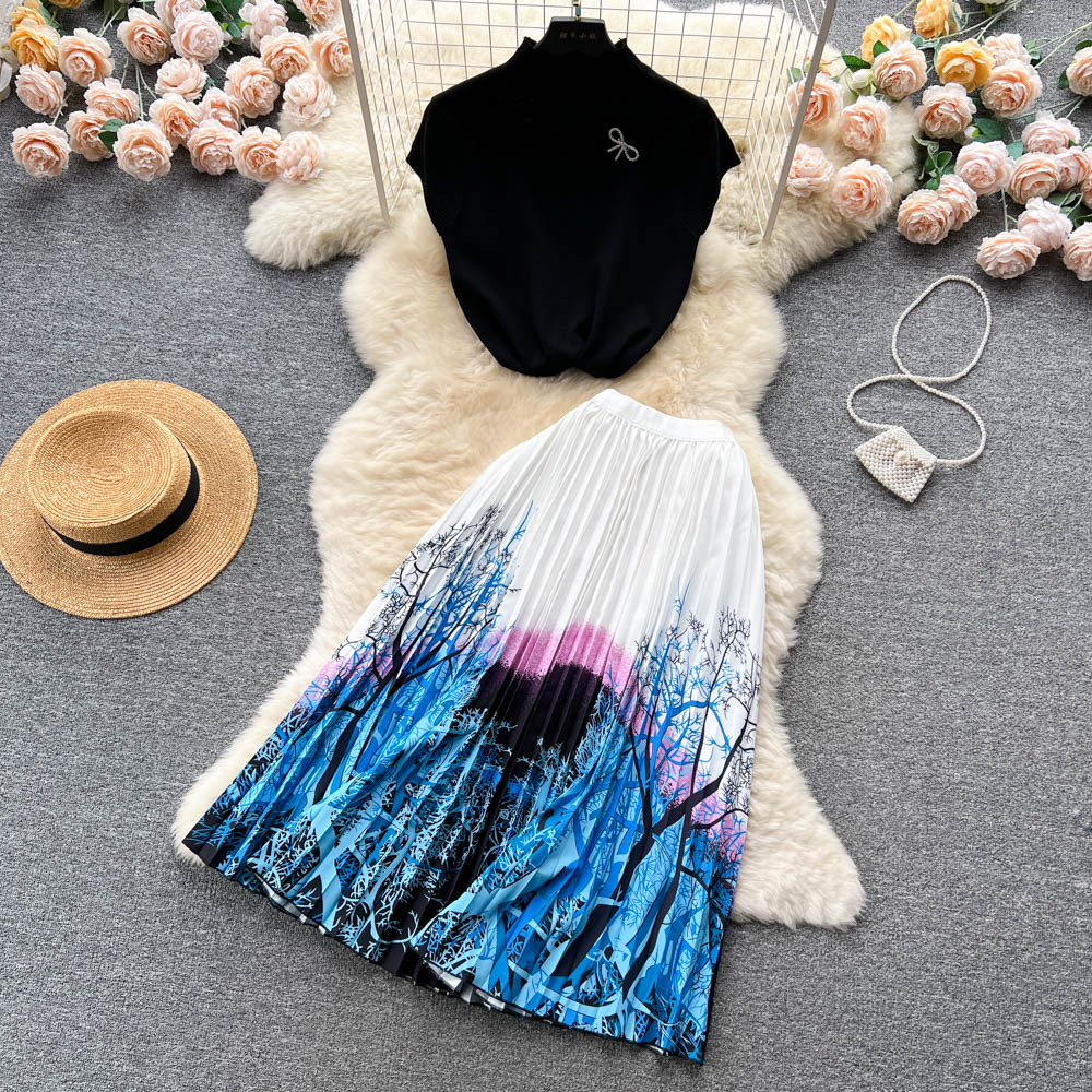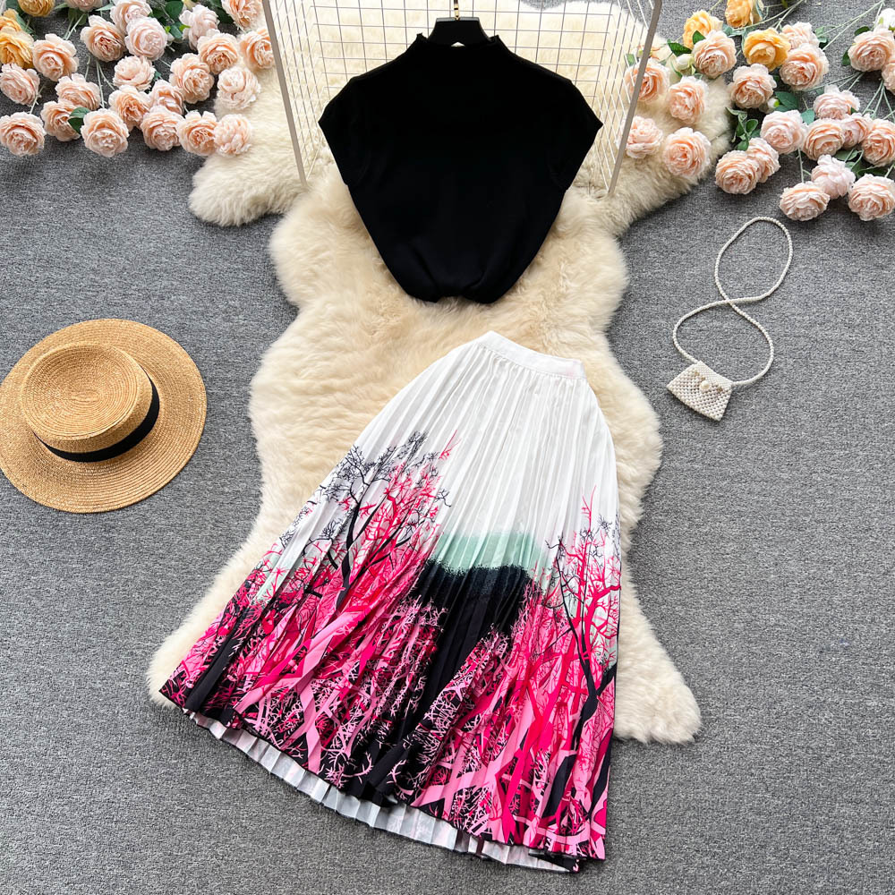빈티지 우아한 스타일 세트 여성 여름 하이 엔드 디자인 틈새 민소매 셔츠 탑 주름 긴 원피스 투피스 세트