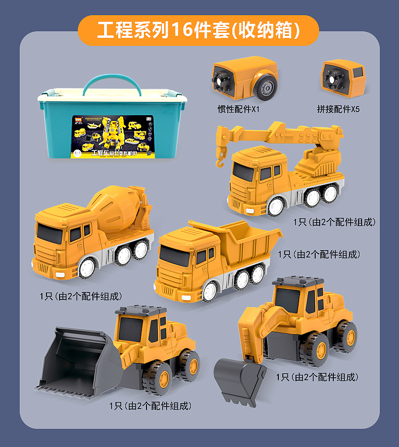 • 엔지니어링 차량 노란색 16개 세트(보관 상자) 중국어 또는 영어 버전
