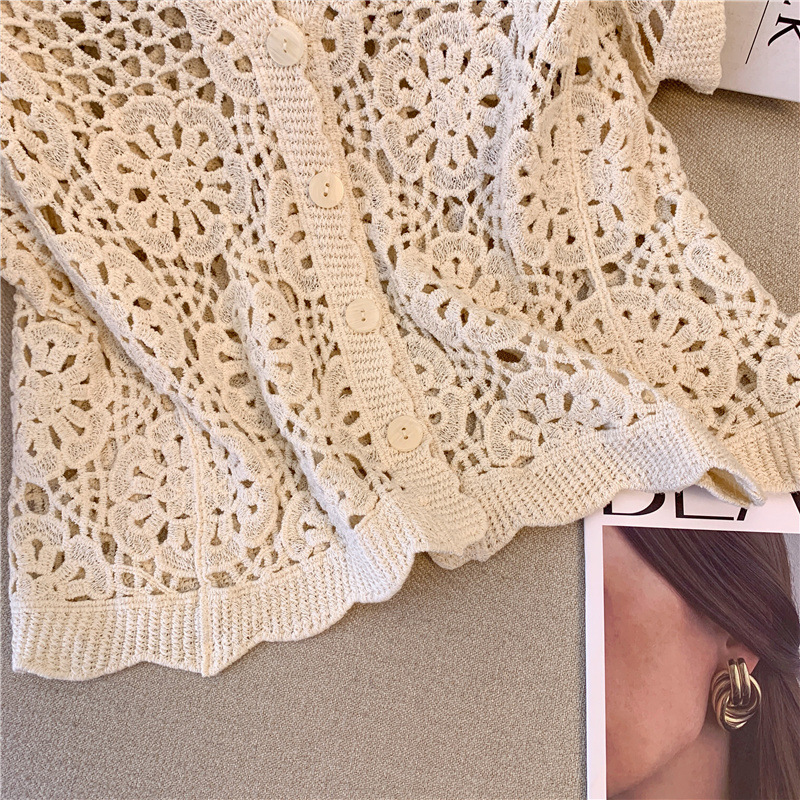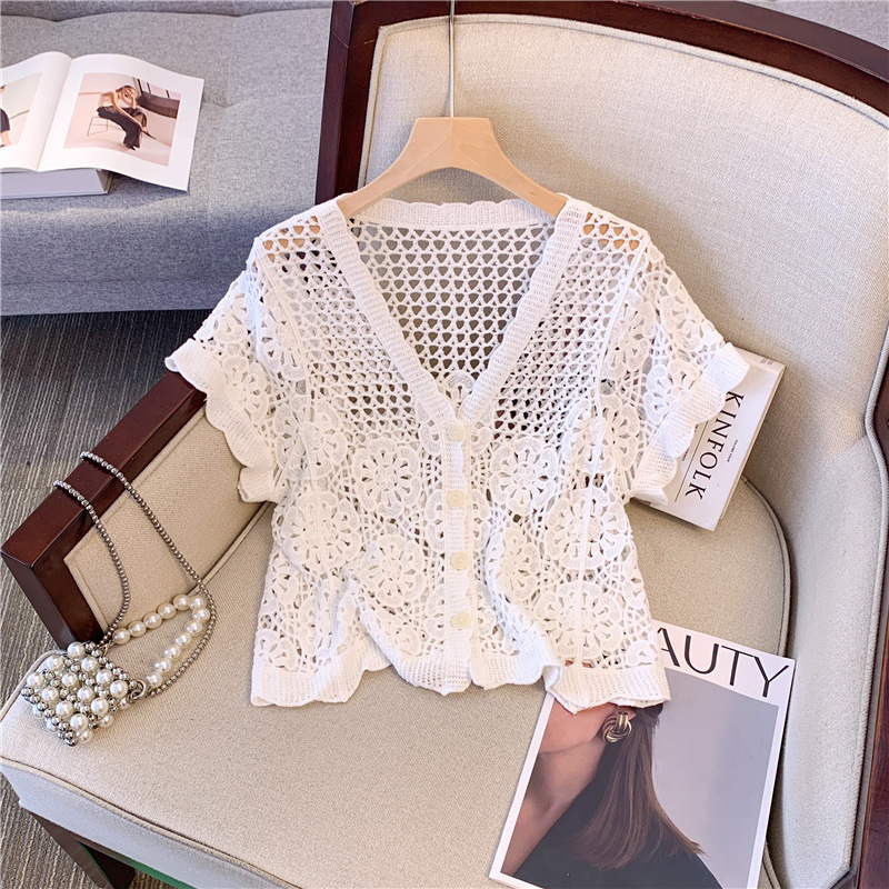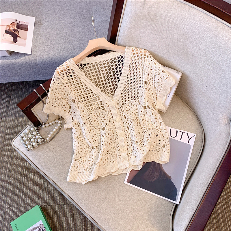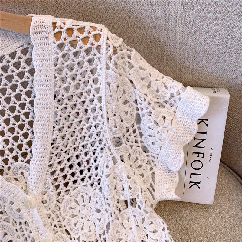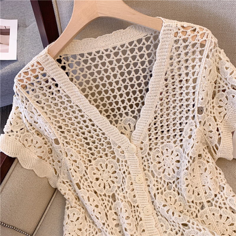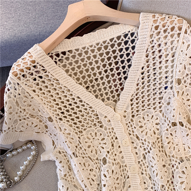 프랑스 V 넥 크로 셰 뜨개질 빈 카디건 여자 여름 패션 세련된 올 매치 루즈 슬림 핏 탑 여자 103스토어 가기