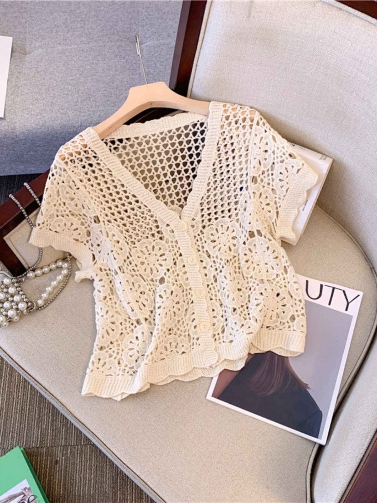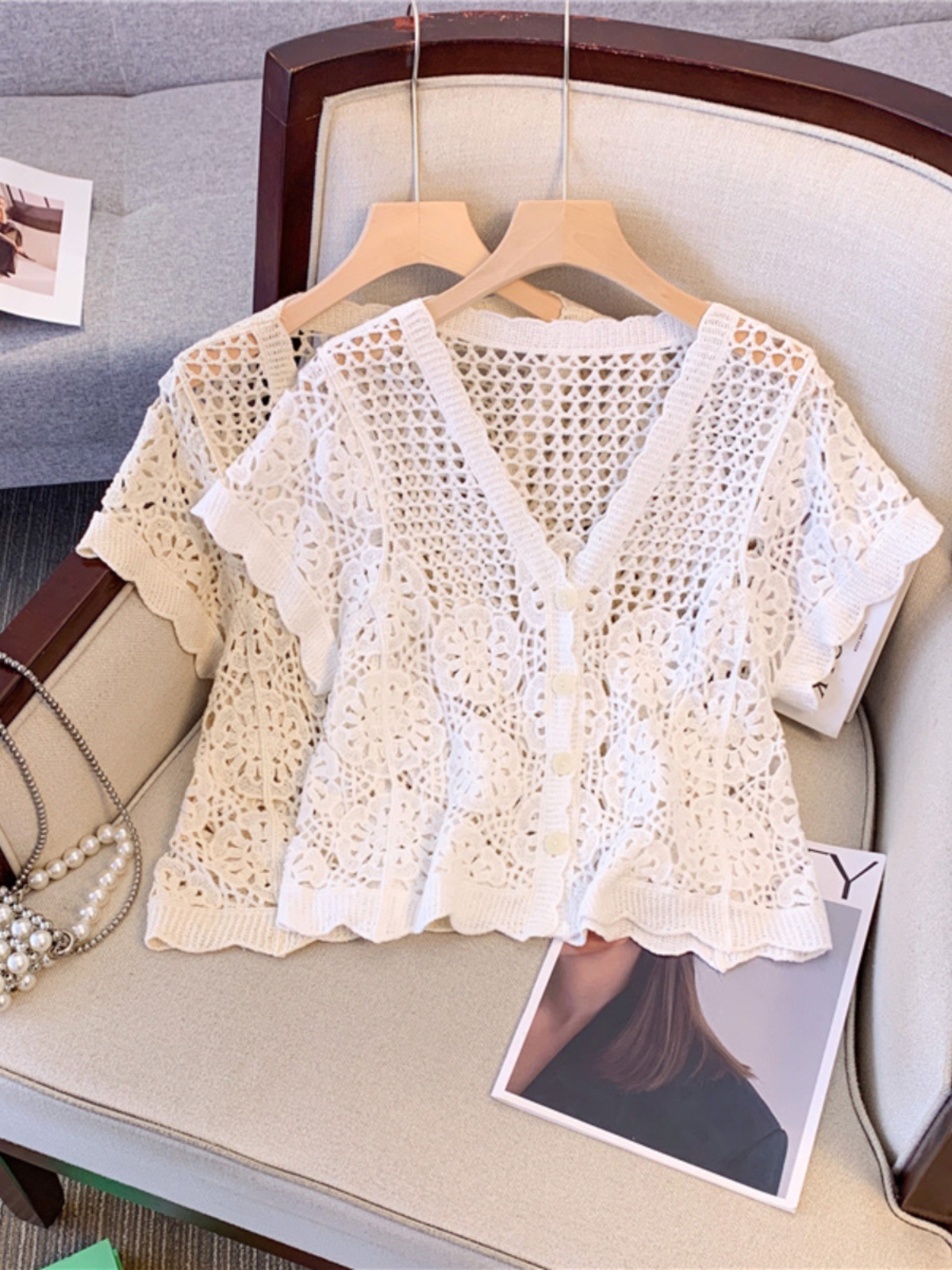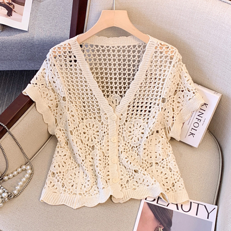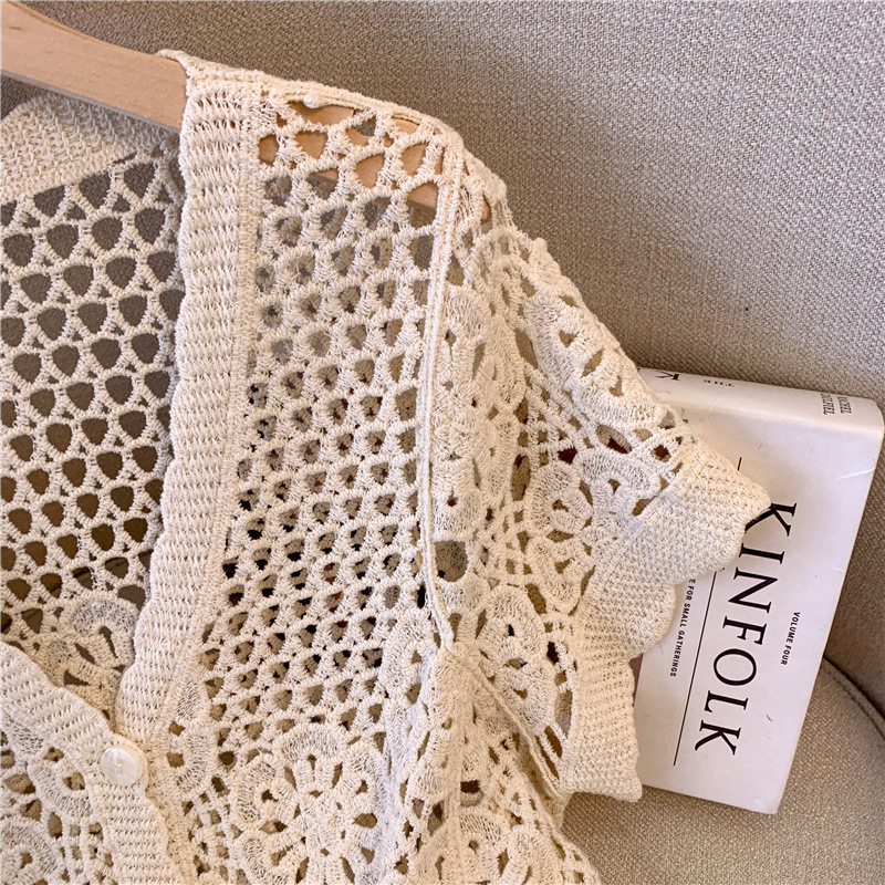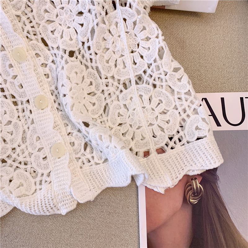 프랑스 V 넥 크로 셰 뜨개질 빈 카디건 여자 여름 패션 세련된 올 매치 루즈 슬림 핏 탑 여자 103스토어 가기