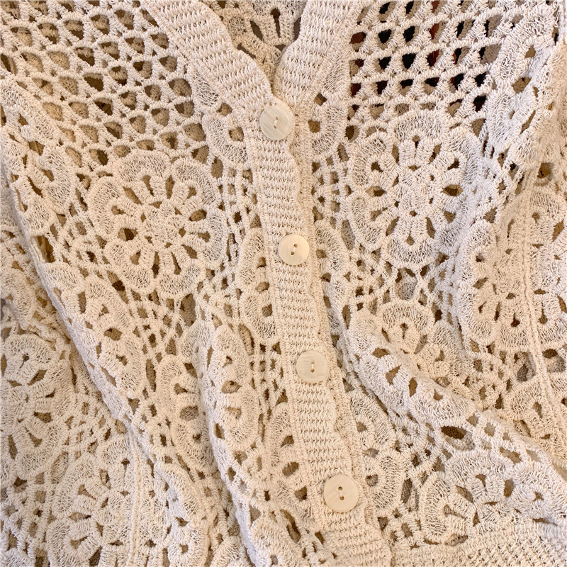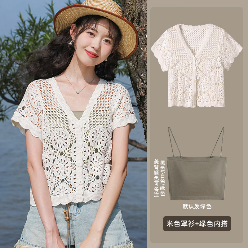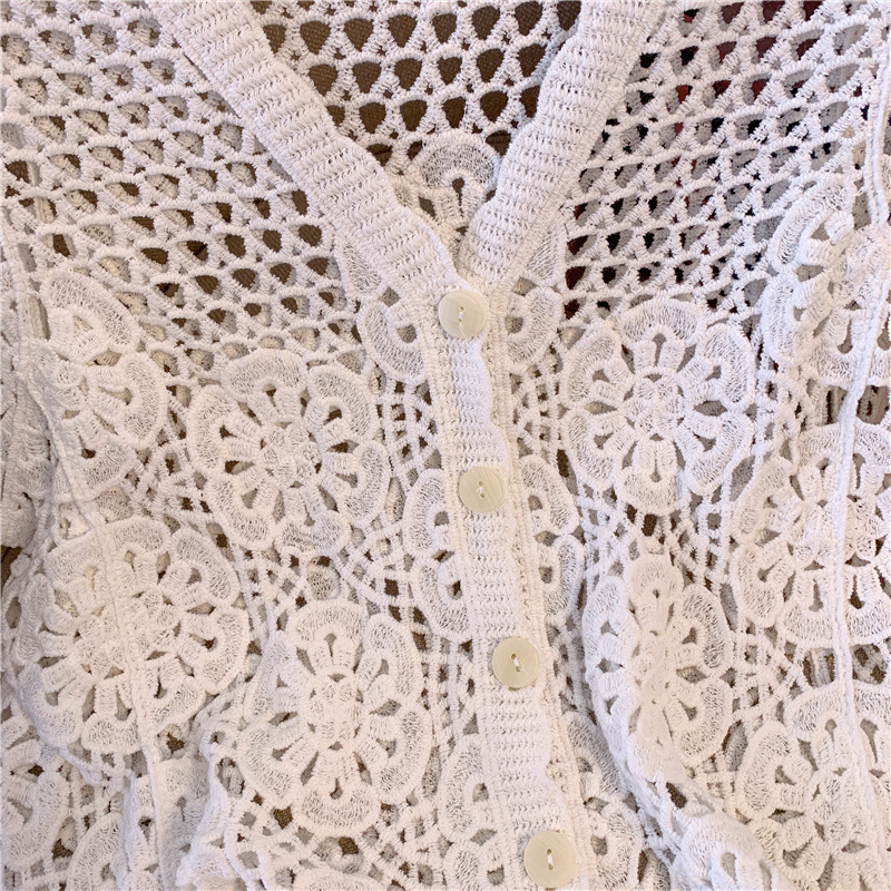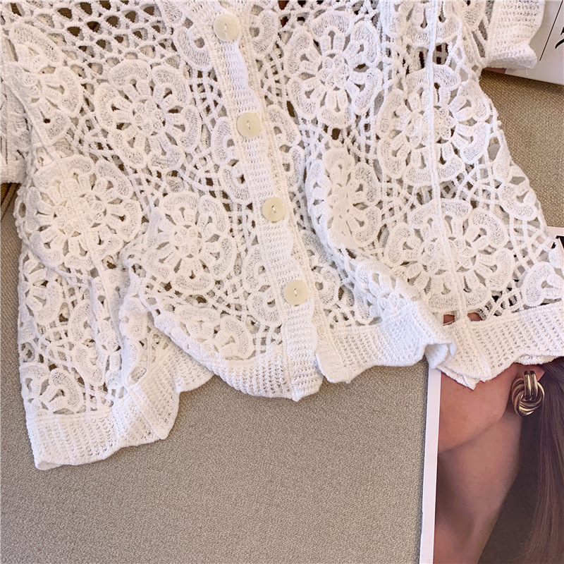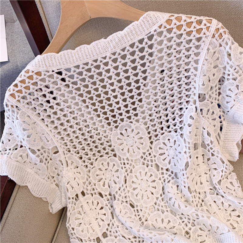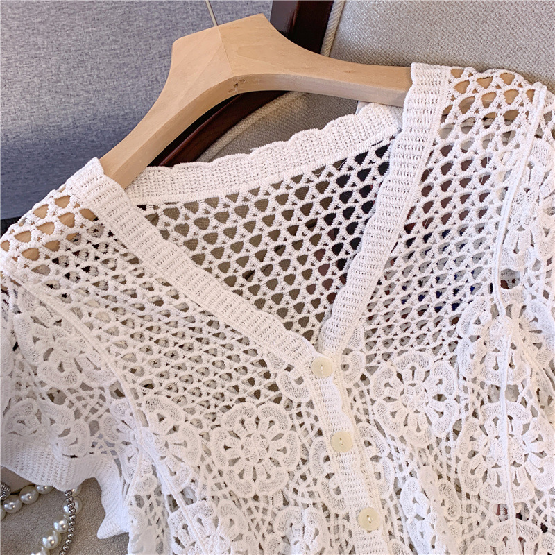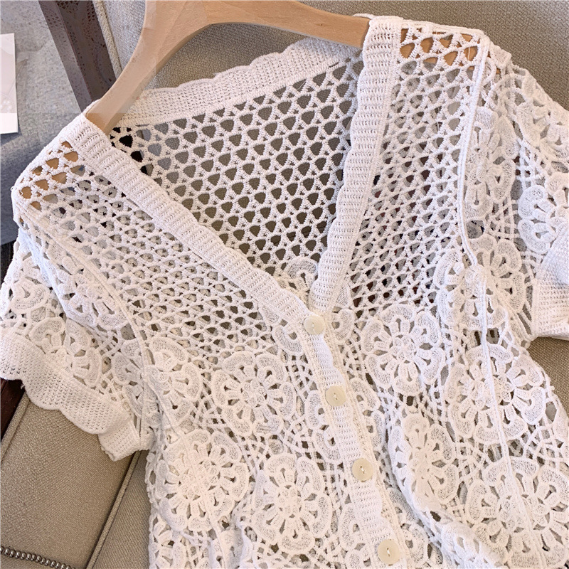 프랑스 V 넥 크로 셰 뜨개질 빈 카디건 여자 여름 패션 세련된 올 매치 루즈 슬림 핏 탑 여자 103