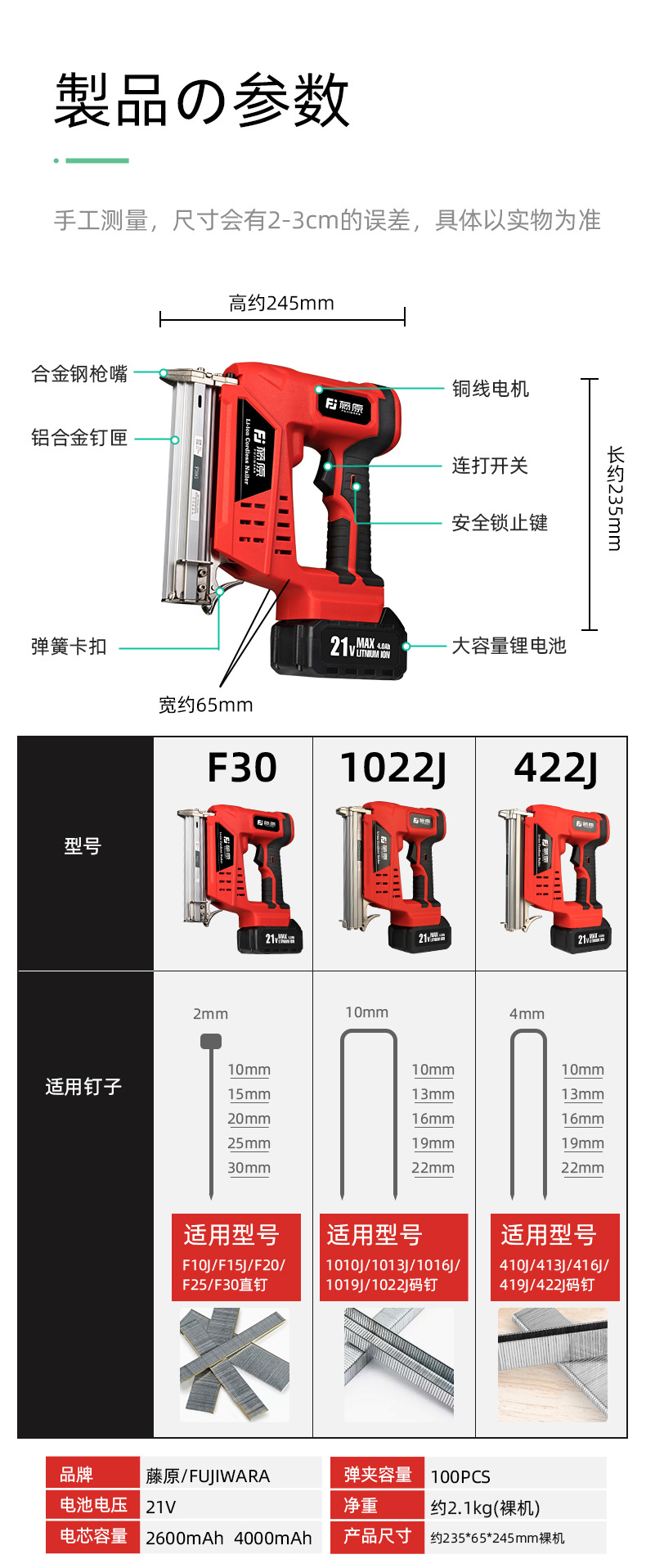 후지와라 리튬 배터리 네일 건 무선 리튬 배터리 네일 건 전기 네일 건 목공 특수 네일 건 충전 에어 네일 건