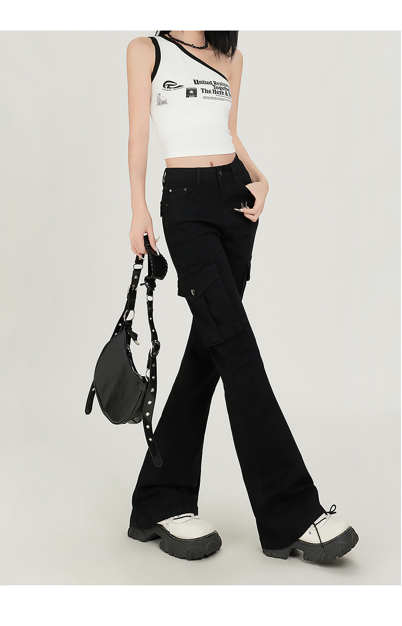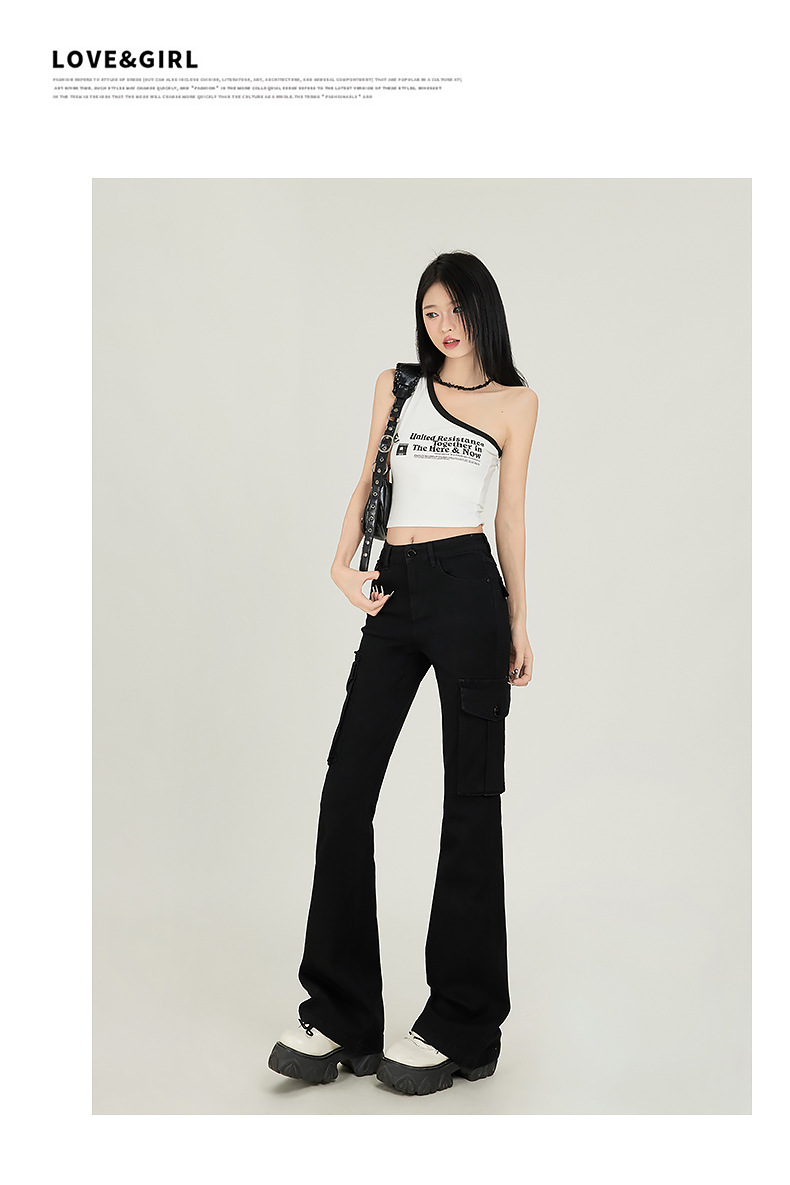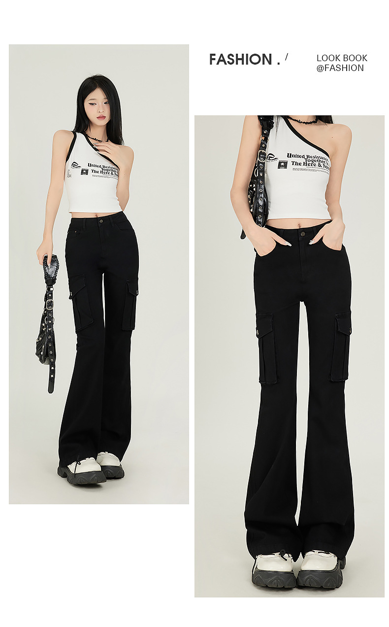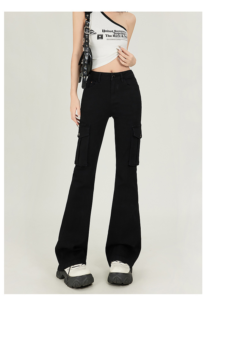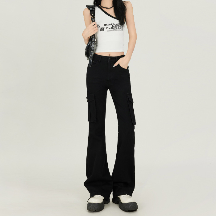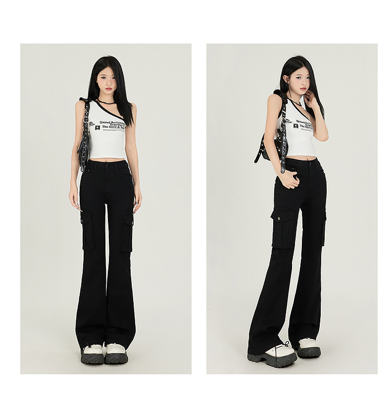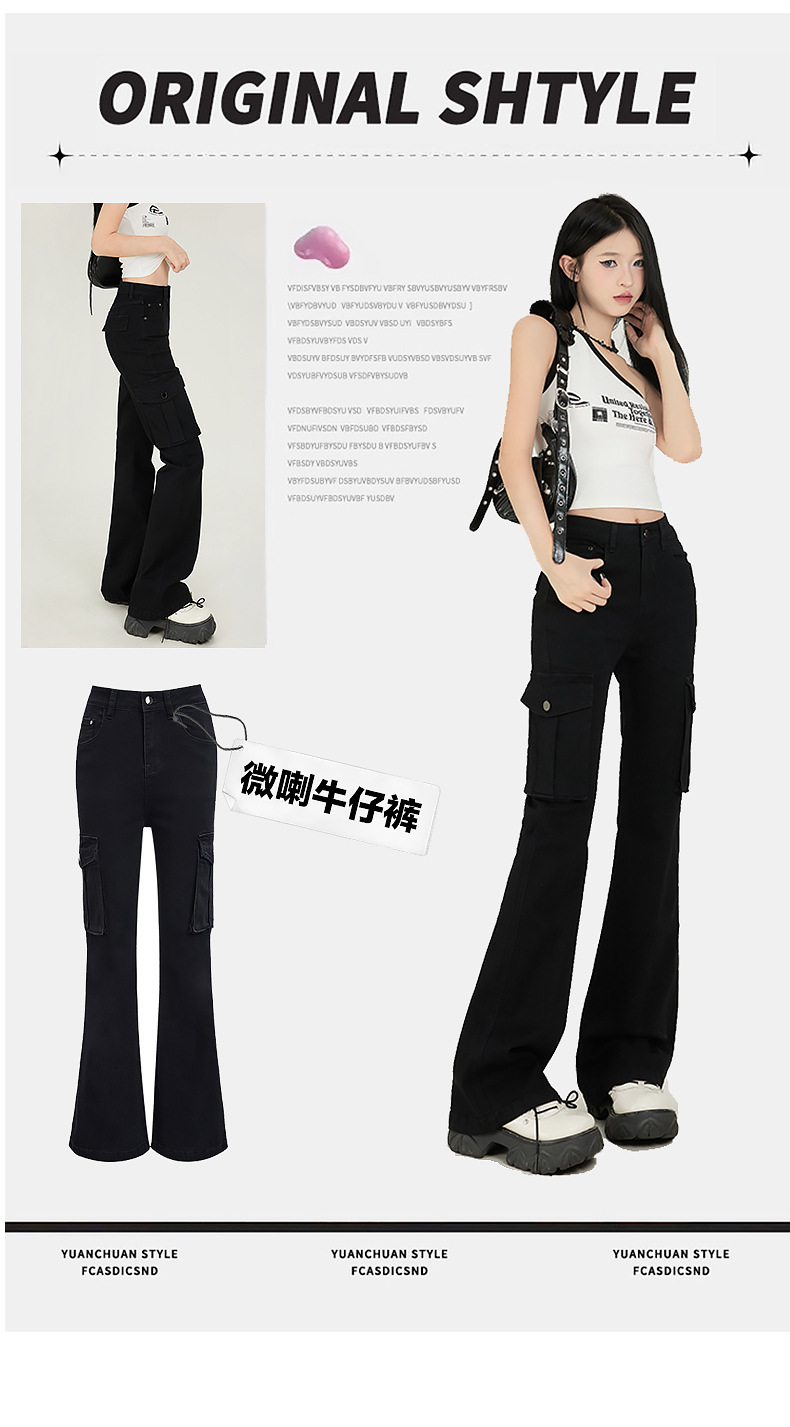 여름 새로운 미국식 작업복 마이크로 팬츠 여성 디자인 센스 높은 허리 플래 팬츠 도포 캐주얼 말굽 바지스토어 가기