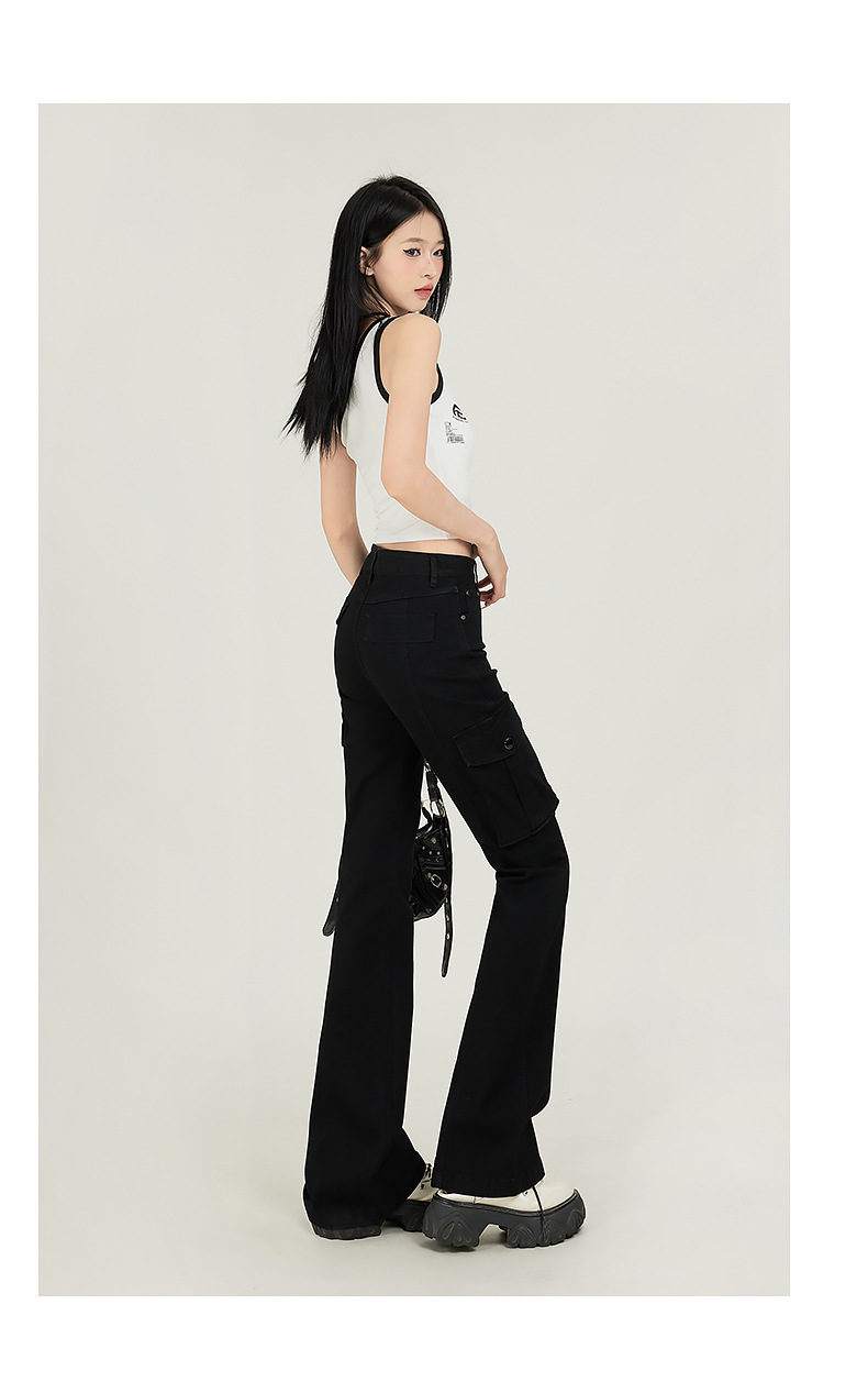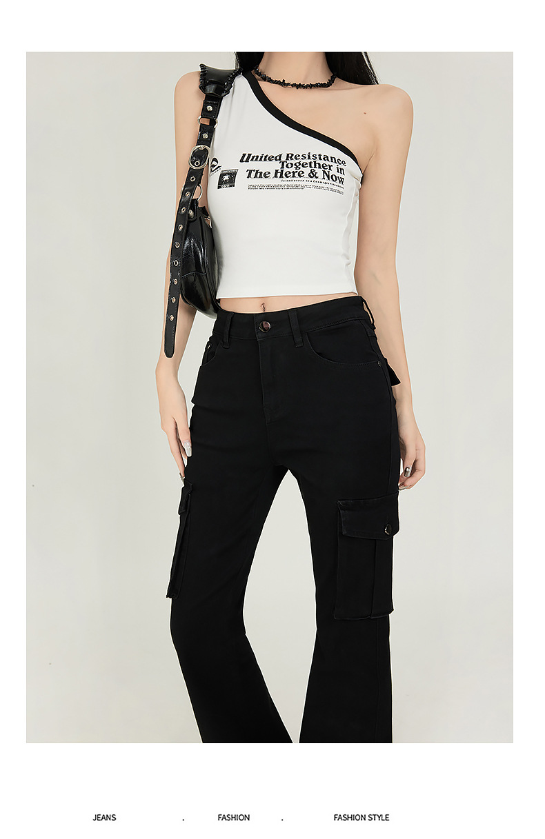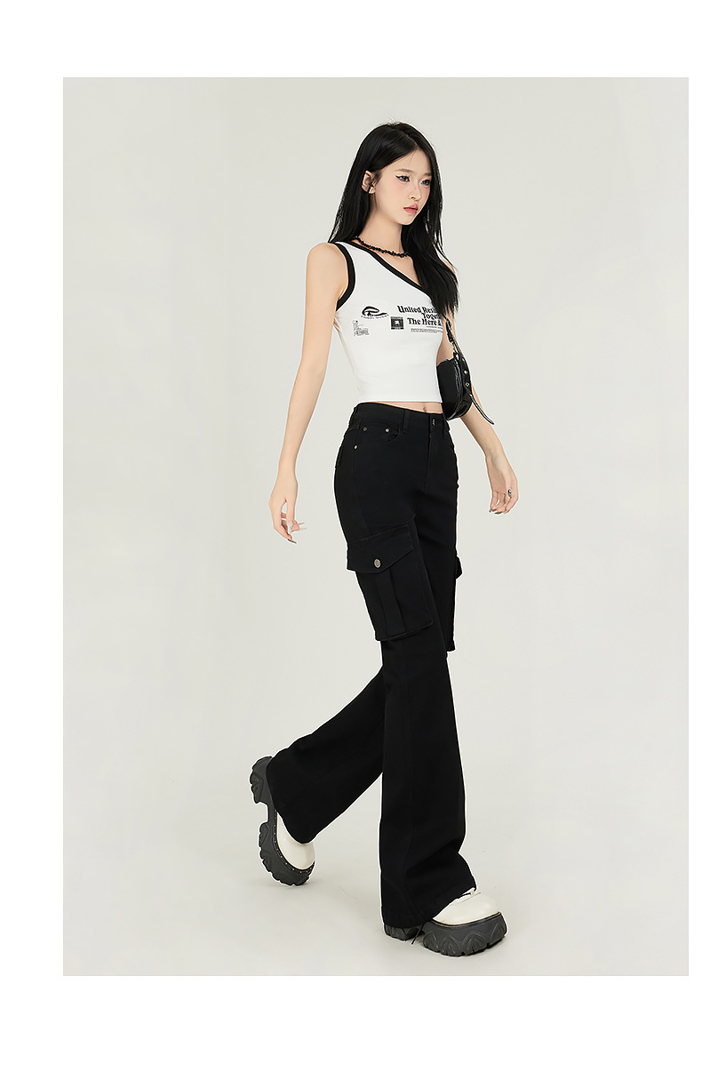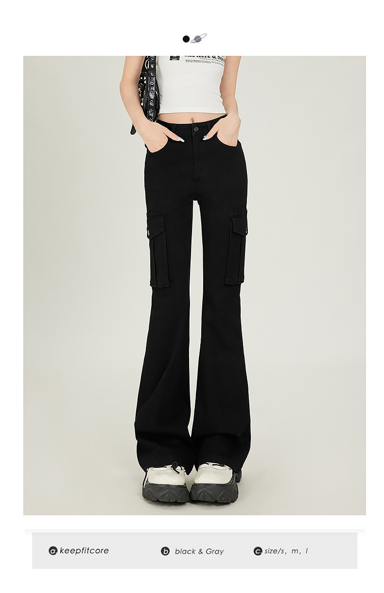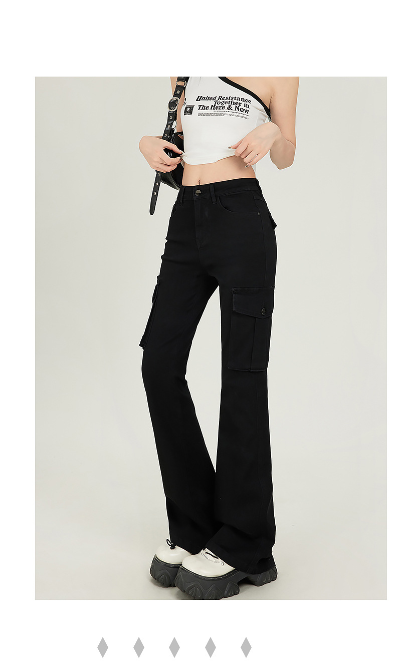 여름 새로운 미국식 작업복 마이크로 팬츠 여성 디자인 센스 높은 허리 플래 팬츠 도포 캐주얼 말굽 바지스토어 가기