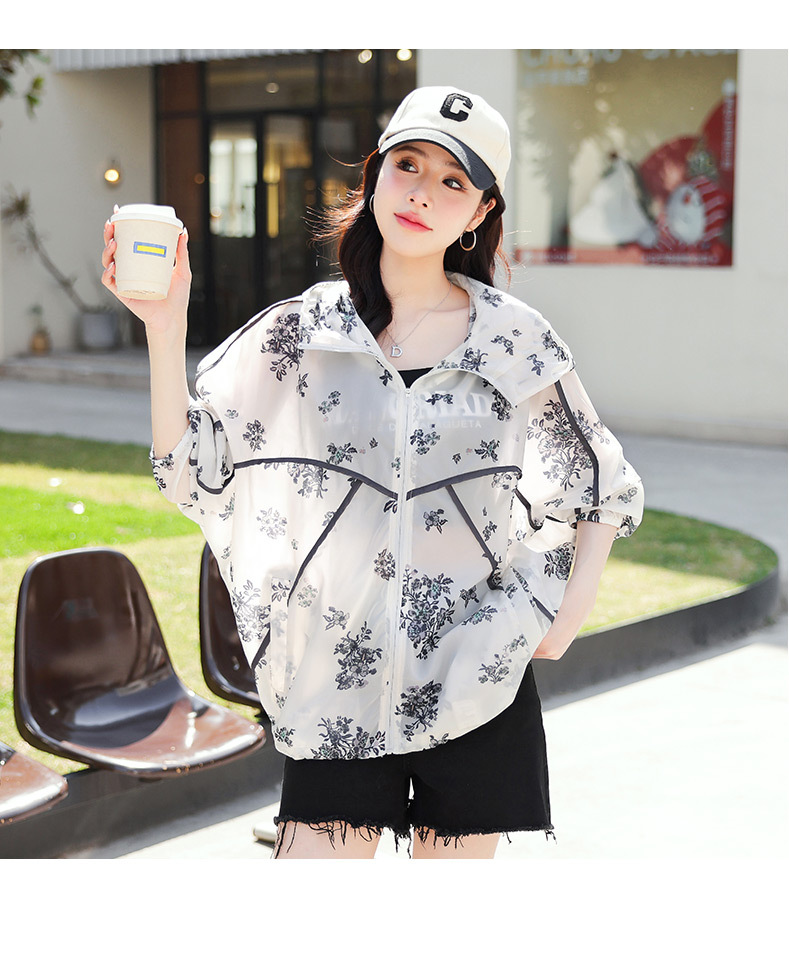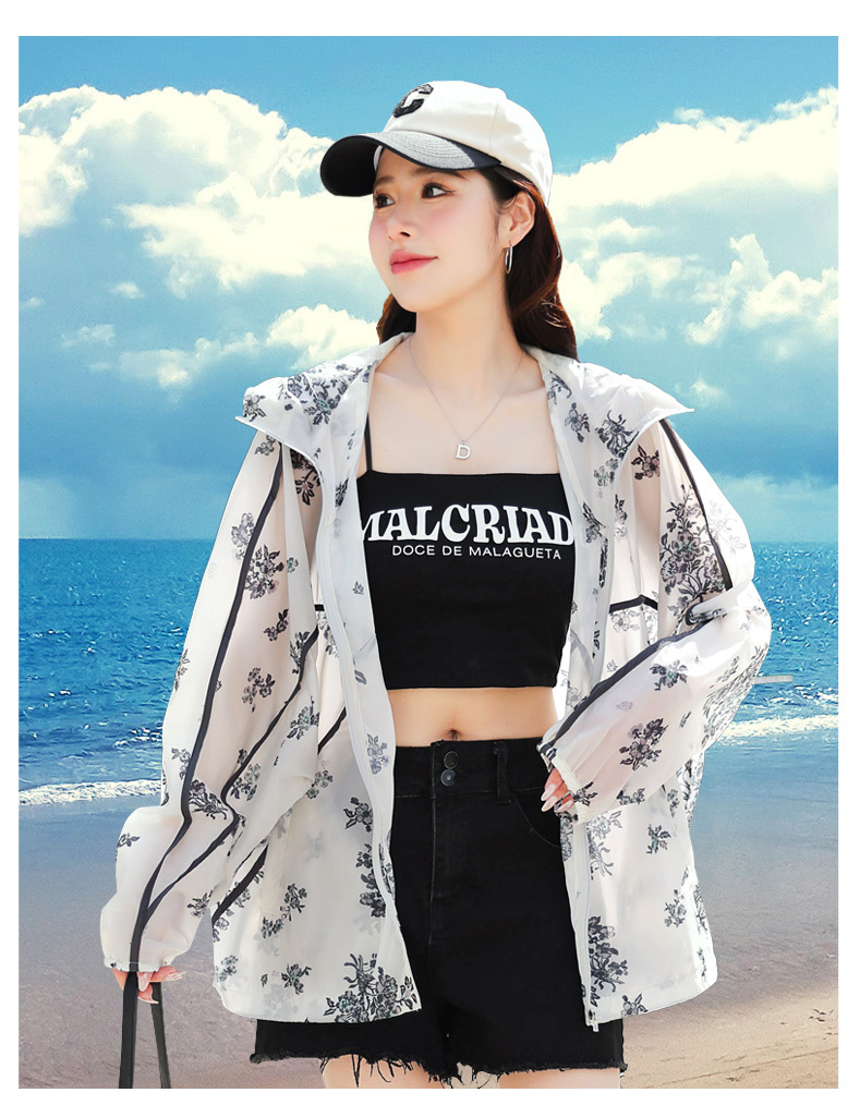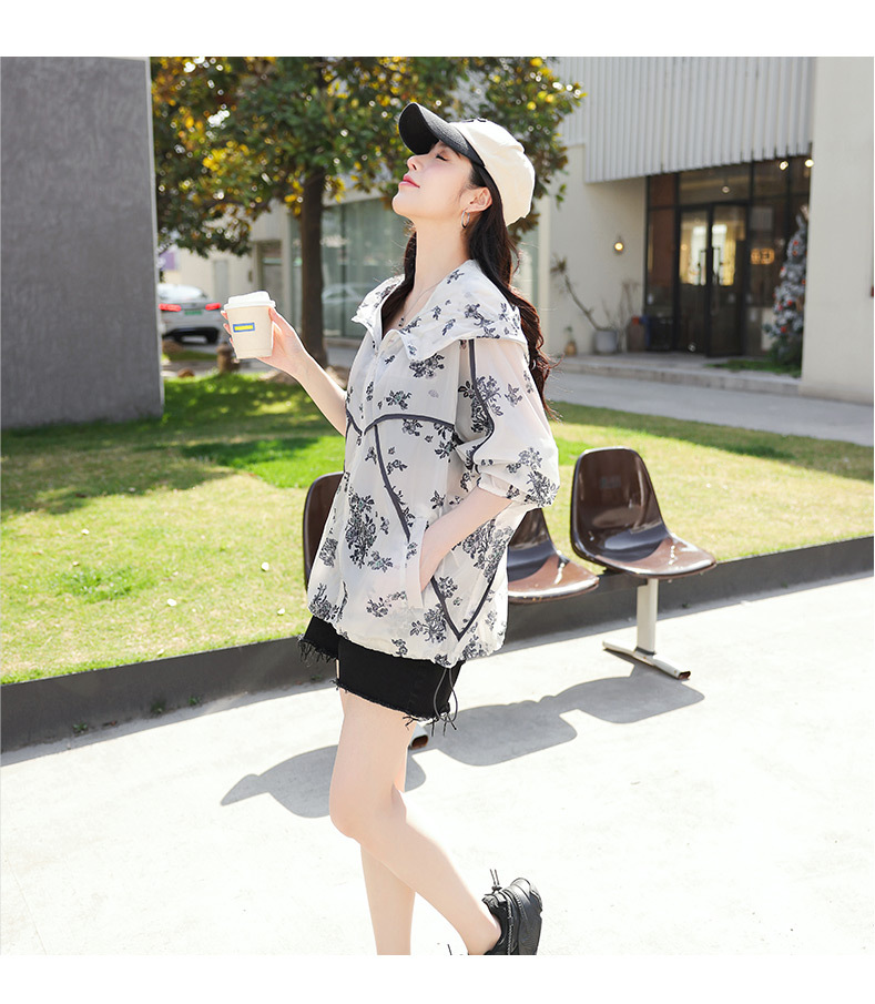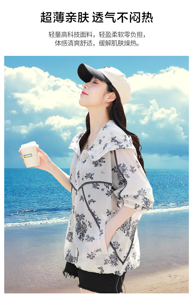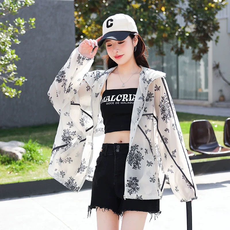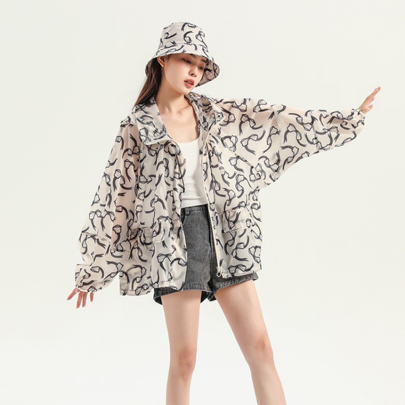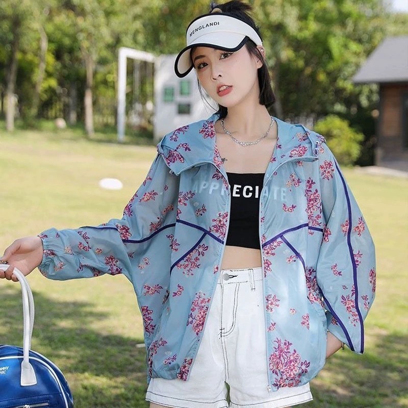 인쇄 된 태양 보호 의류 여성 여름 2024 새로운 통기성 얇은 올매치 한국식 태양 보호 의류 후드 느슨한 태양 보호 셔츠