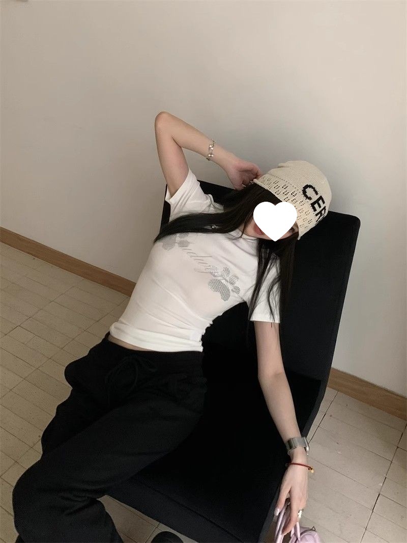 [260g 코튼 모달] 뜨거운 소녀 핫 다이아몬드 고양이 발톱 어깨 크루 넥 반팔 티셔츠 여성용 슬림 핏 재킷 블랙스토어 가기