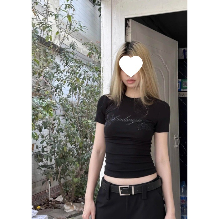 [260g 코튼 모달] 뜨거운 소녀 핫 다이아몬드 고양이 발톱 어깨 크루 넥 반팔 티셔츠 여성용 슬림 핏 재킷 블랙