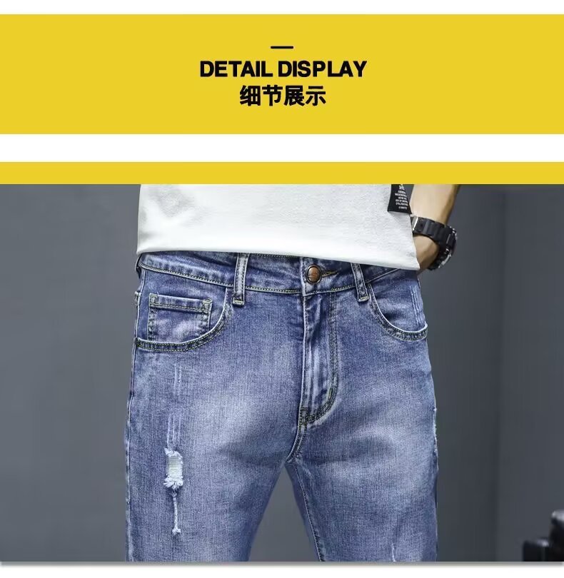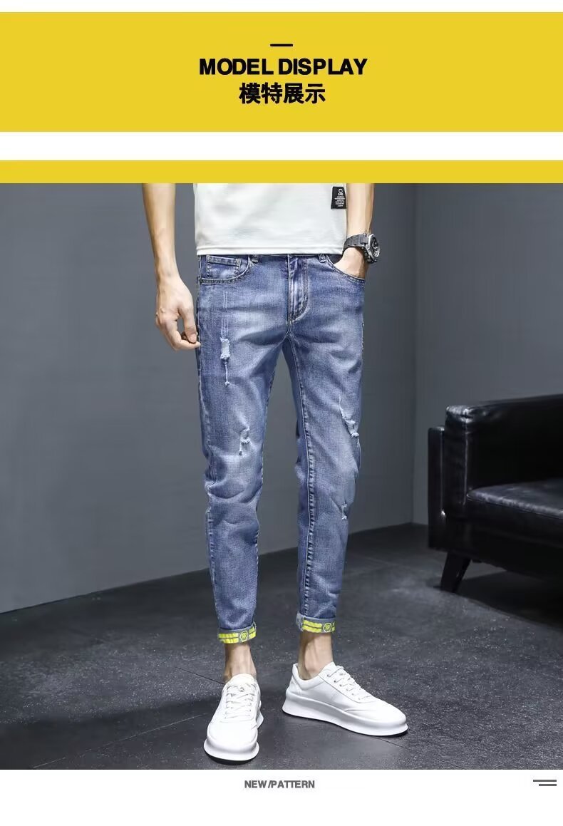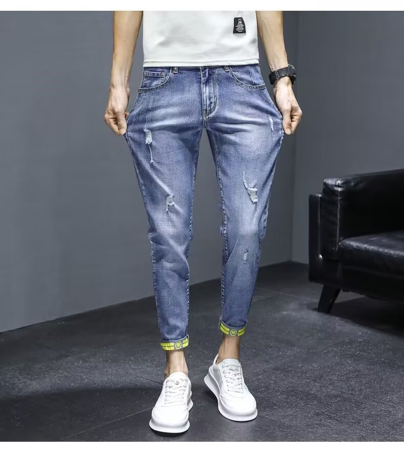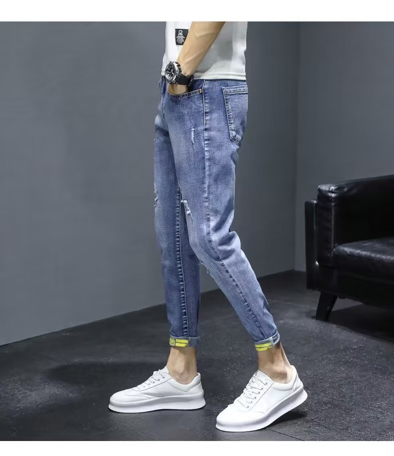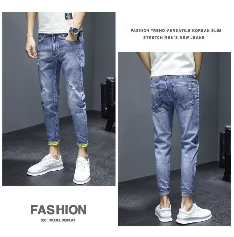 봄과 가을 청바지 남성 트렌디 브랜드 한국 스타일 트렌디 올매치 탄성 슬림 핏 스키니 캐주얼 9 점 9 점 바지스토어 가기