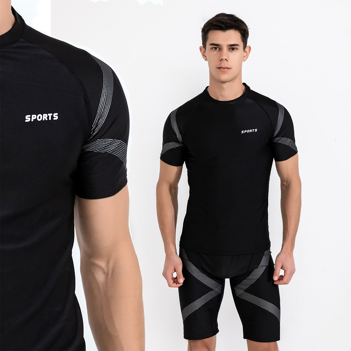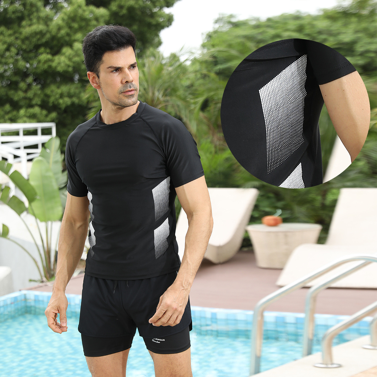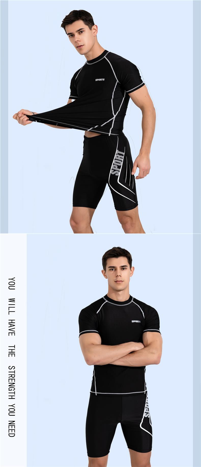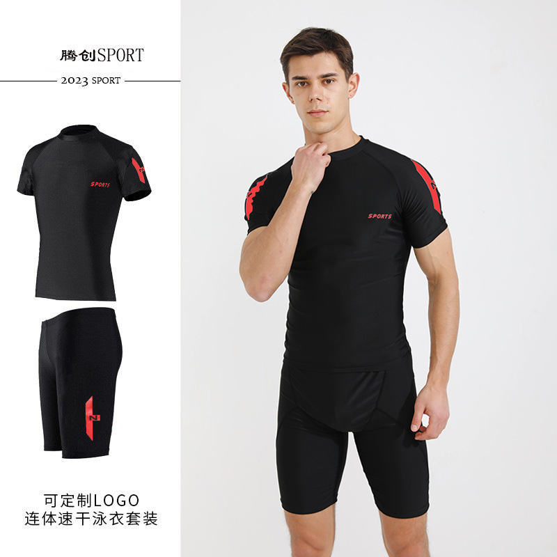 도매 수영복 남성 스플릿 투피스 세트 남자 선스크린 반팔 서핑 스쿠버 세트 플러스 사이즈 비치 남자 수영 트렁크