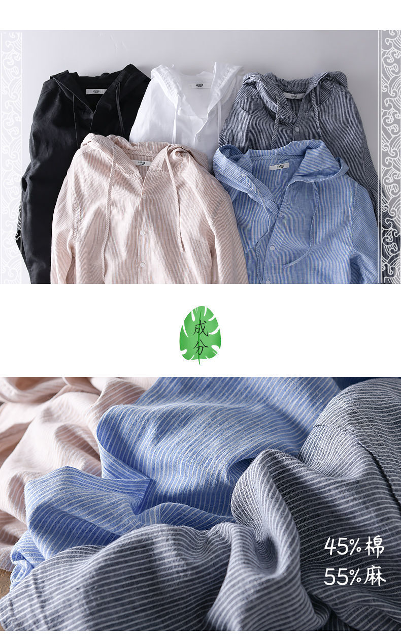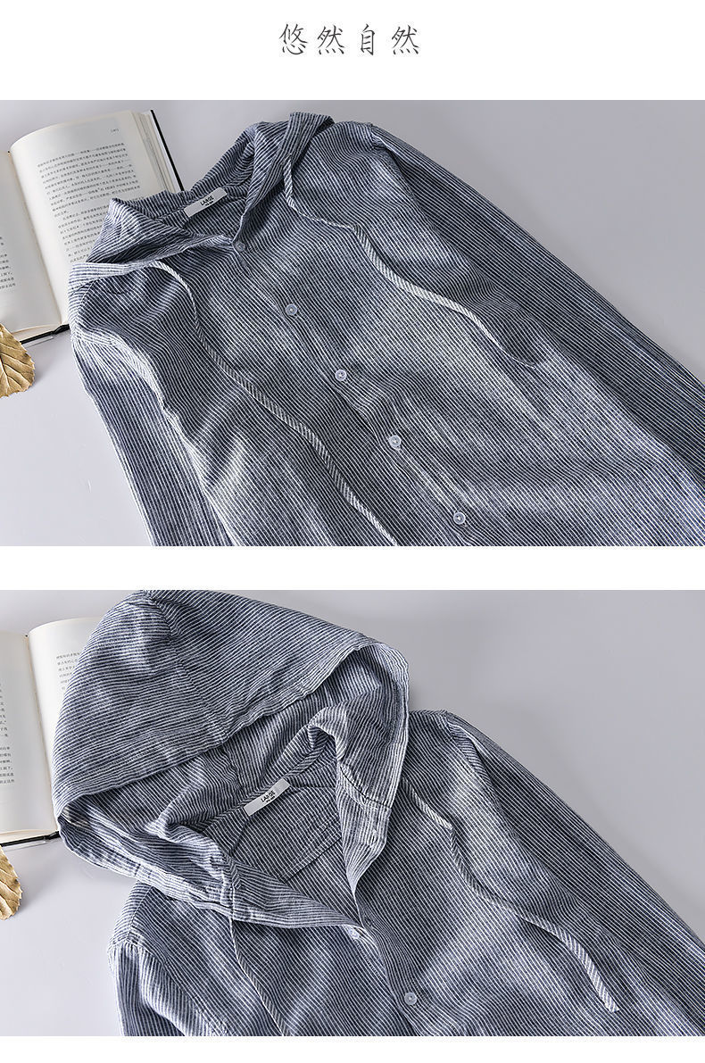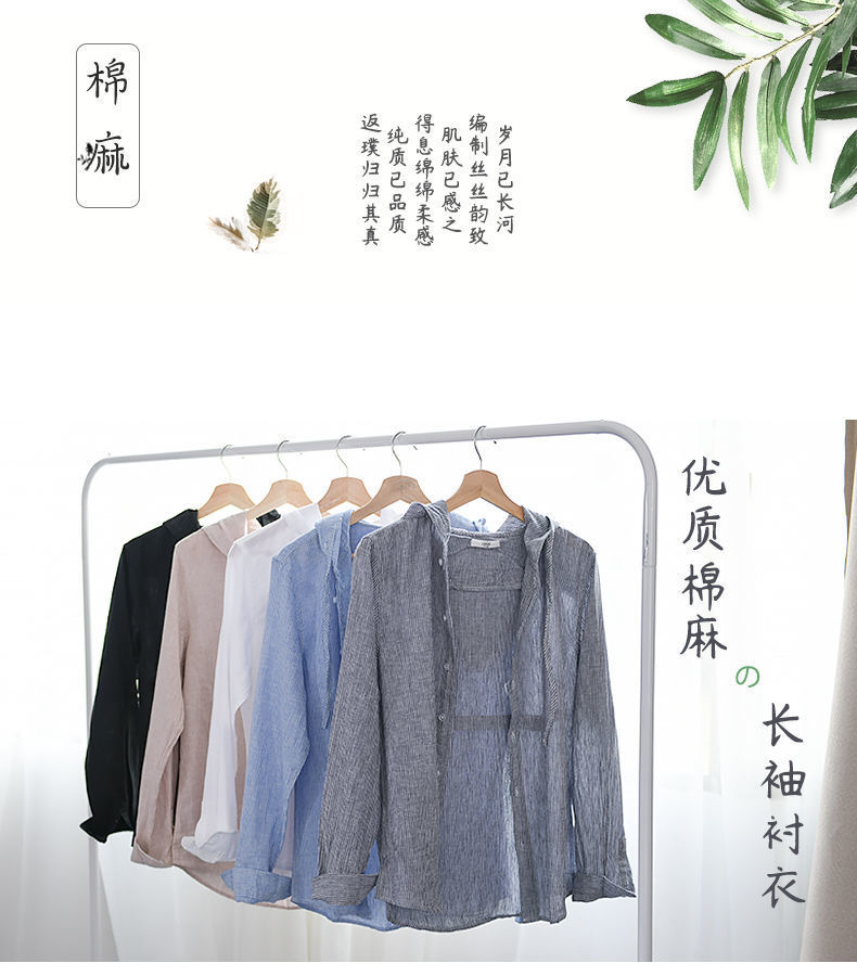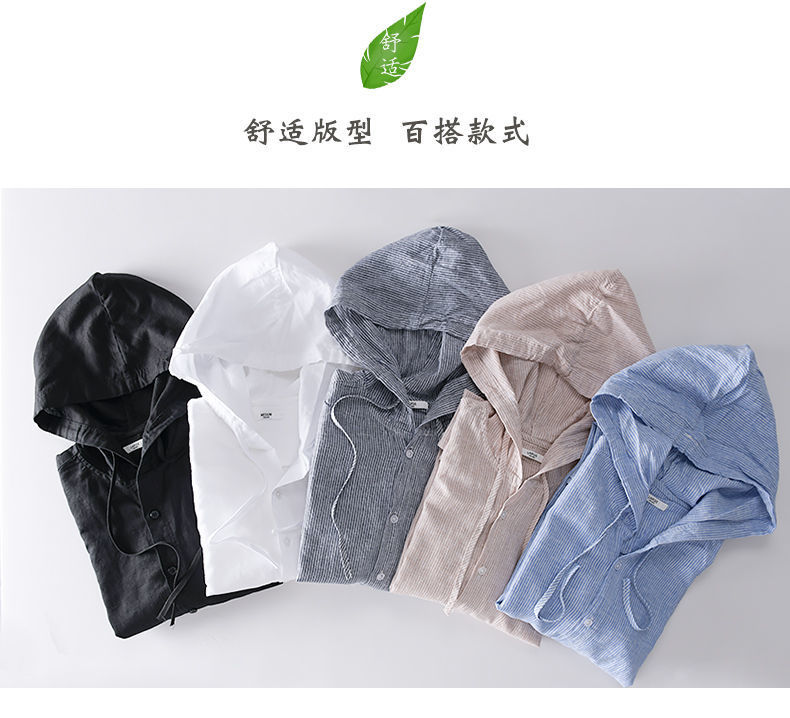 봄과 여름 새로운 남성과 여성의 느슨한 청소년 패션 면화와 리넨 선스크린 셔츠 후드 긴 소매 솔리드 컬러 리넨 셔츠 트렌디스토어 가기