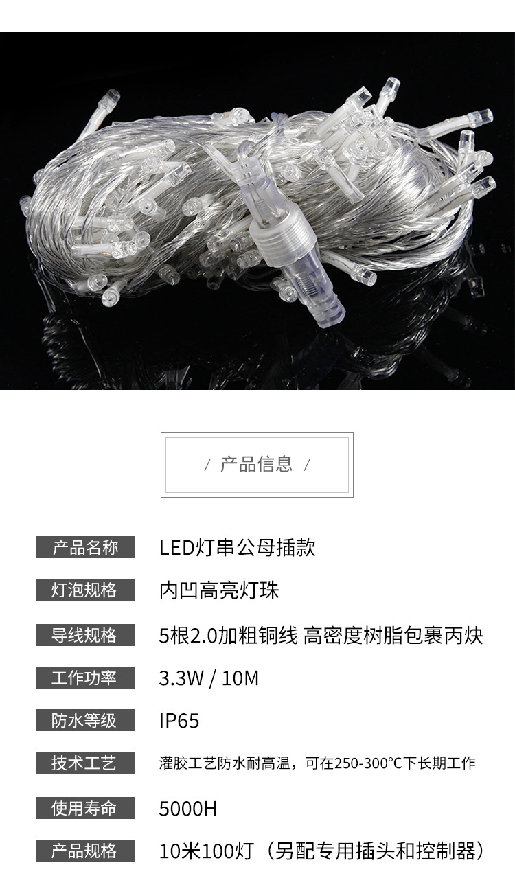 • 100개의 조명이 항상 켜져 있음 3핀 암수 플러그 10m