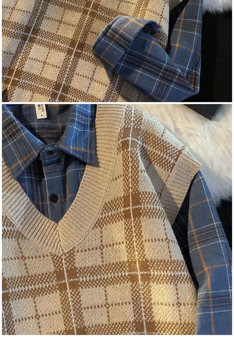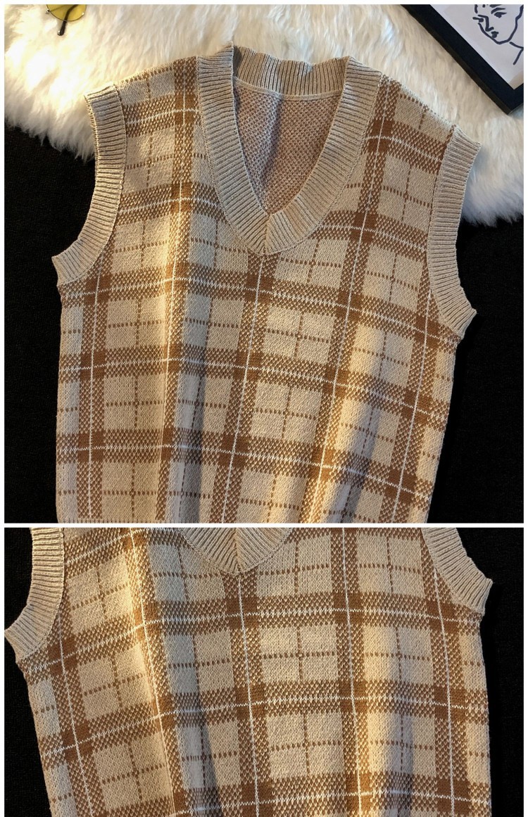 일본 컬러 블록 V 넥 니트 조끼 남자 가을 및 겨울 의상 체크 무늬 조끼 Bf 트렌디 한 브랜드 느슨한 민소매 스웨터스토어 가기