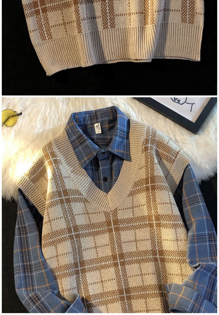 日系拼色V领针织马甲男秋冬外穿格子坎肩背心bf潮牌宽松无袖毛衣