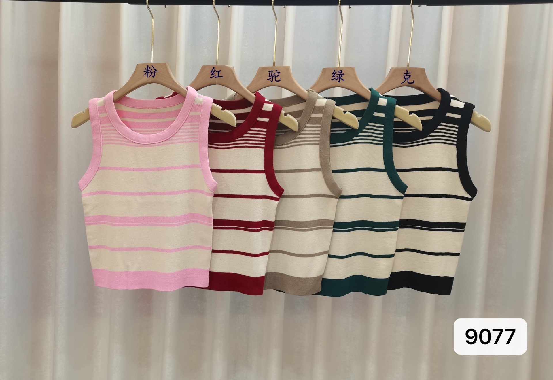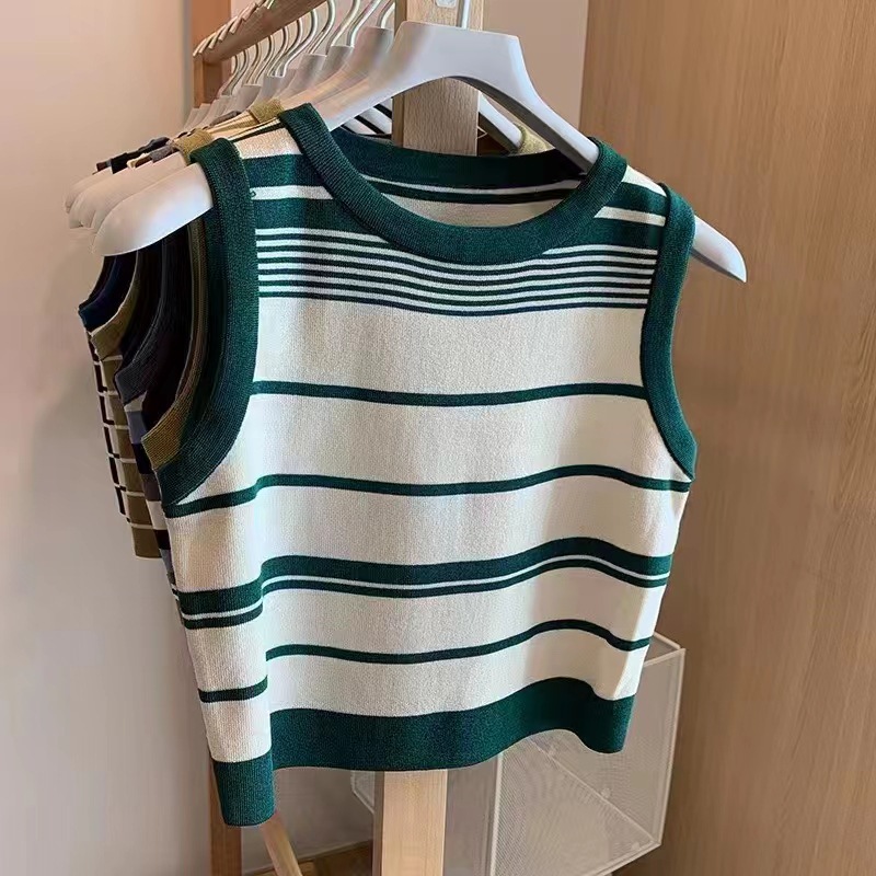 프랑스 달콤한 향신료 줄무늬 민소매 아이스 실크 니트 여성의 2024 여름 여성을위한 새로운 짧은 캐주얼 조끼 탑스토어 가기