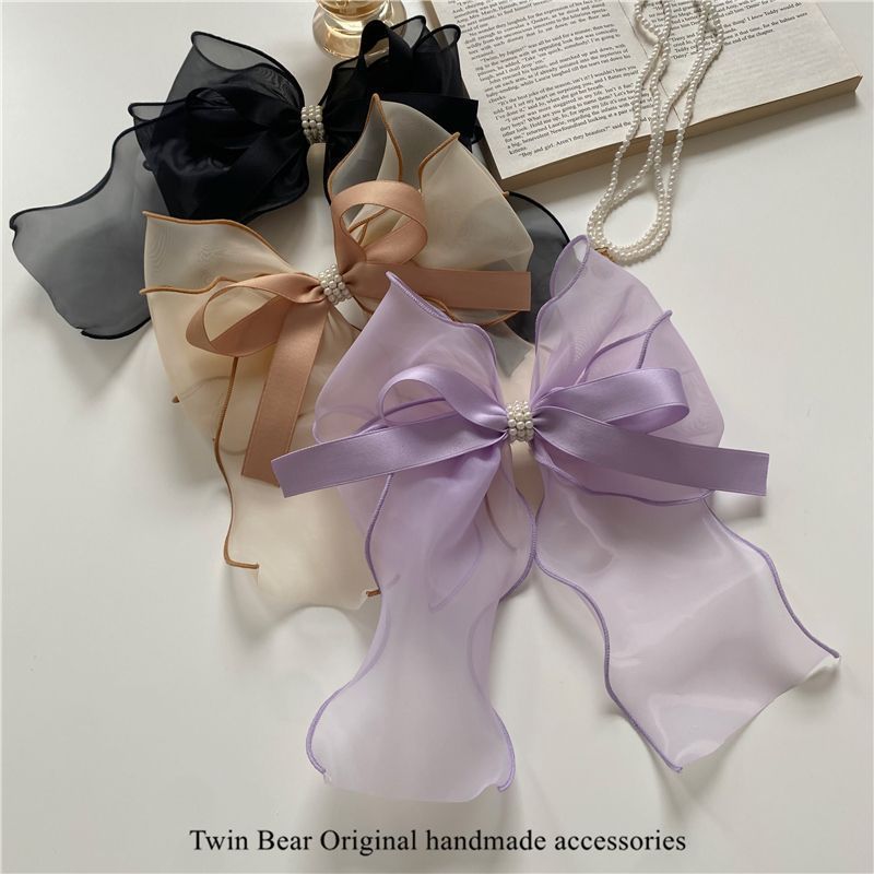 봄과 여름 슈퍼 페어리 메쉬 활 리본 헤어핀 퍼블릭 스타일 올 매치 펄 사이드 클립 백 헤드 스프링 클립 헤드웨어