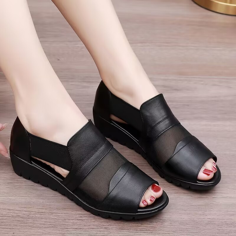 어머니의 샌들 여성 외부 착용 부드러운 가죽 부드러운 바닥 쐐기 물고기 입 중년 및 노인 여성 신발 여름 2024 새로운 샌들 배치