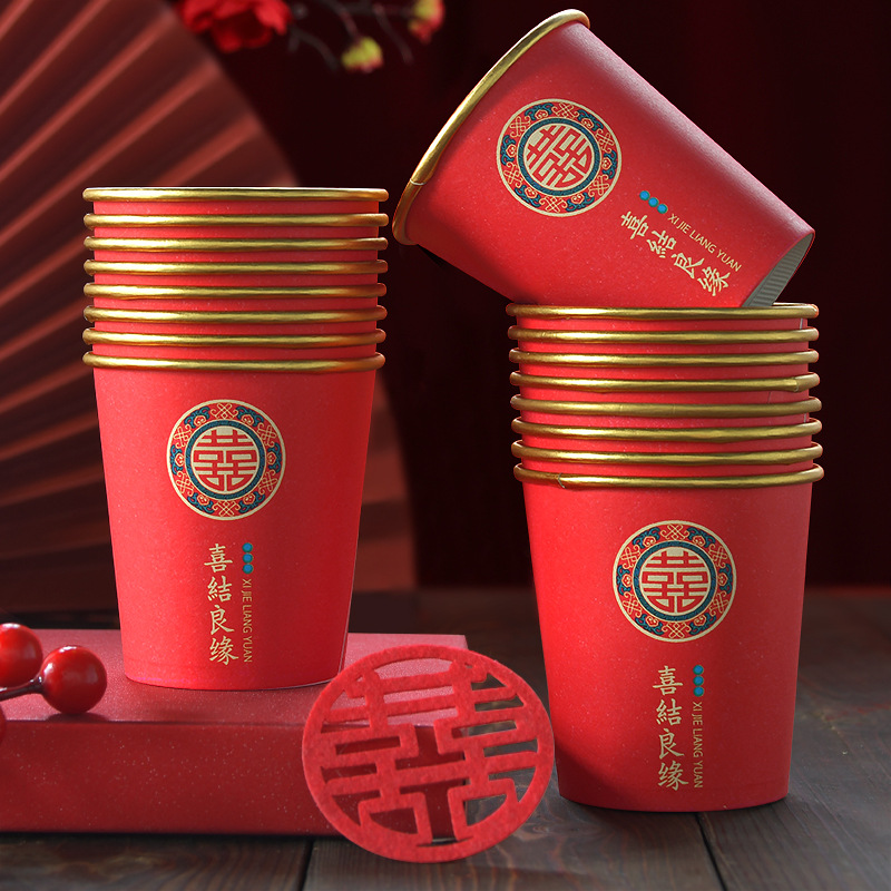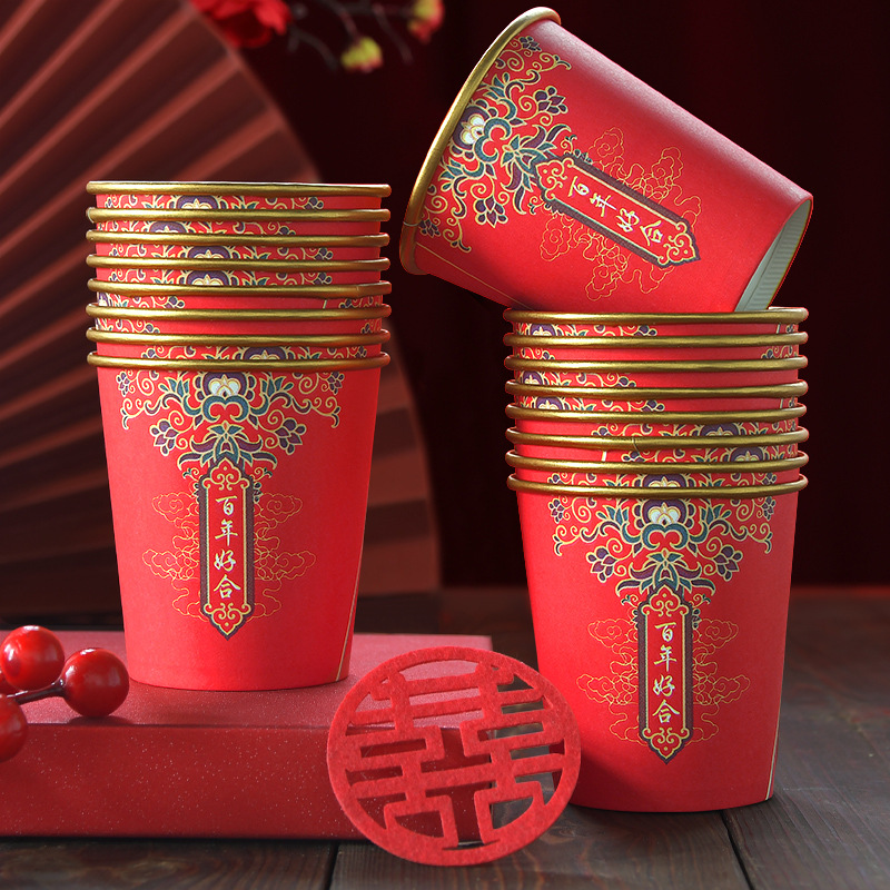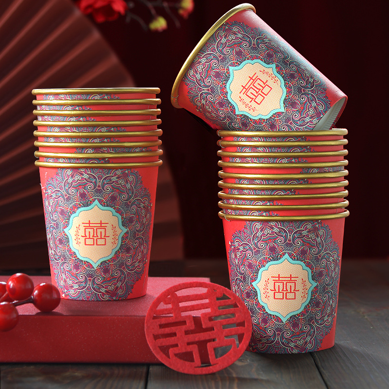 웨딩 일회용 골드 호일 두꺼운 종이컵 웨딩 약혼 컵 웨딩 연회 축제 가정용 레드 티 컵