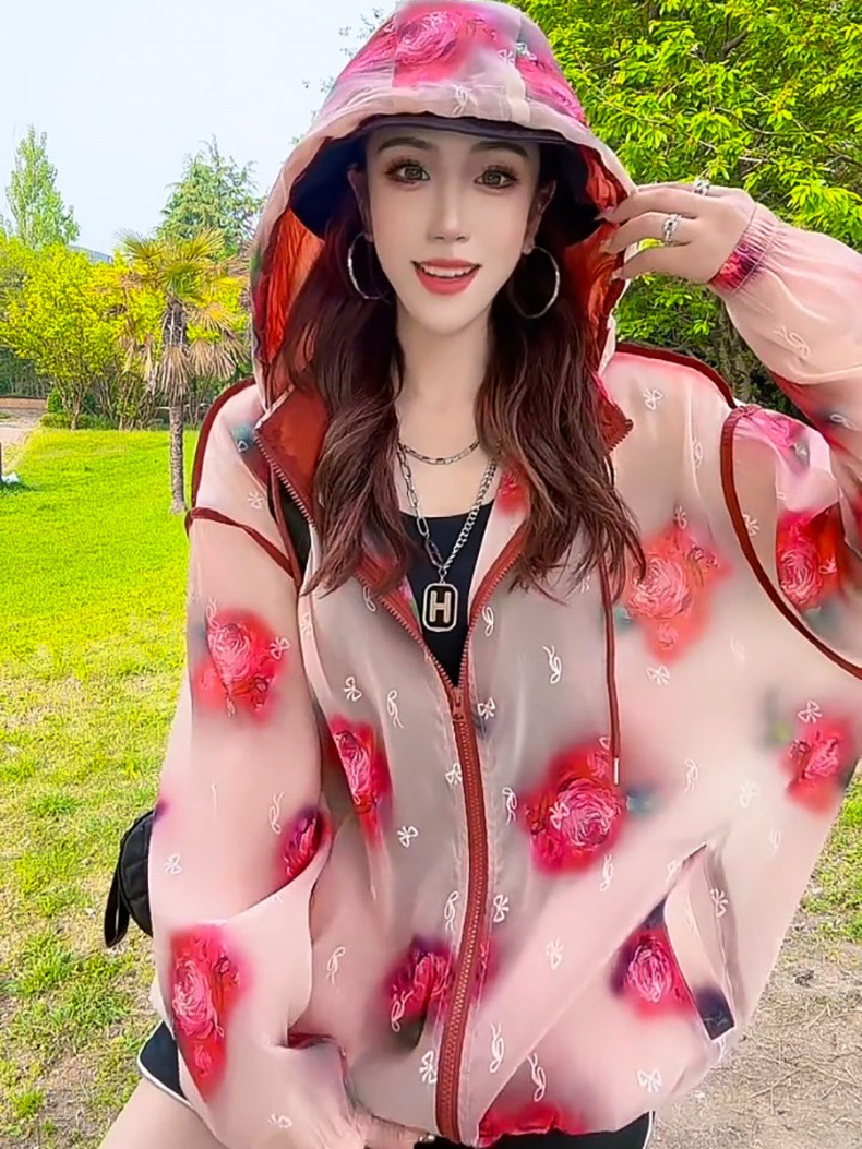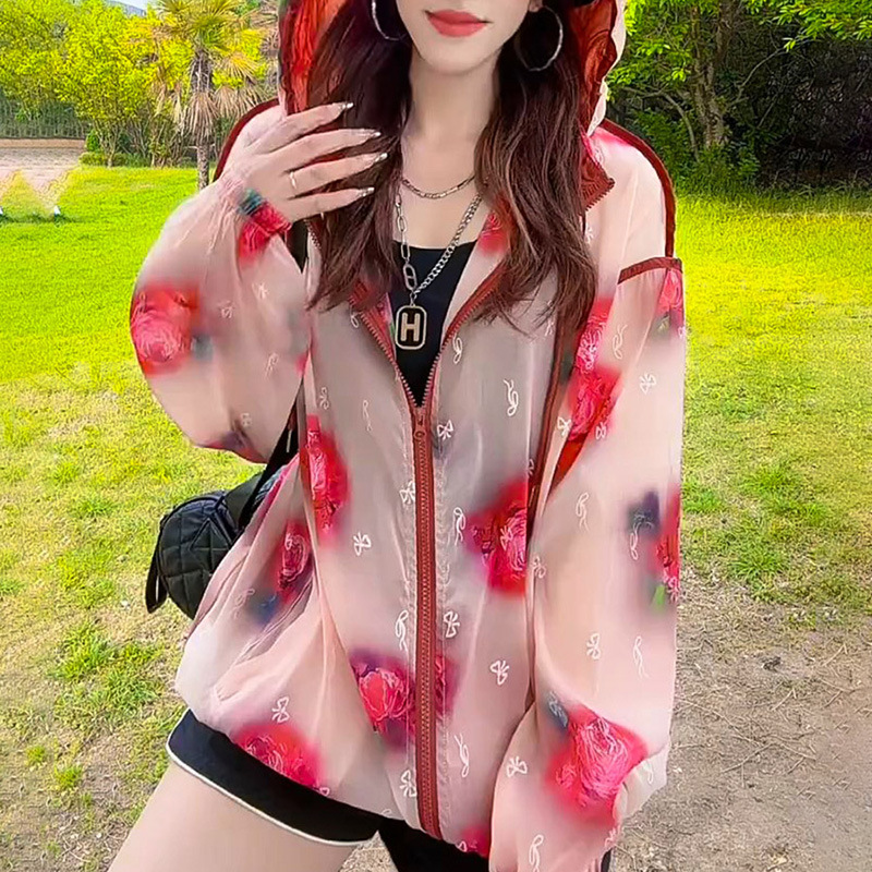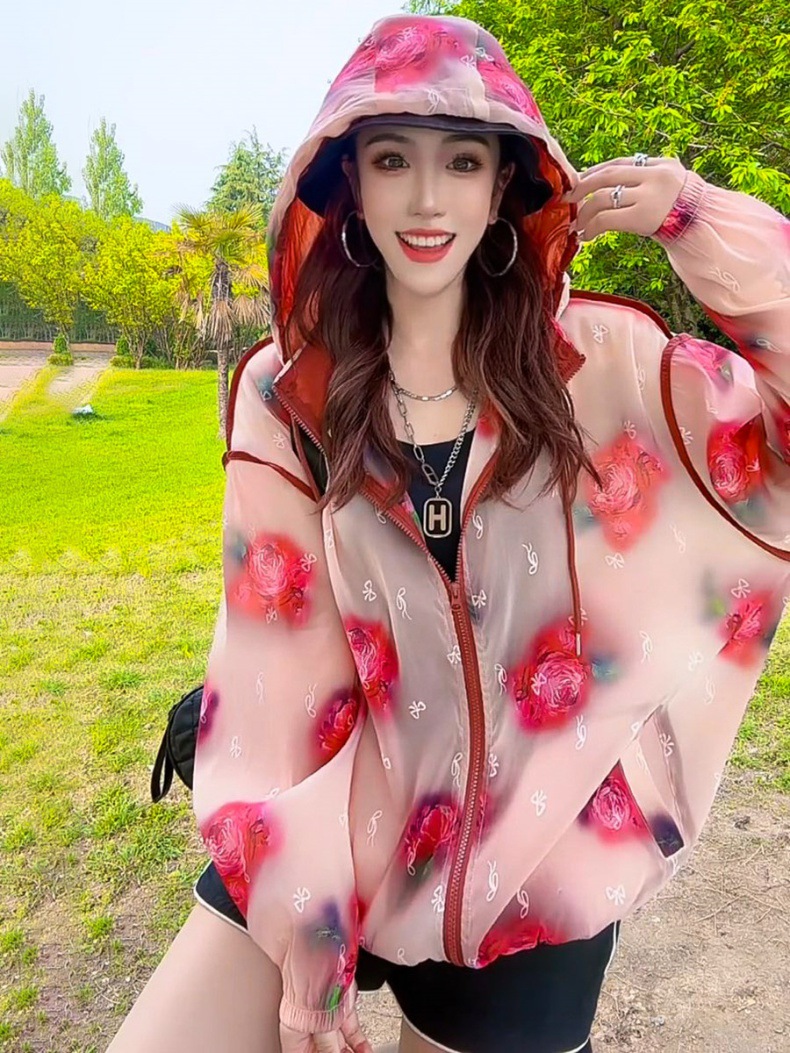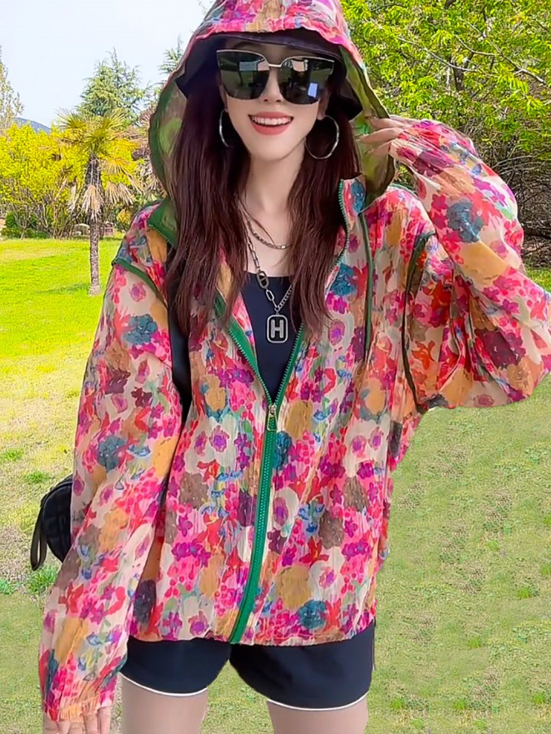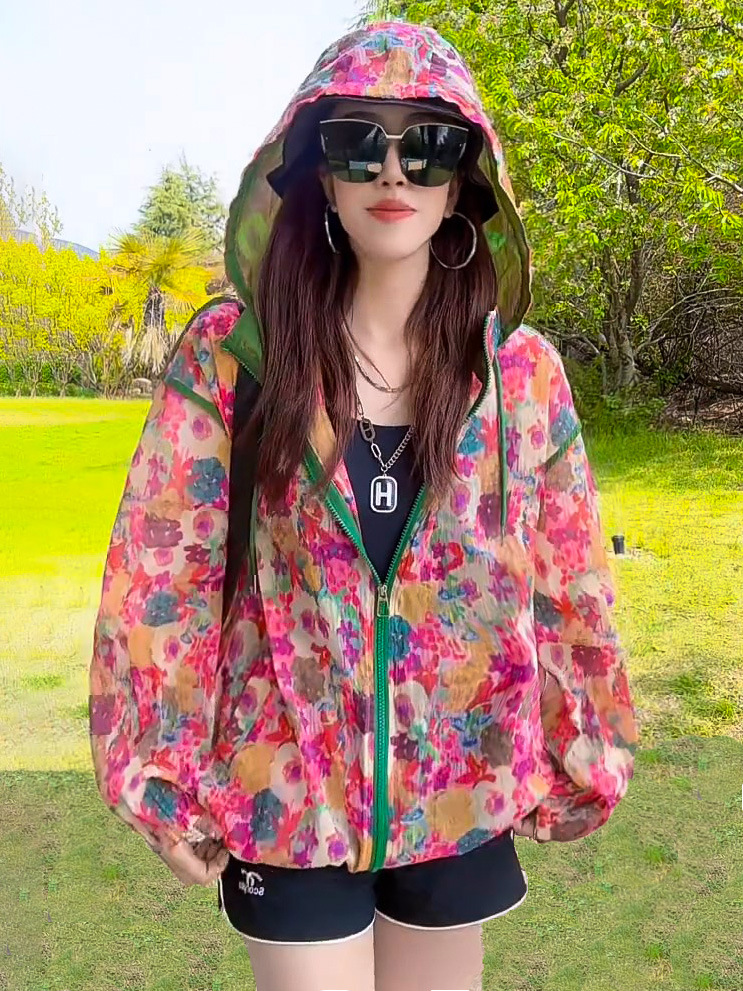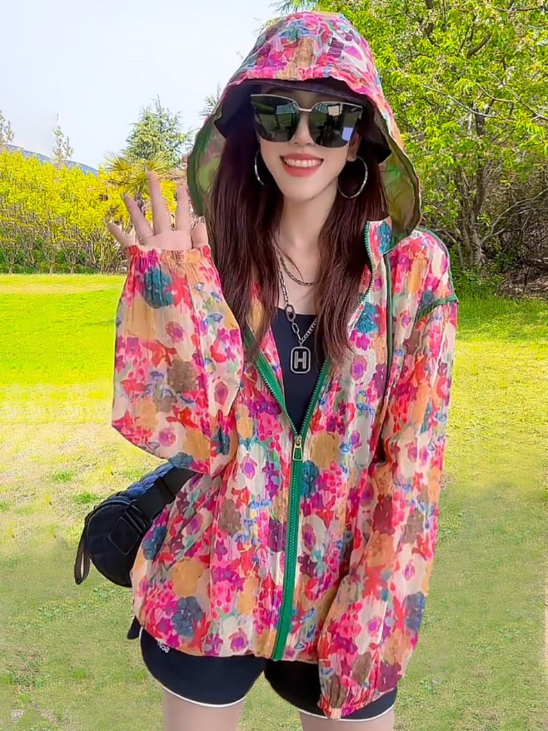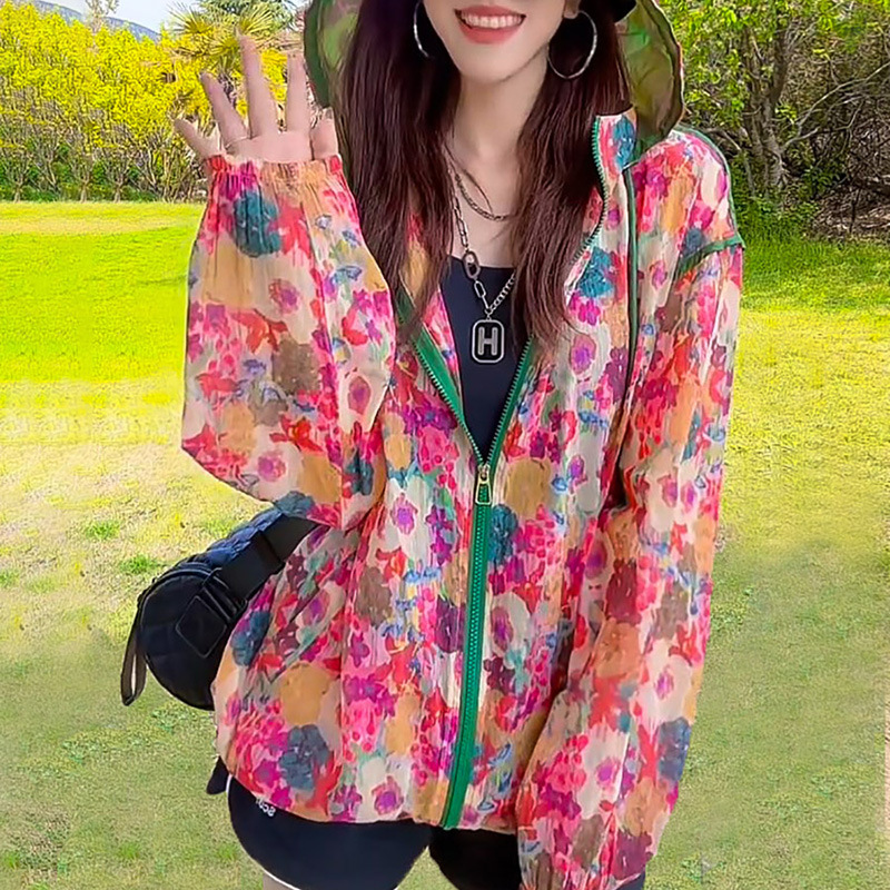 여성용 한국 스타일 아이스 실크 후드 자외선 차단 의류, 한국 스타일의 루즈하고 얇은 꽃무늬 카디건 탑, 캐주얼하고 다용도 재킷