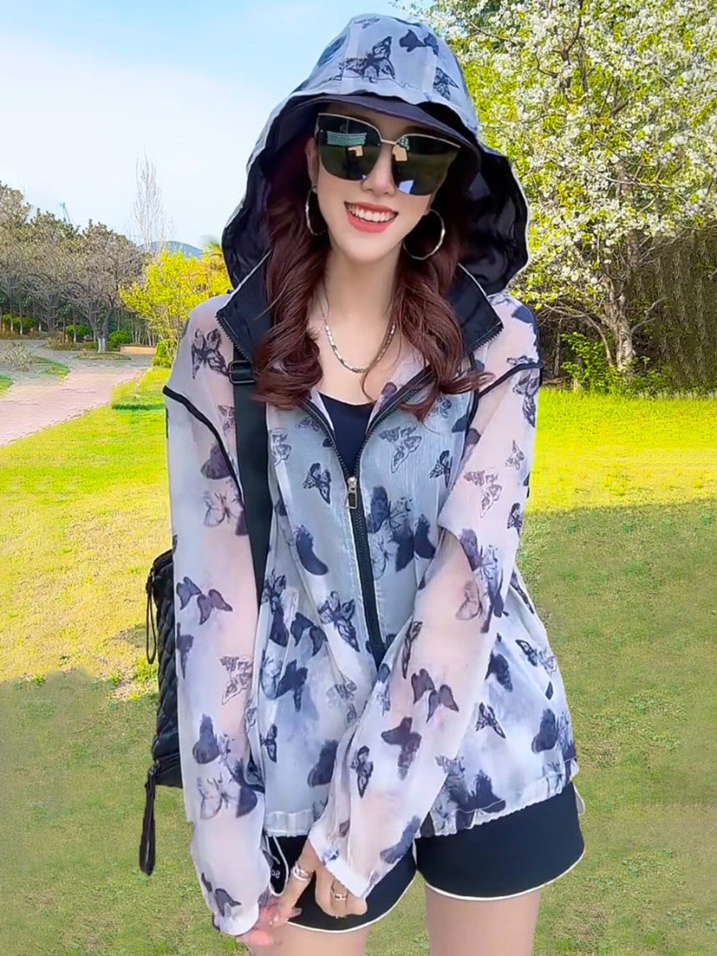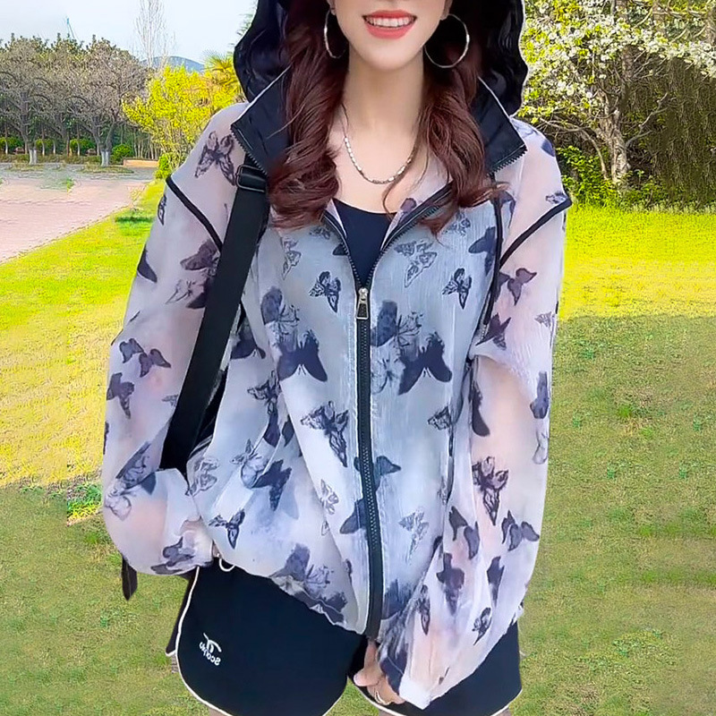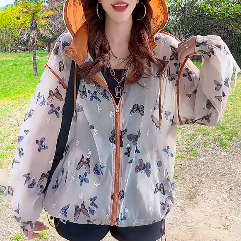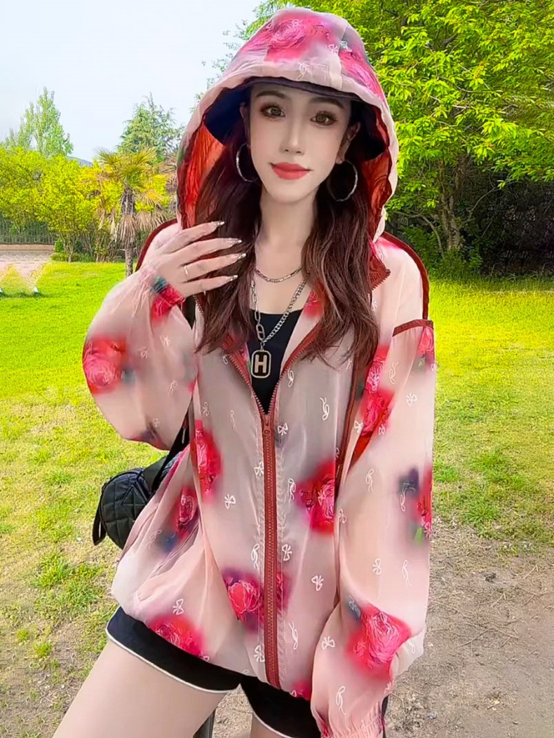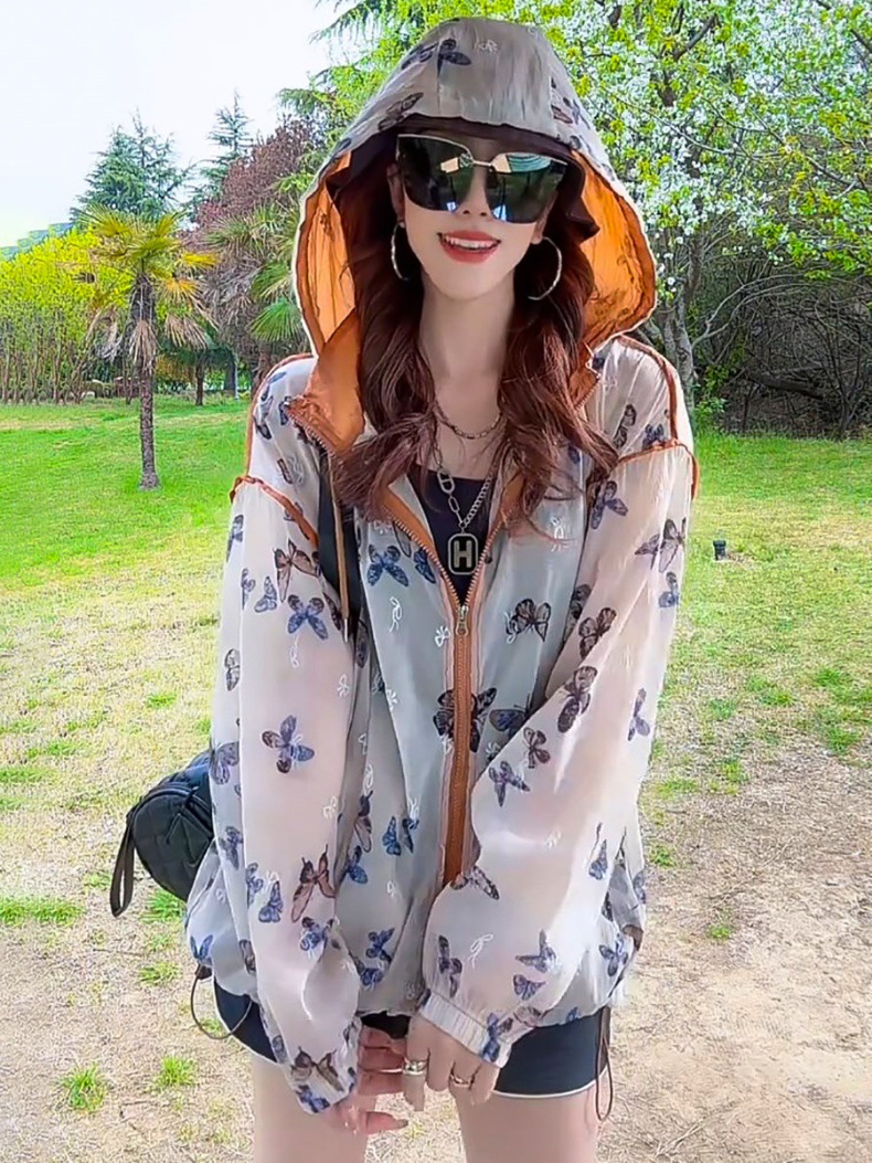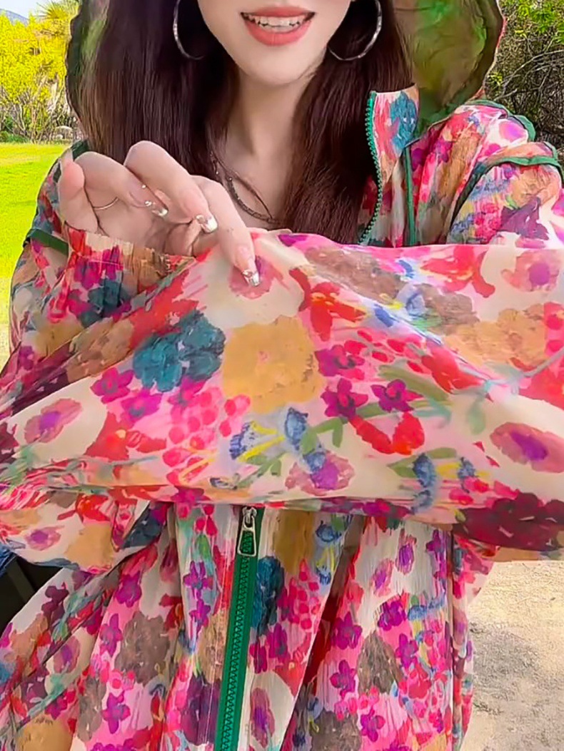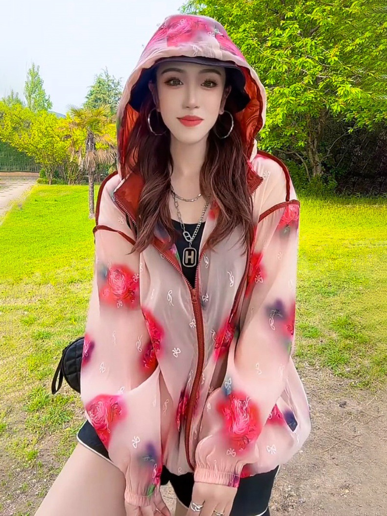 여성용 한국 스타일 아이스 실크 후드 자외선 차단 의류, 한국 스타일의 루즈하고 얇은 꽃무늬 카디건 탑, 캐주얼하고 다용도 재킷