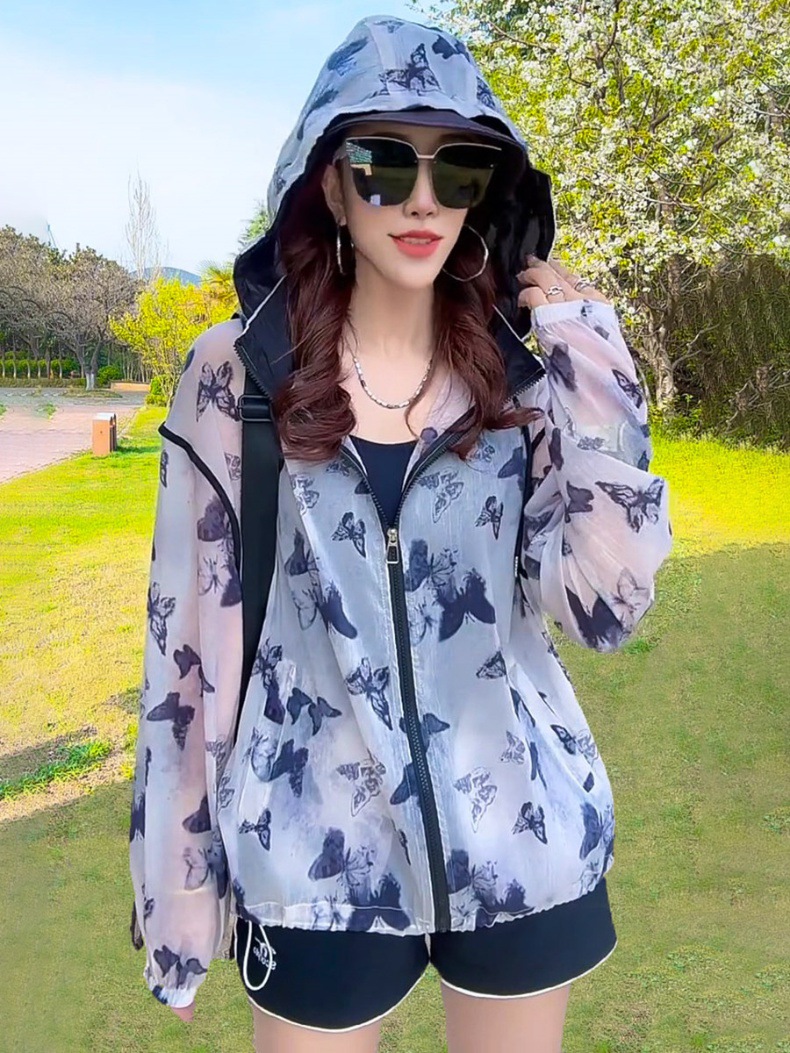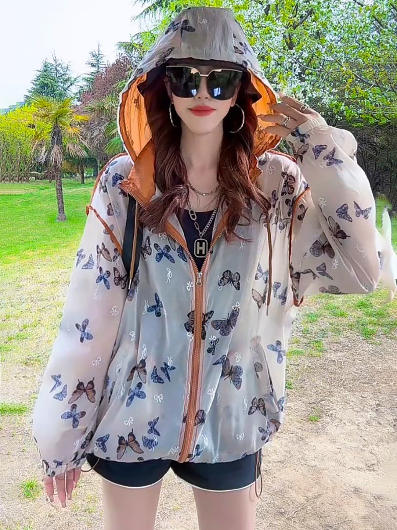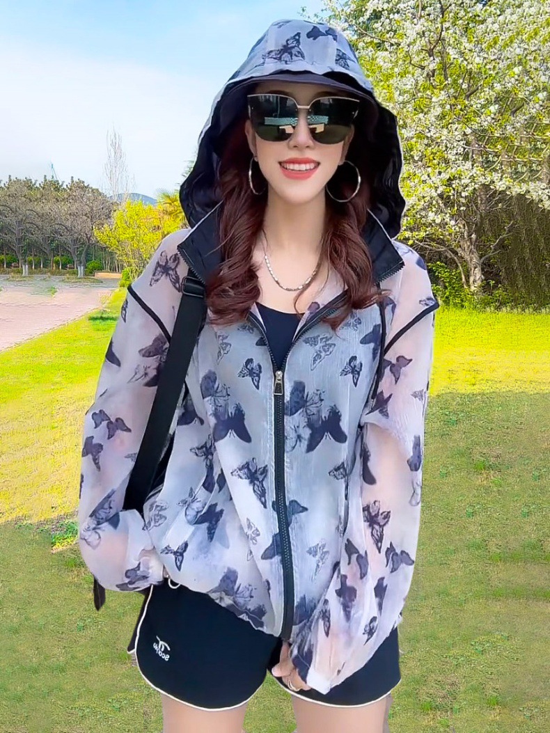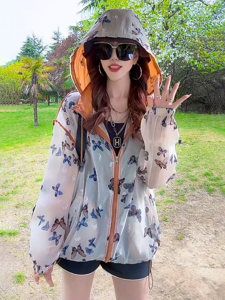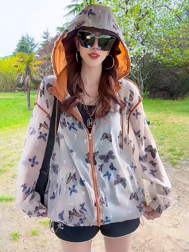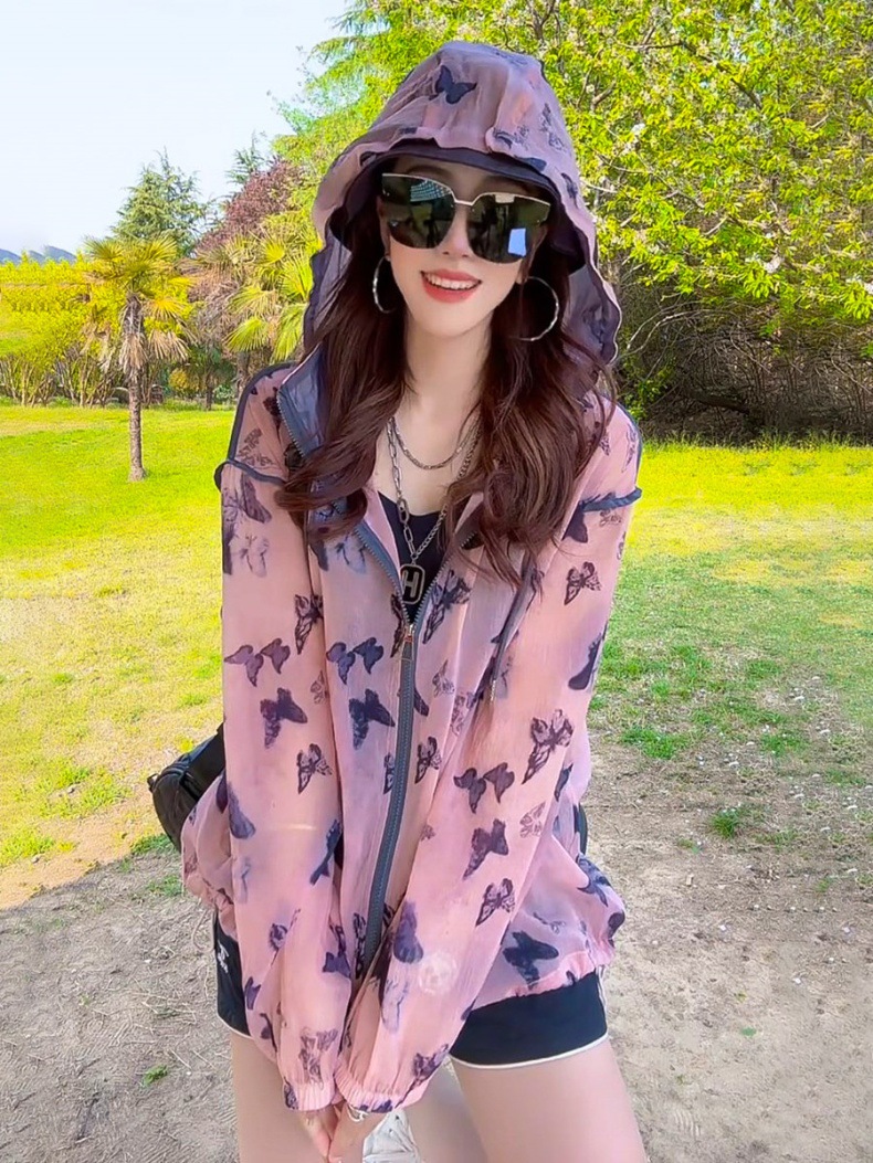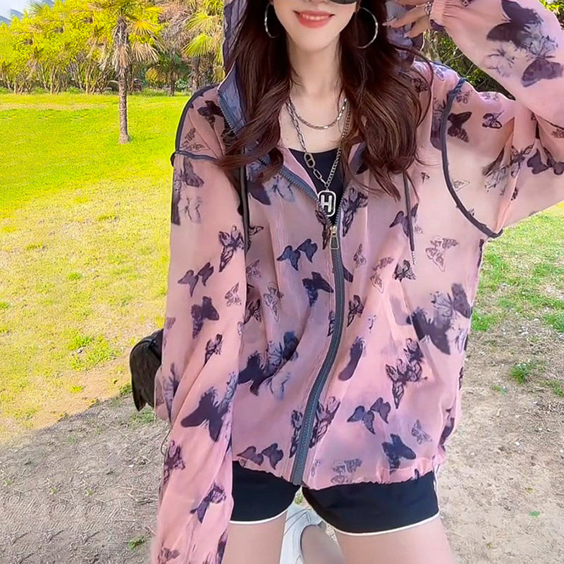 여성용 한국 스타일 아이스 실크 후드 자외선 차단 의류, 한국 스타일의 루즈하고 얇은 꽃무늬 카디건 탑, 캐주얼하고 다용도 재킷
