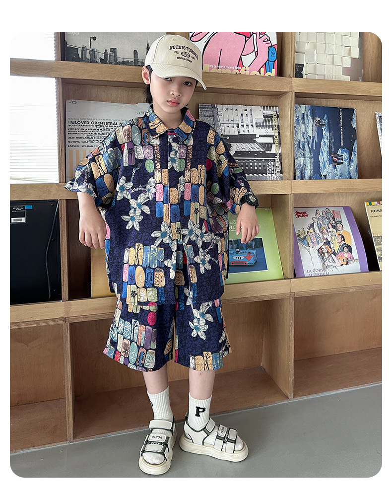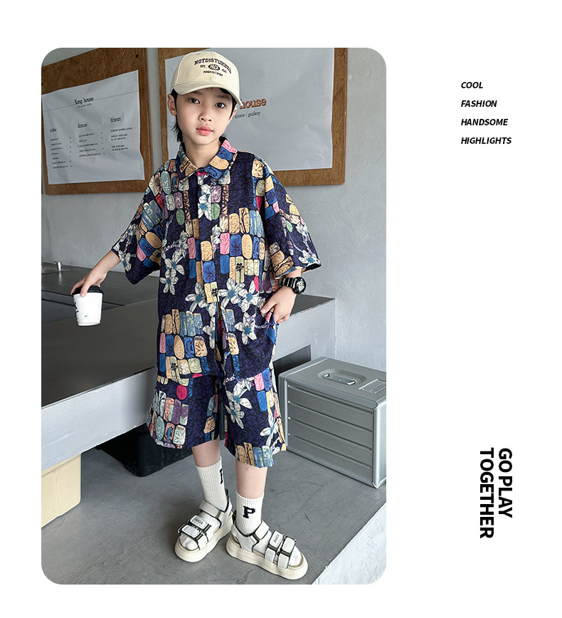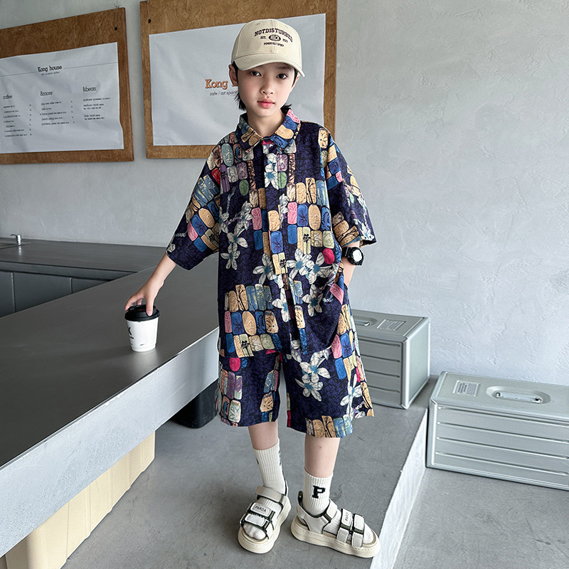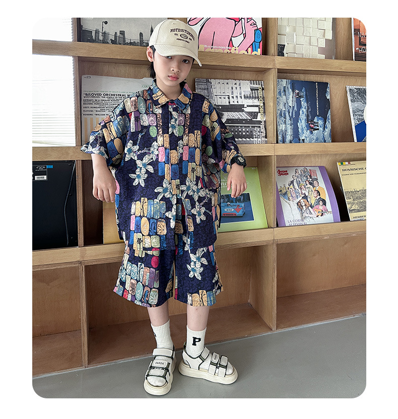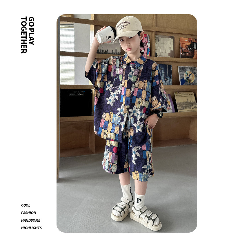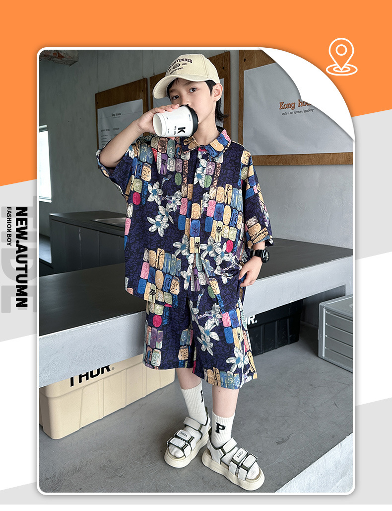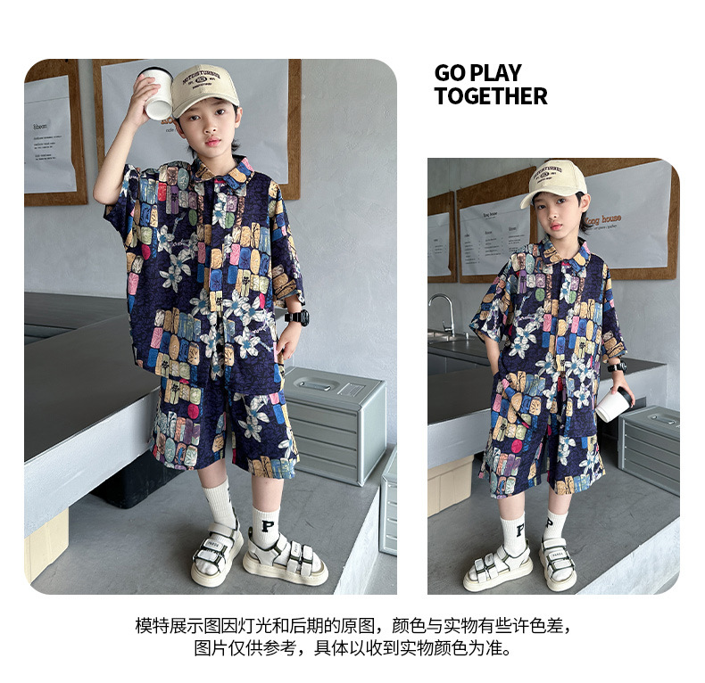 여름용 남아 반팔 셔츠 반바지 세트 신상 아동복 남아 반바지 투피스 세트 개성 넘치는 트렌디스토어 가기