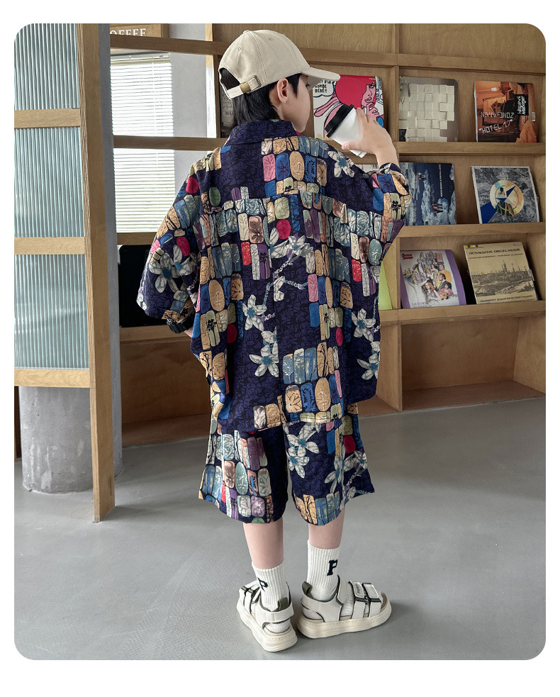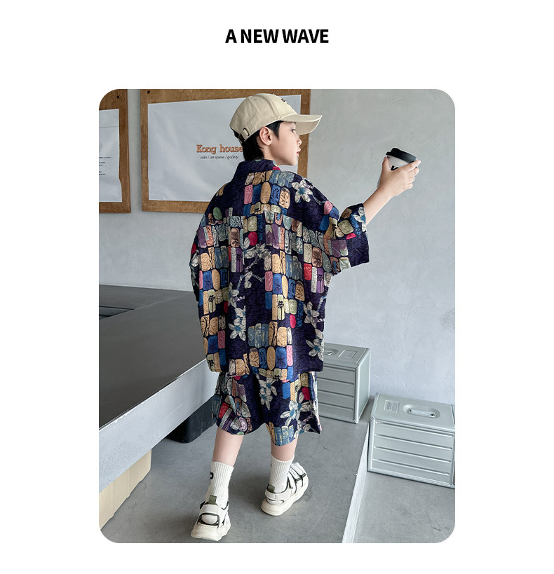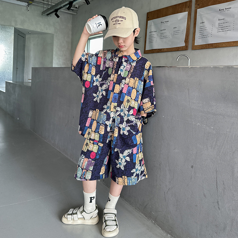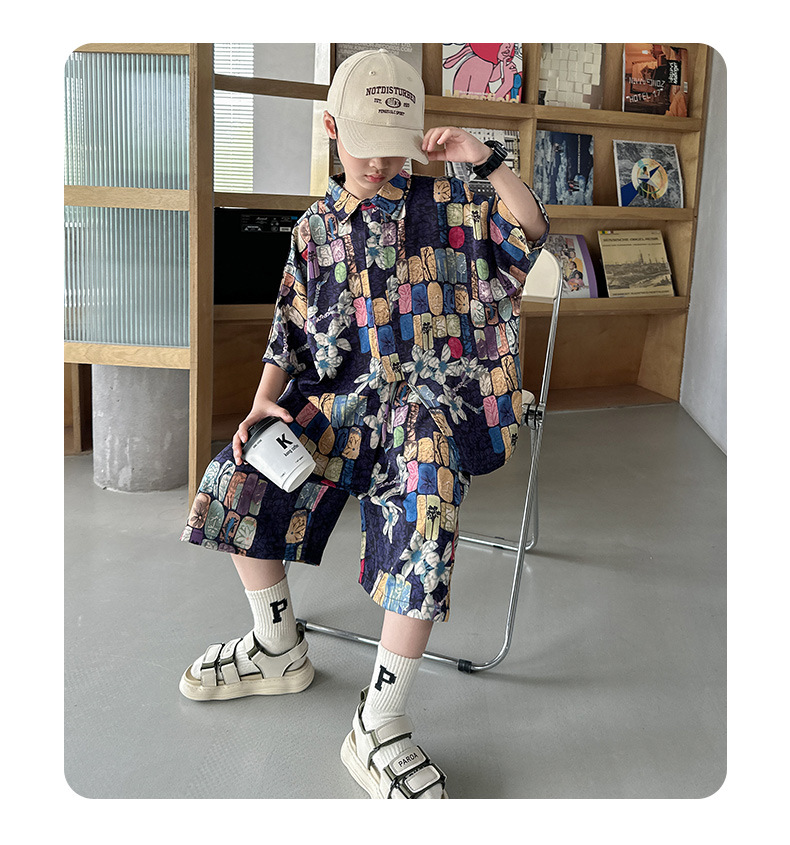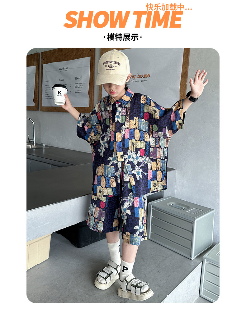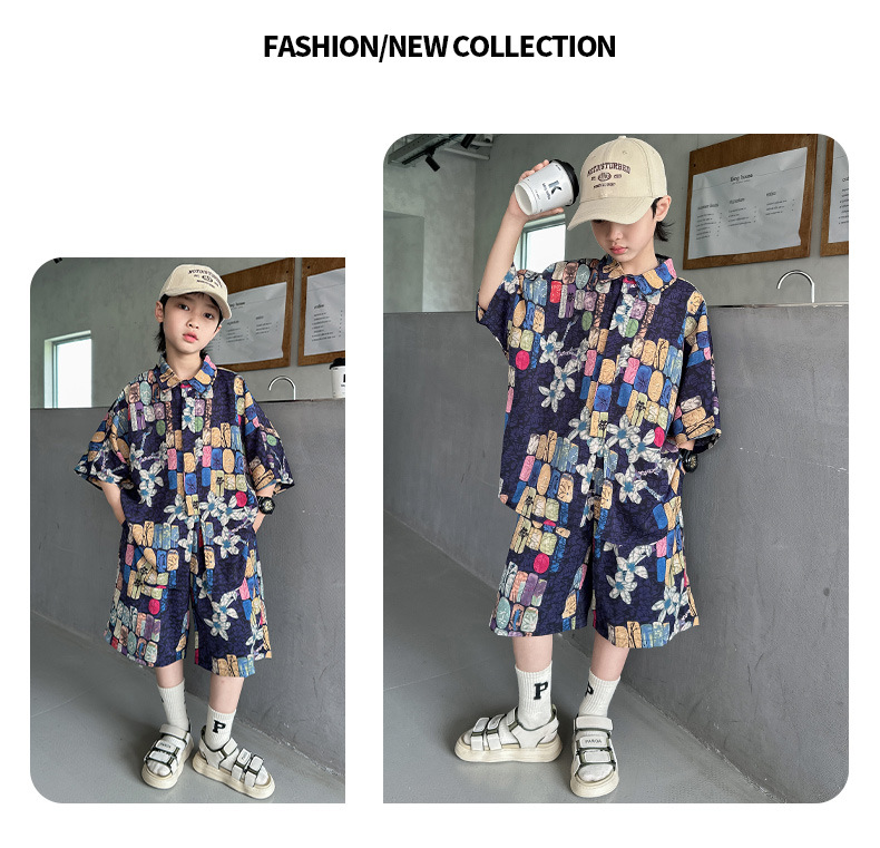 여름용 남아 반팔 셔츠 반바지 세트 신상 아동복 남아 반바지 투피스 세트 개성 넘치는 트렌디스토어 가기
