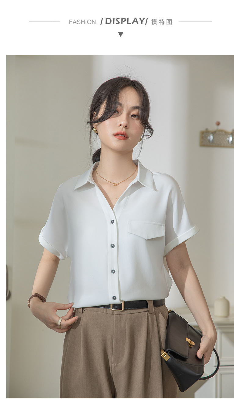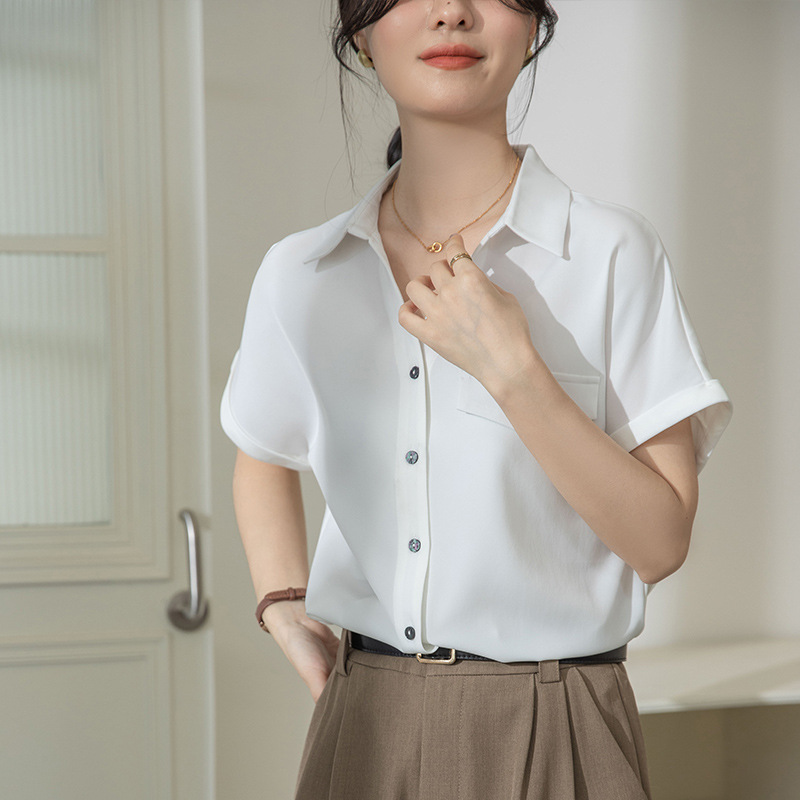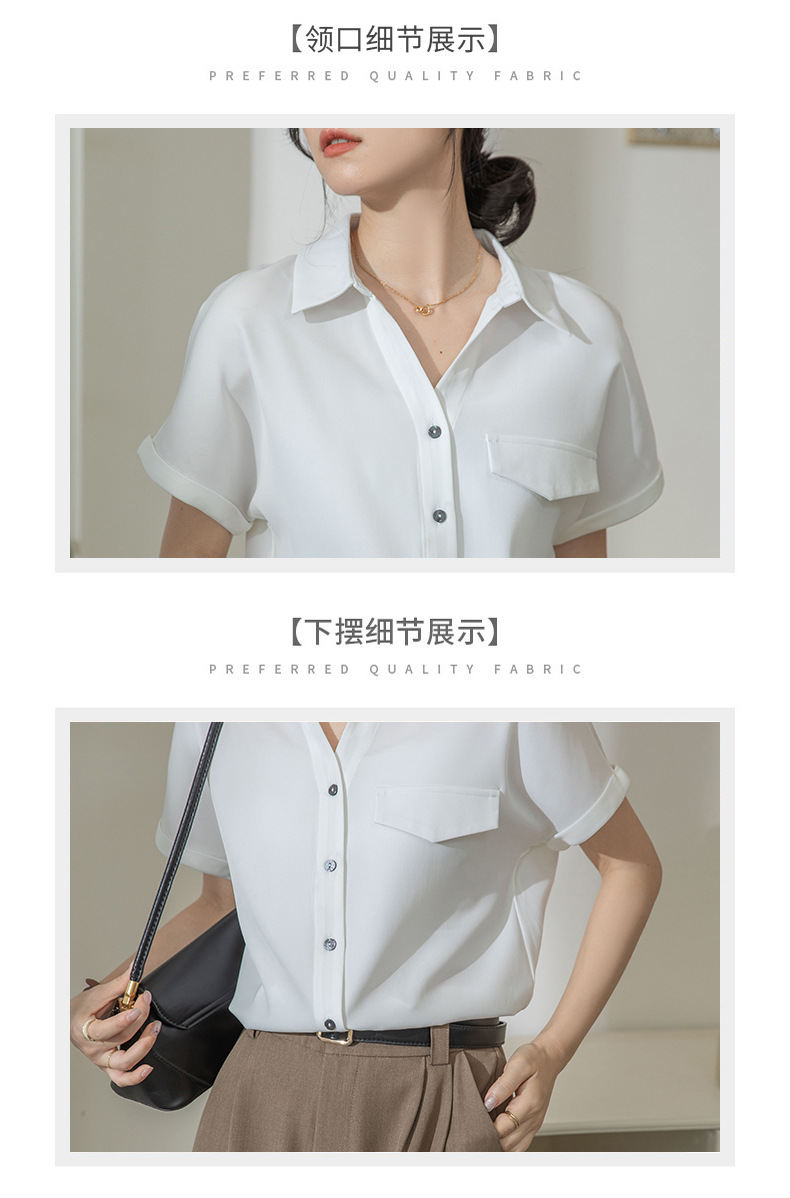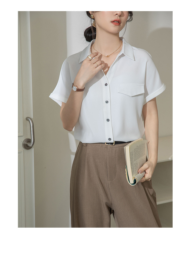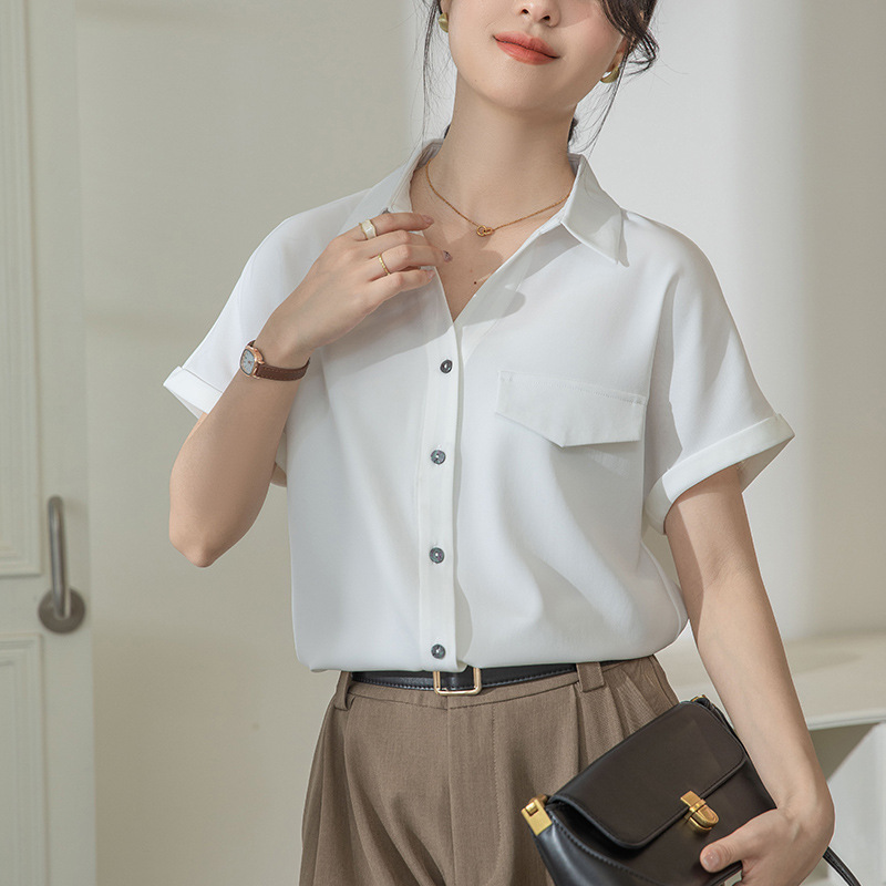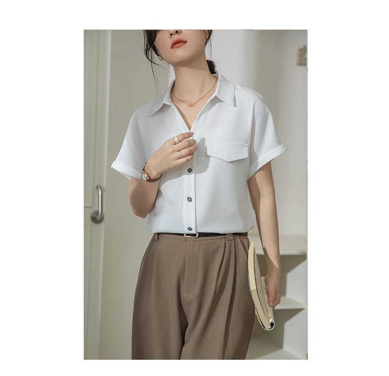 리얼 샷 여름 프랑스 새틴 어깨 반팔 화이트 셔츠 여자 올 매치 드랩 V 넥 셔츠 통근자 최고 슬리밍스토어 가기
