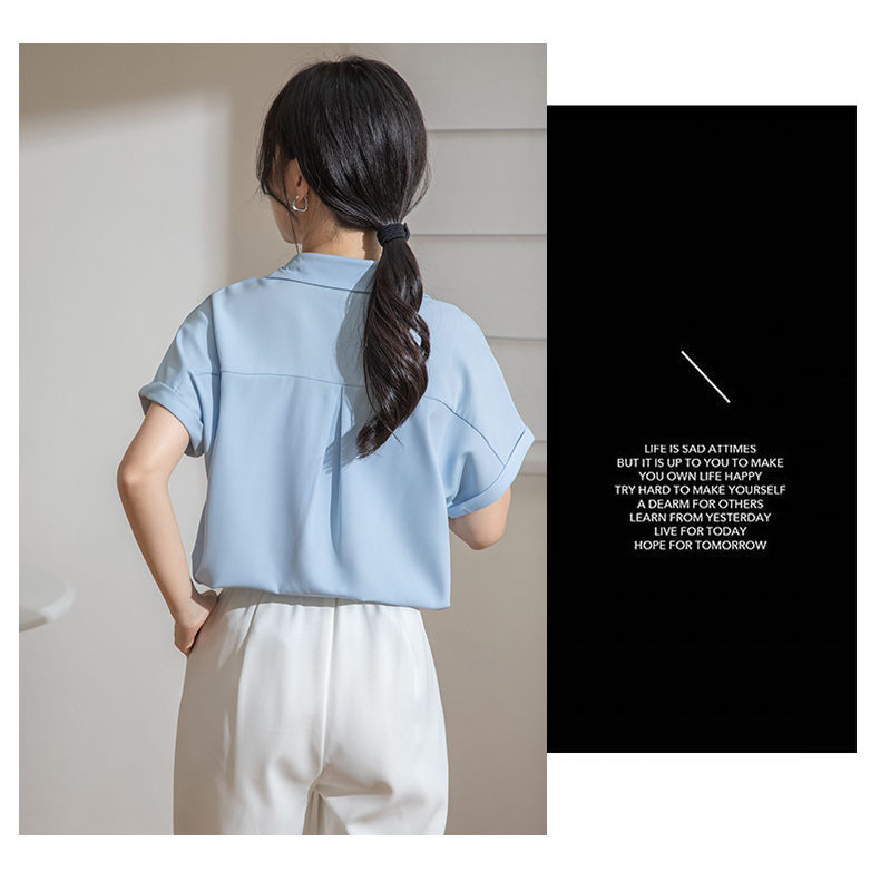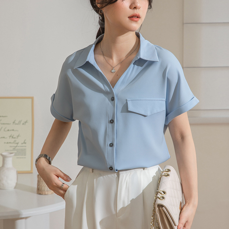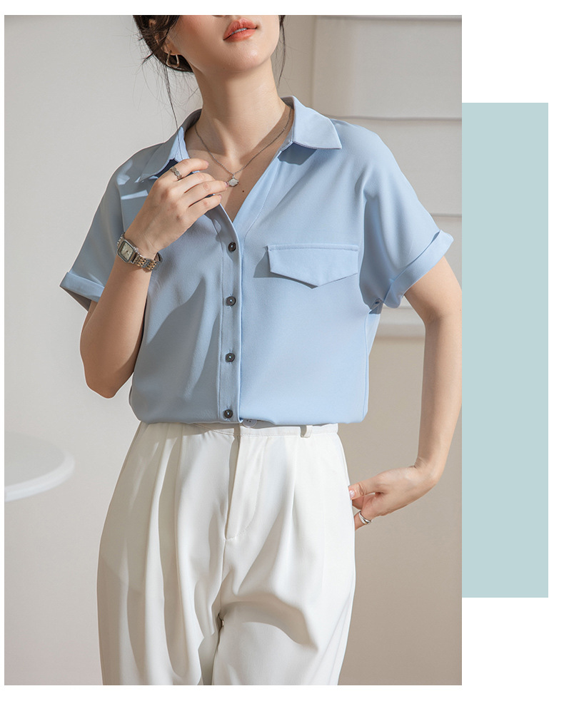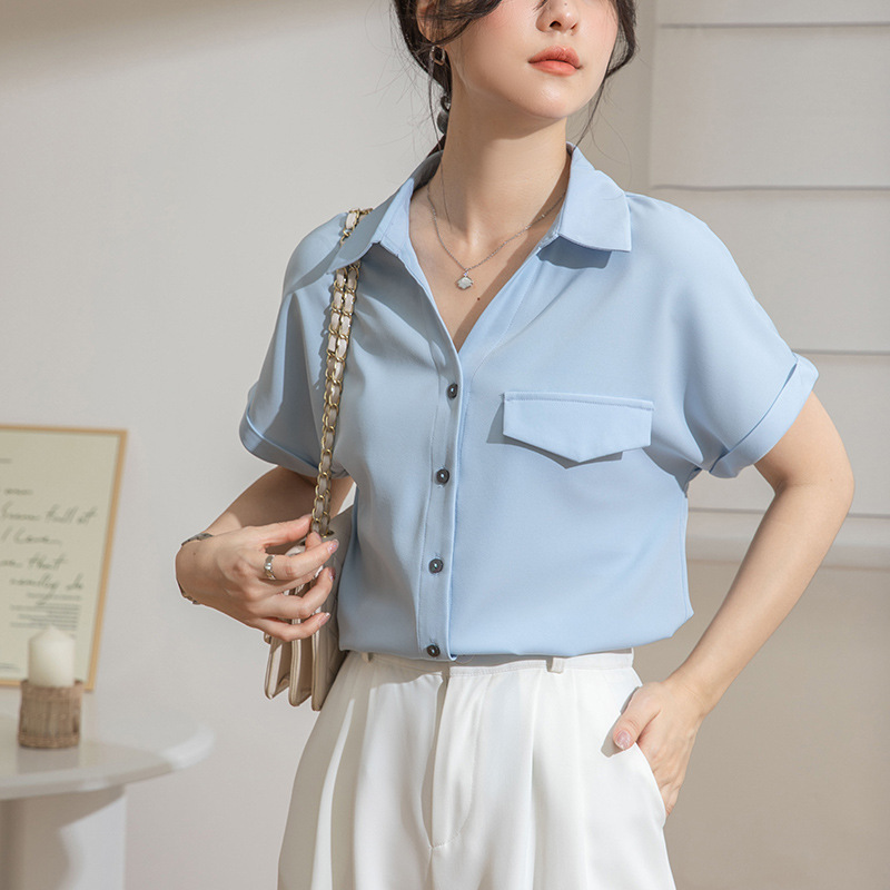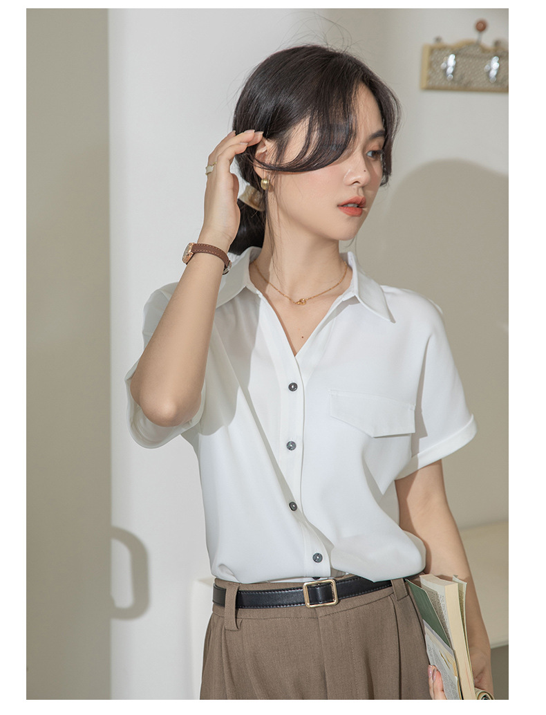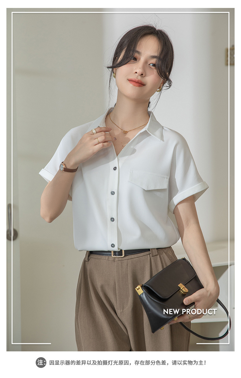 리얼 샷 여름 프랑스 새틴 어깨 반팔 화이트 셔츠 여자 올 매치 드랩 V 넥 셔츠 통근자 최고 슬리밍스토어 가기