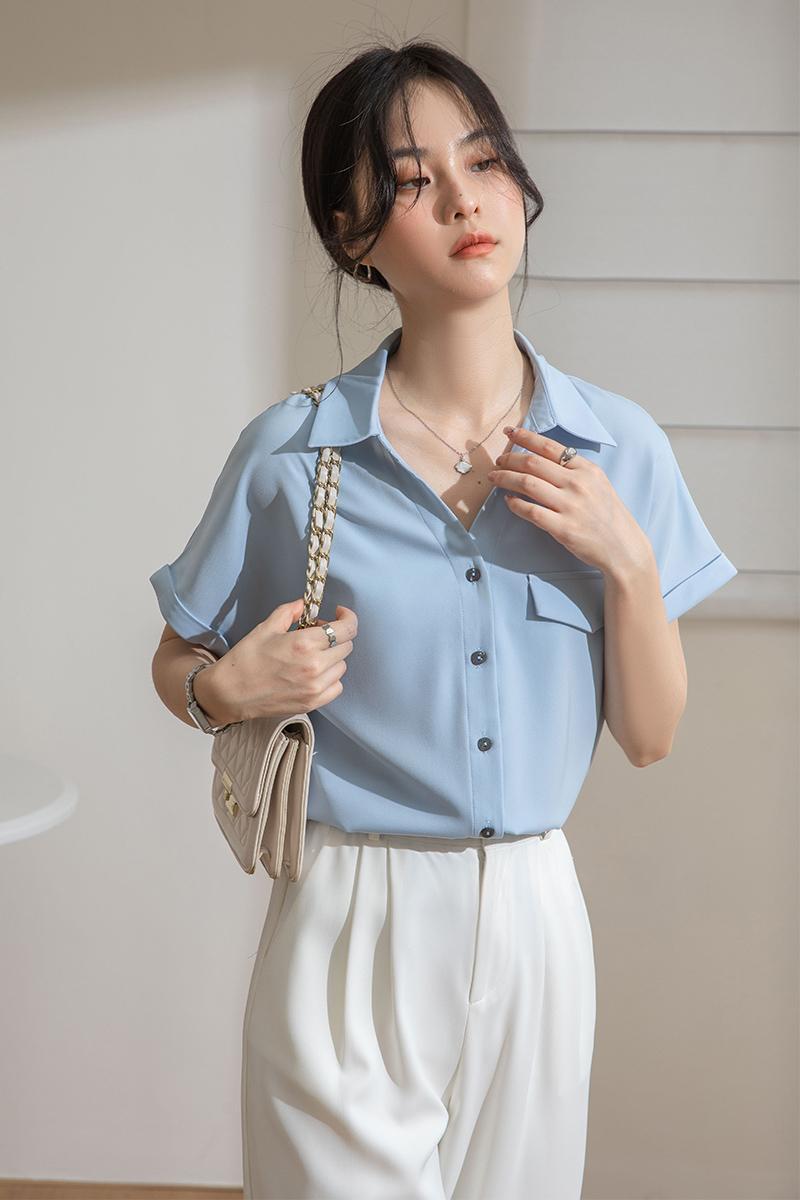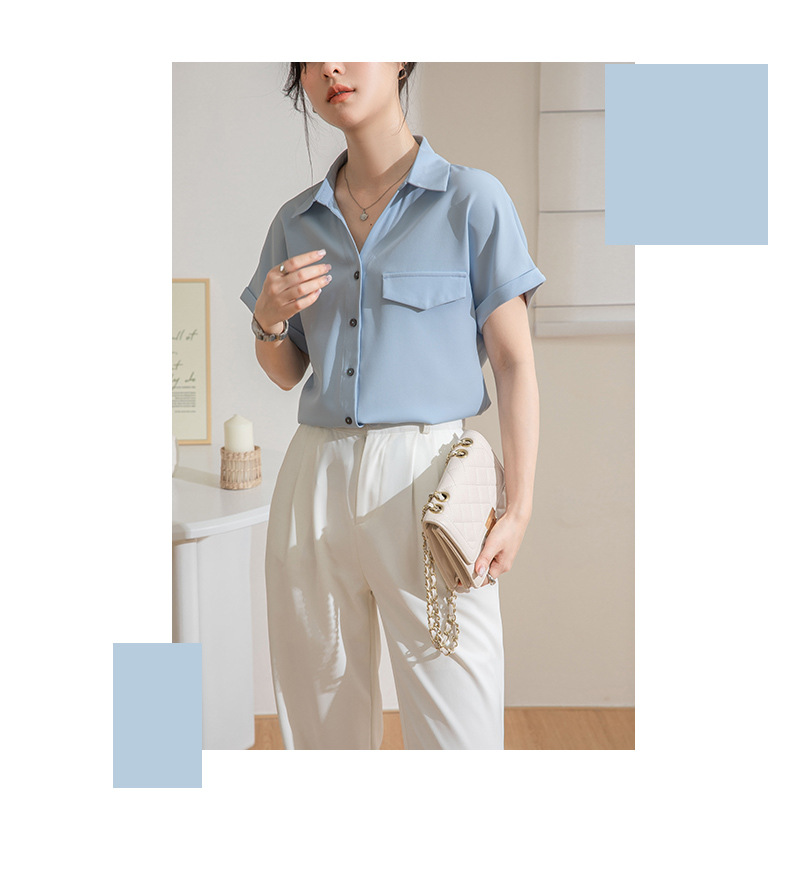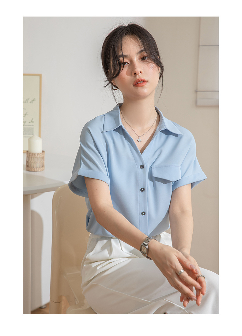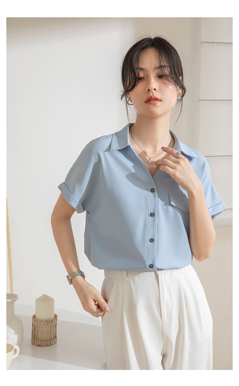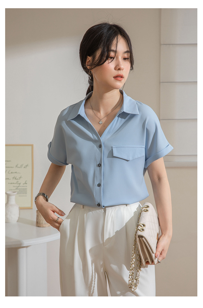 리얼 샷 여름 프랑스 새틴 어깨 반팔 화이트 셔츠 여자 올 매치 드랩 V 넥 셔츠 통근자 최고 슬리밍스토어 가기