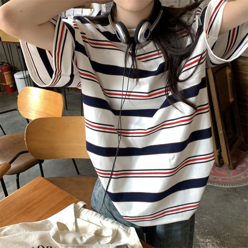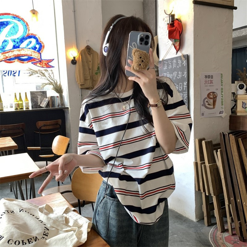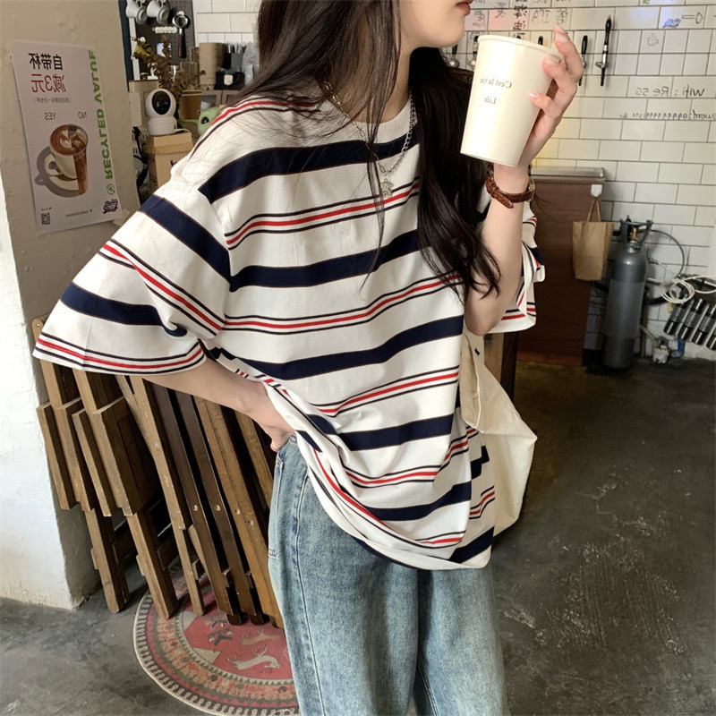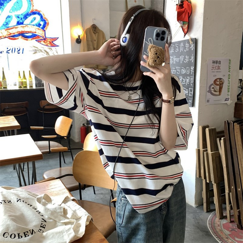 국경 간 재고 2024 여성을위한 올 매치 스트라이프 루즈 젠틀 반팔 티셔츠 여름 BF 스타일 캐주얼 게으른 스타일 탑