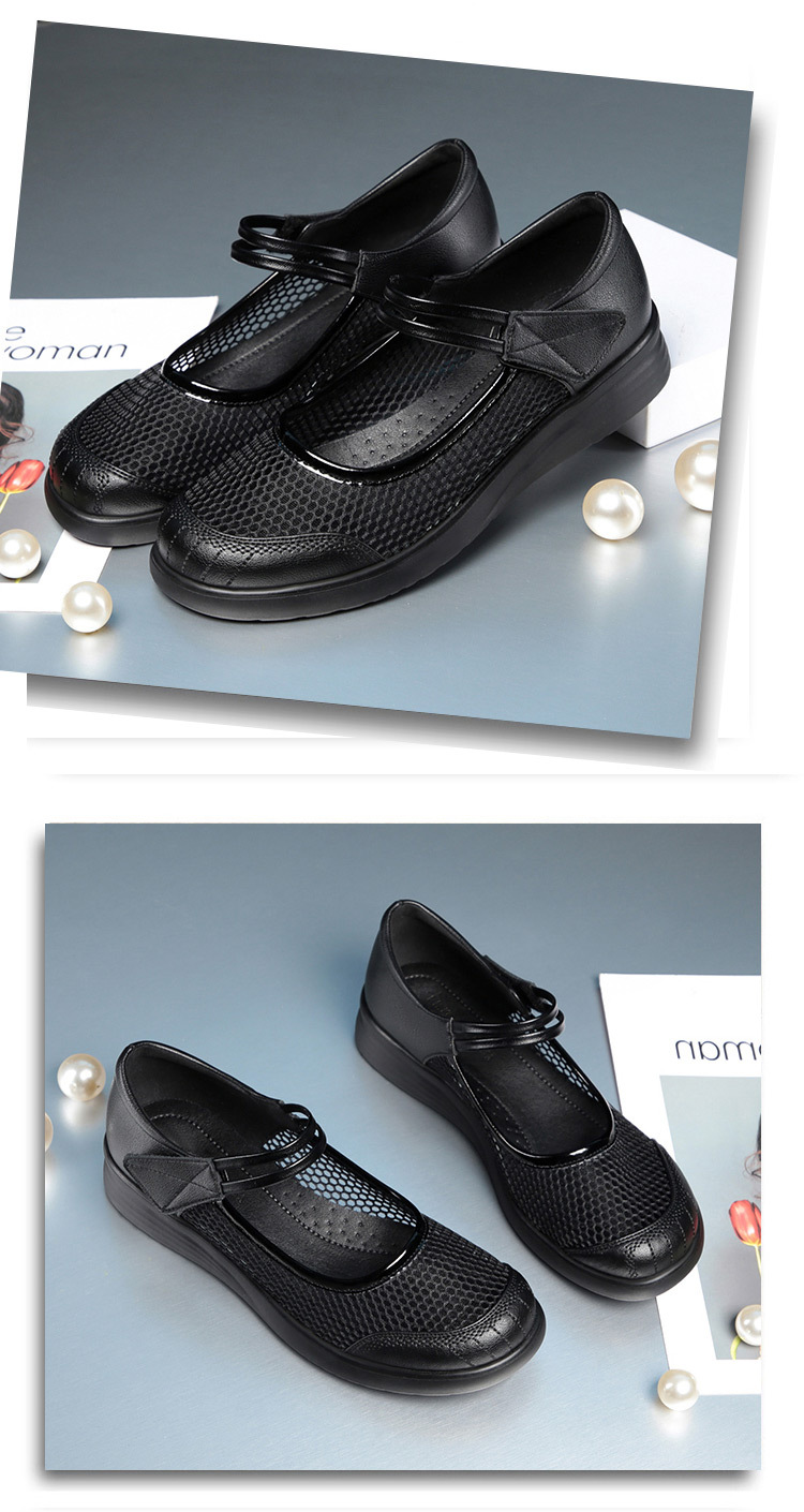 부드러운 바닥 어머니 신발 속이 빈 통기성 미끄럼 방지 평면 가죽 신발 여름 여성 신발 부드러운 가죽 편안한 중년 및 노인 여성 신발