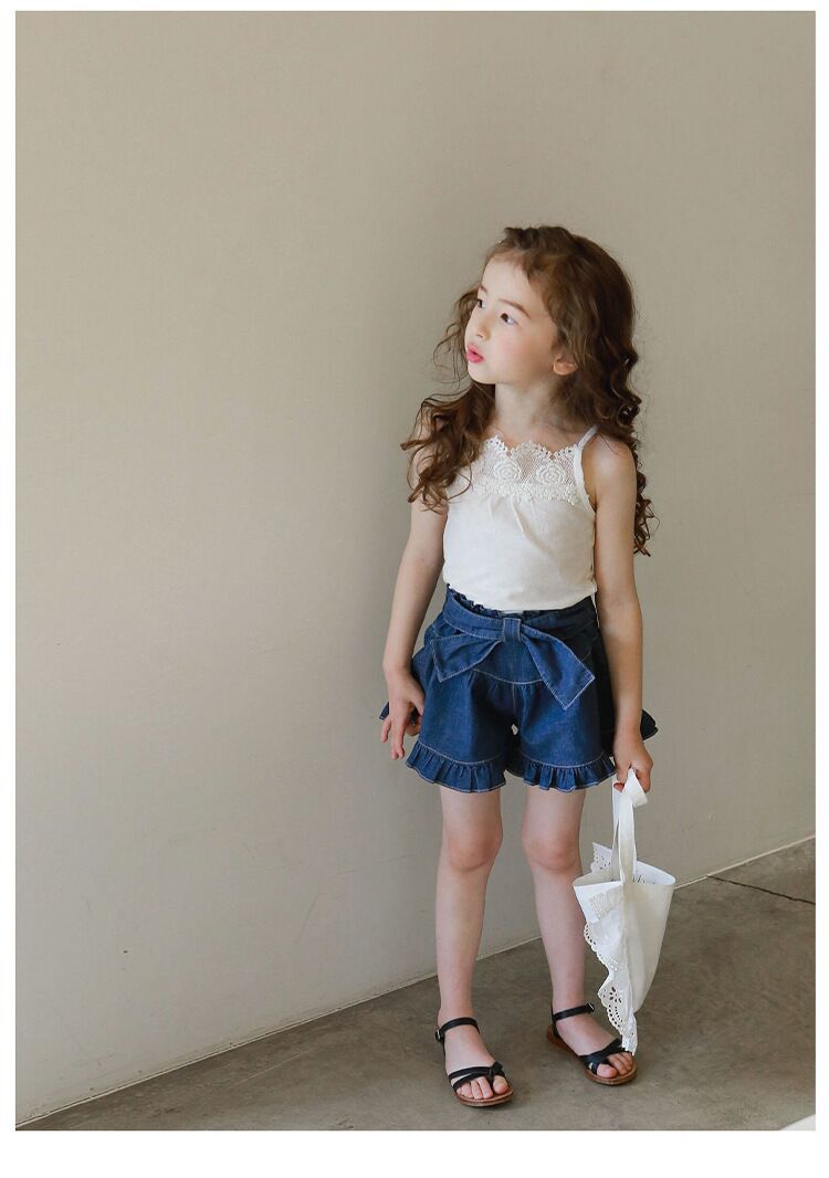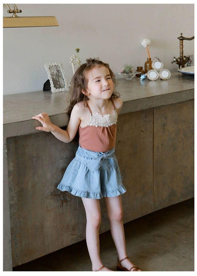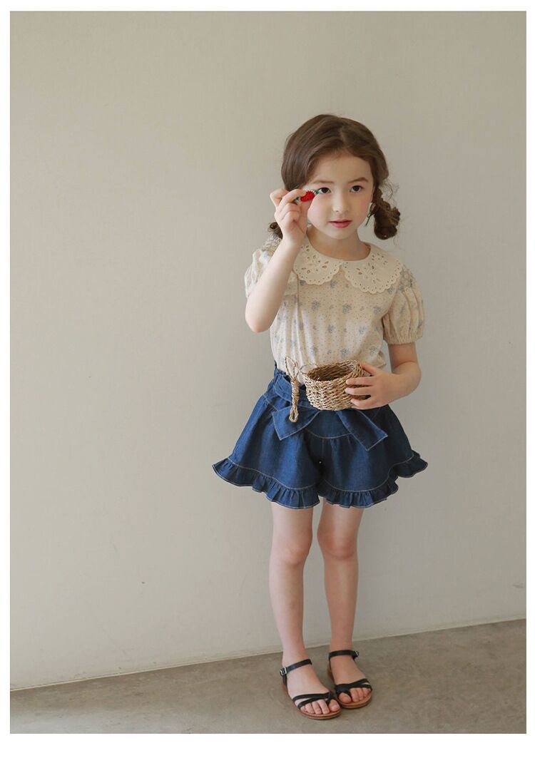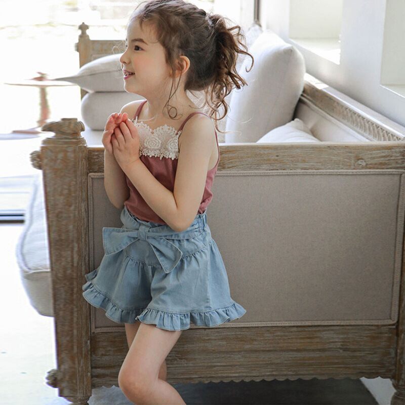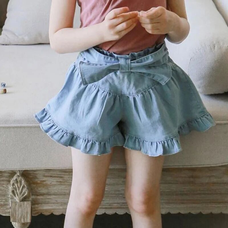 재고 2024 여름 여자 데님 반바지 달콤한 큰 활 공주 아기 culottes Ruffled 치마스토어 가기