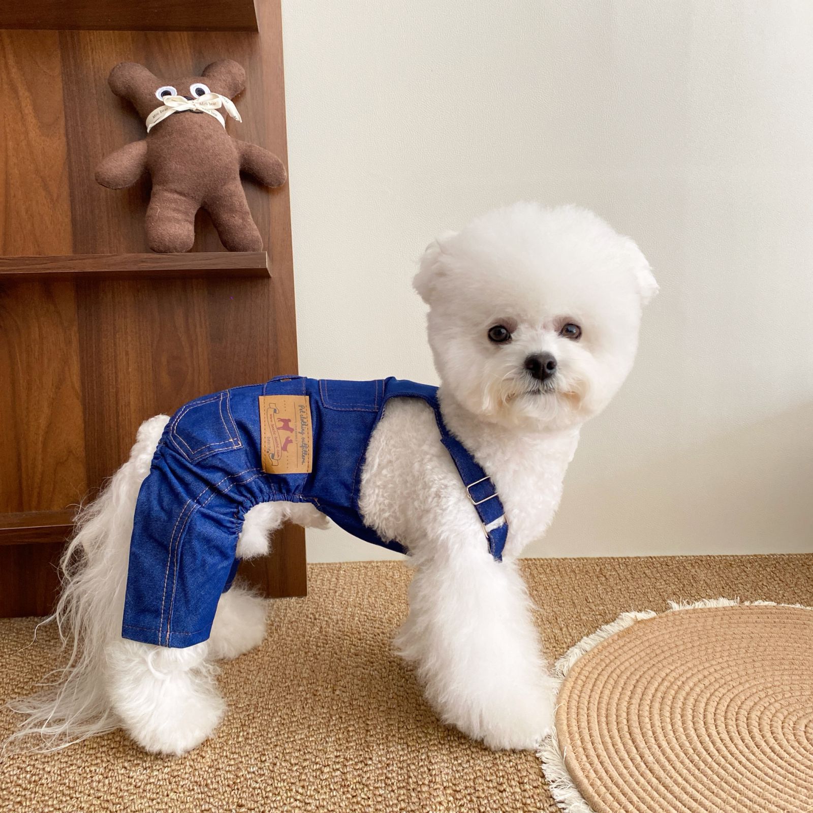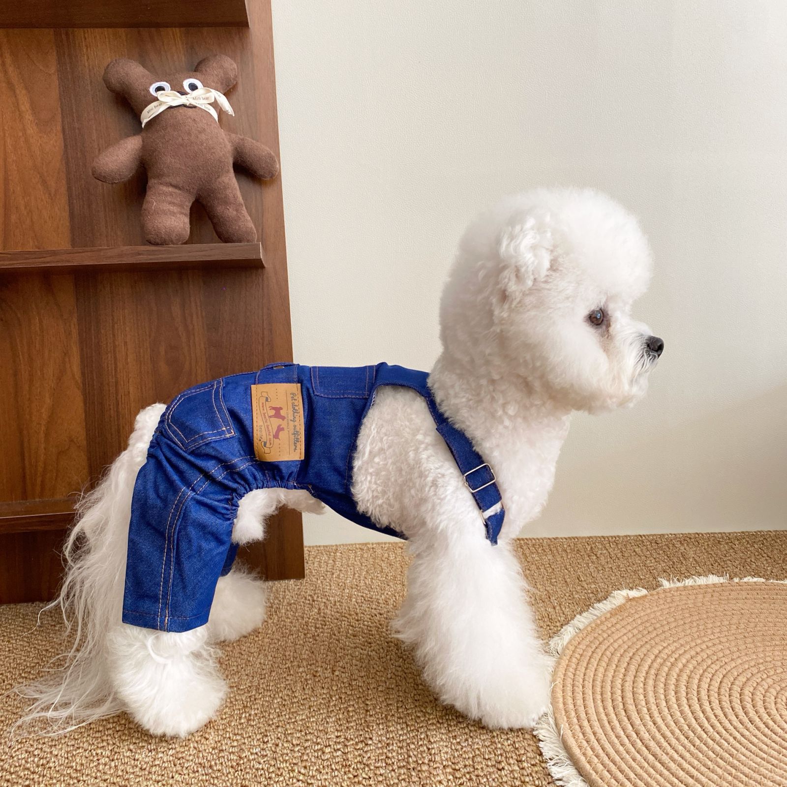 애완 동물 의류 개 옷 스트랩 데님 바지 세탁 방지 진짜 데님 직물 테디 슈너리 곰스토어 가기