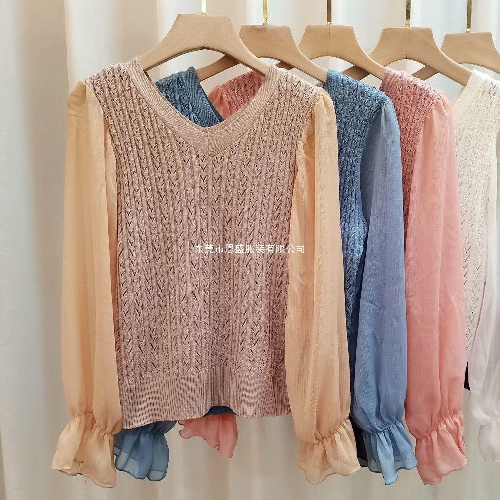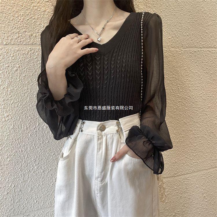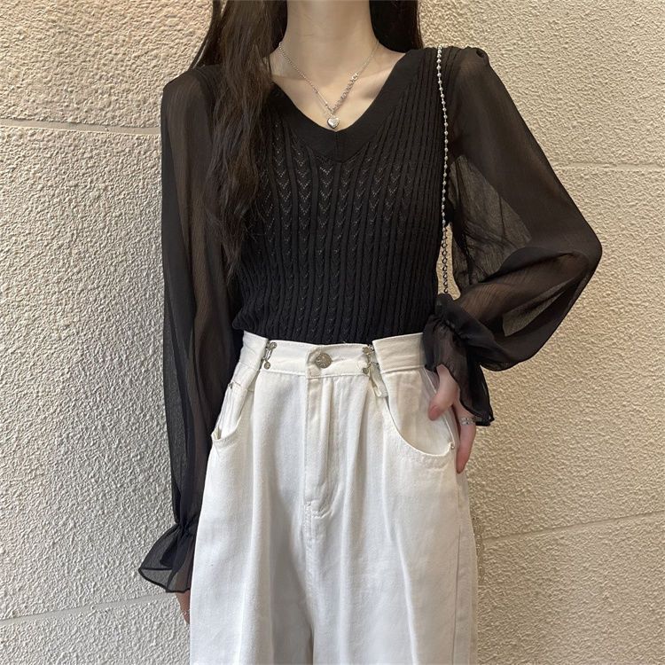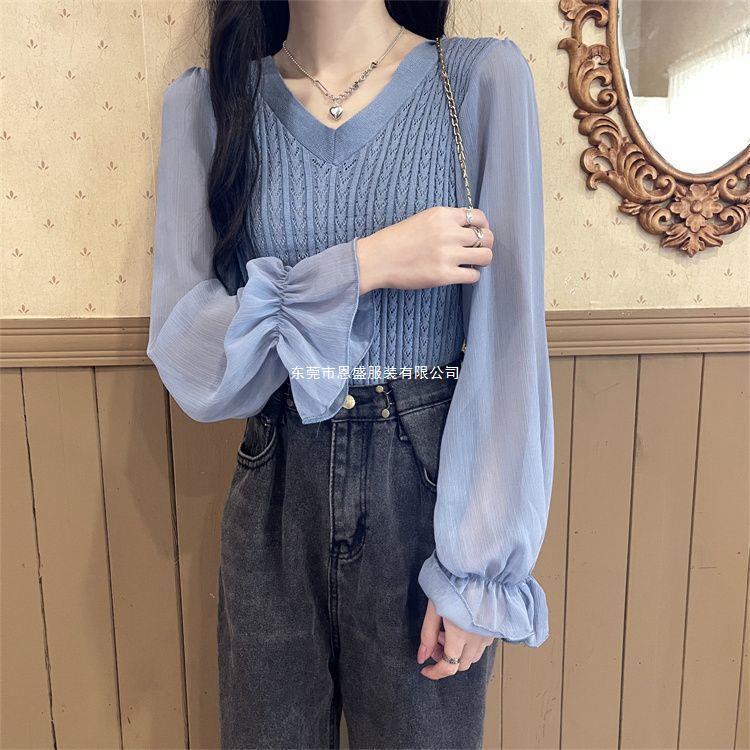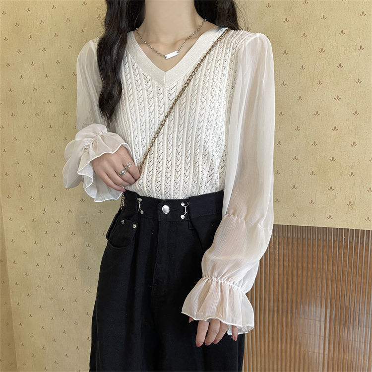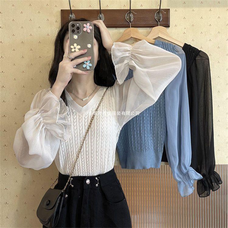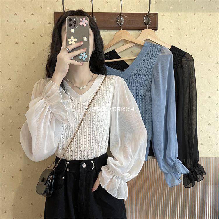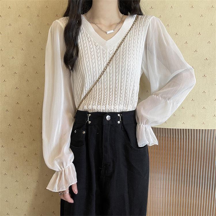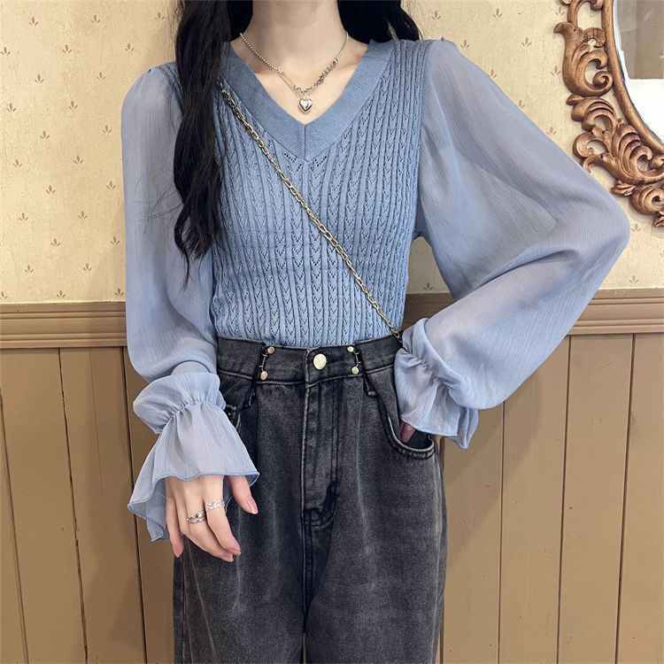시폰 스플라이스 벨 슬리브 v 넥 2024 가을 여성용 니트 스웨터 얇은 한국 스타일 슬리밍 바닥 셔츠스토어 가기